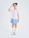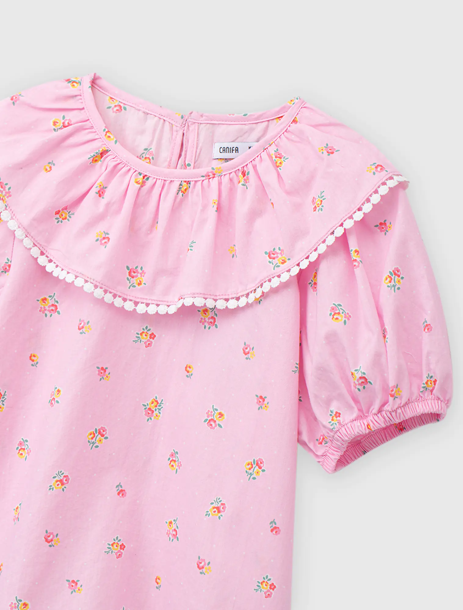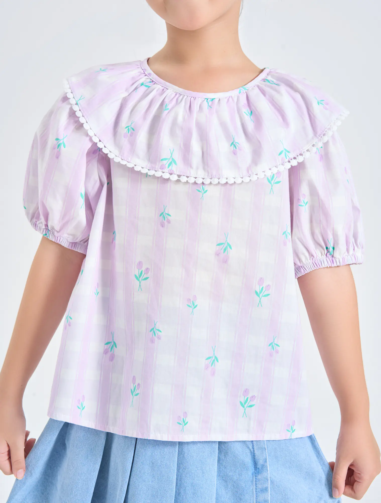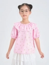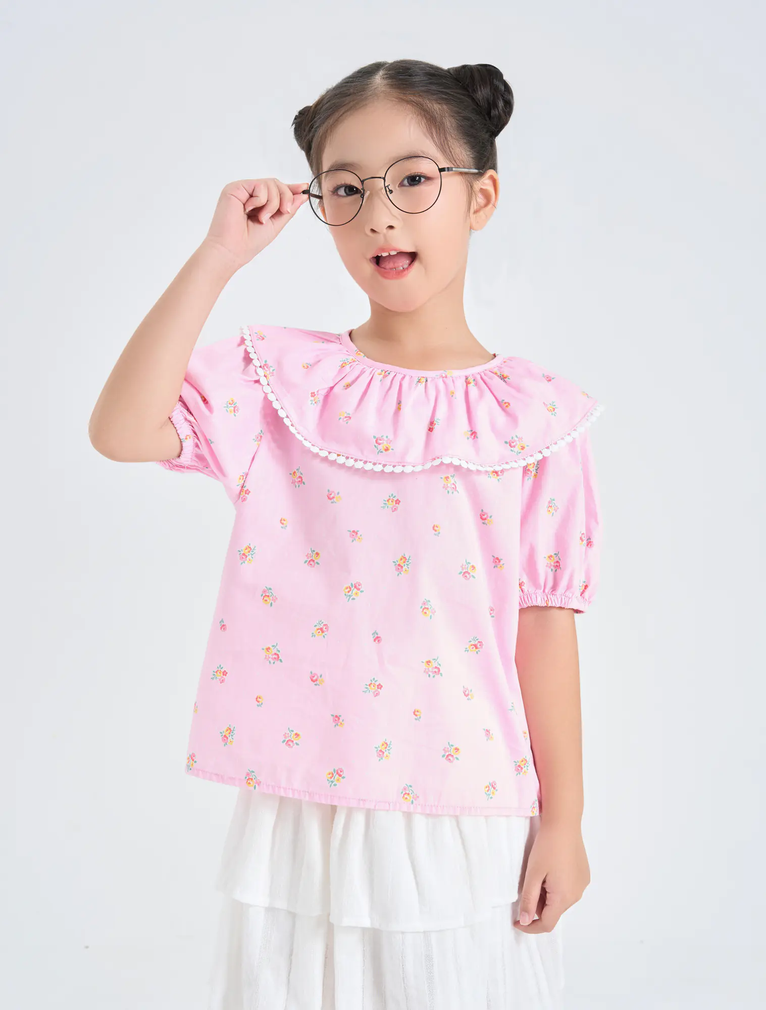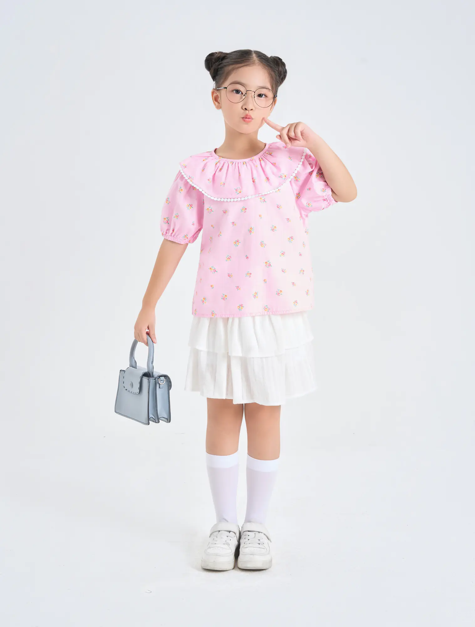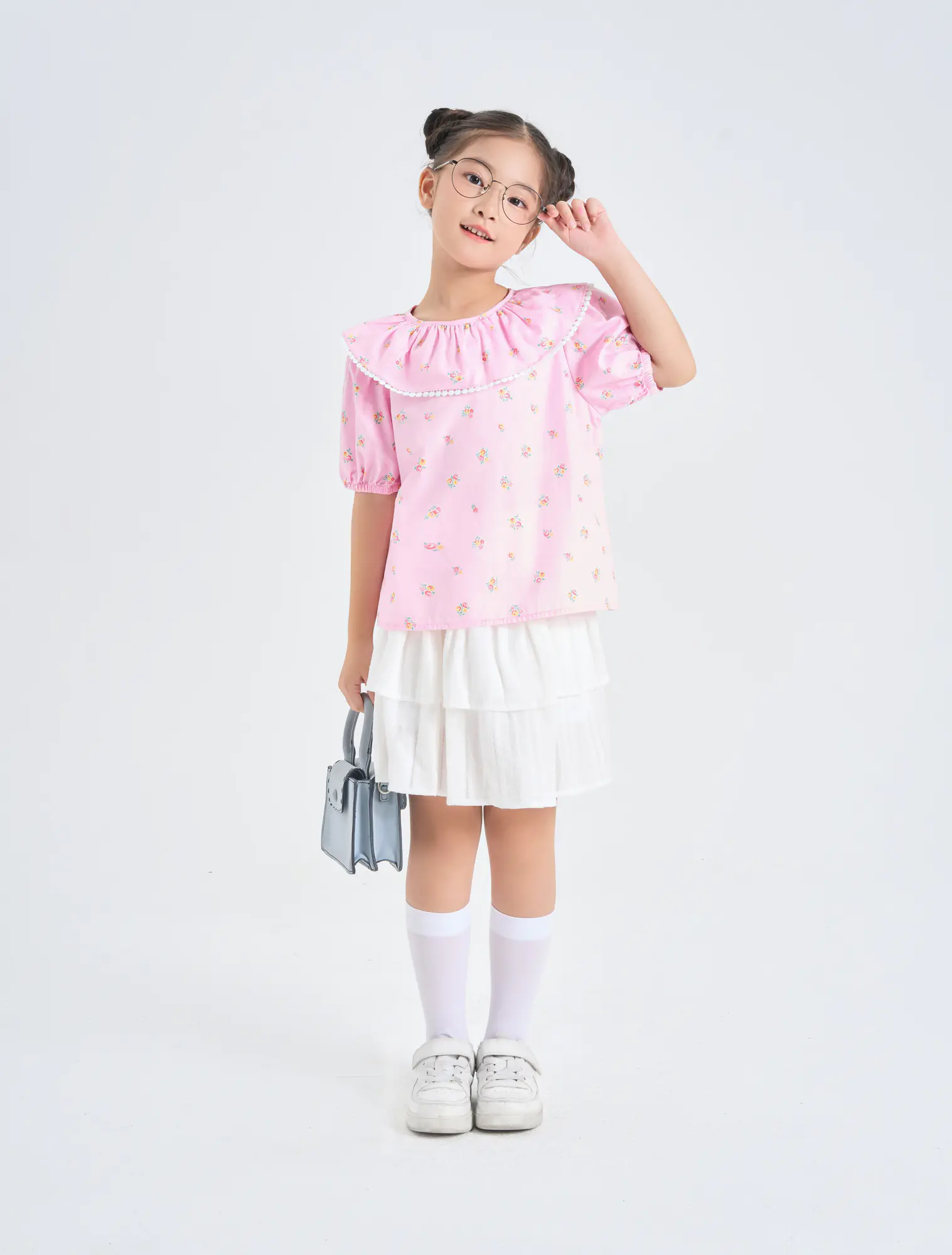 Áo kiểu bé gái với bèo trước ngực tạo sự nữ tính, phù hợp phối với nhiều loại trang phục cho bé gái.