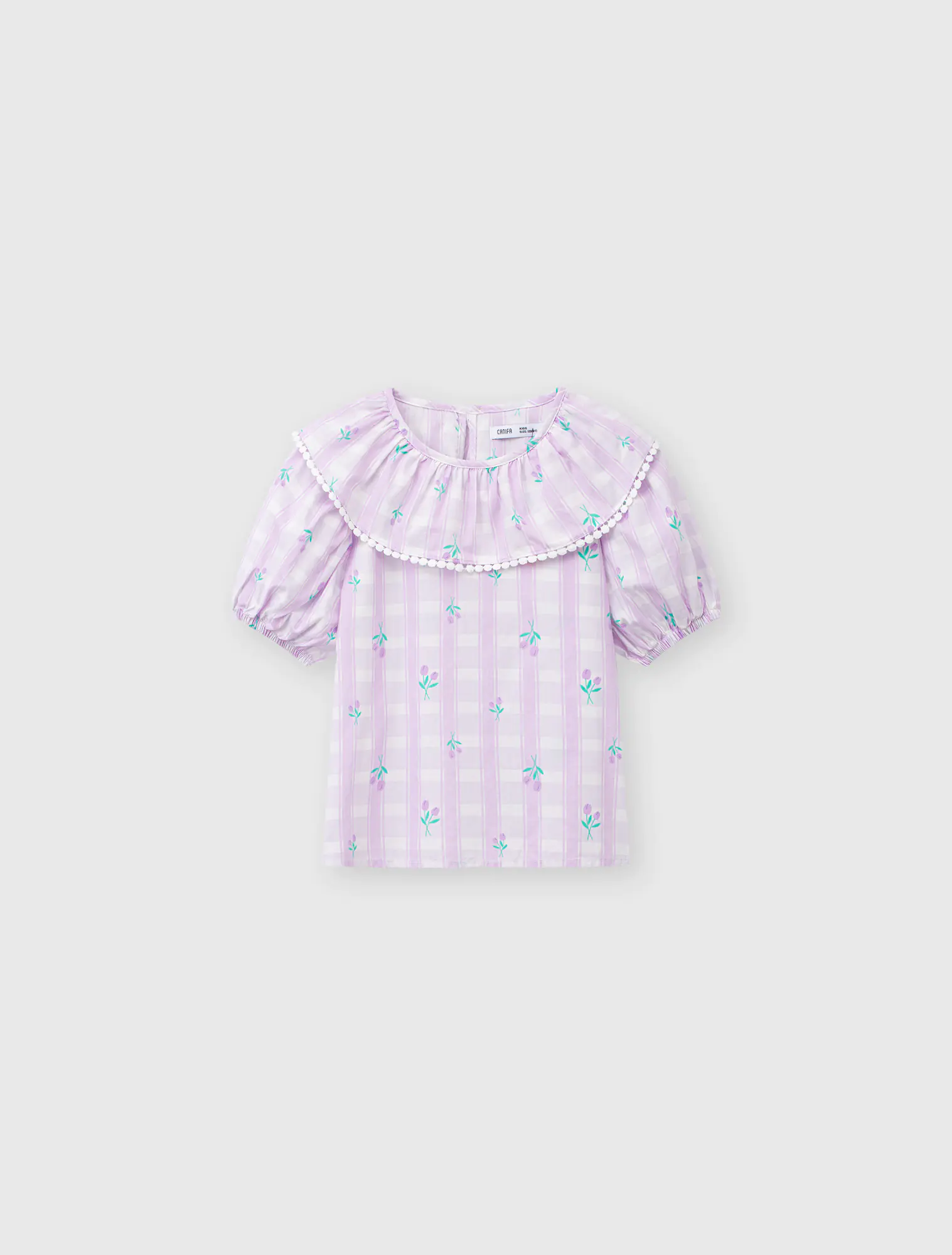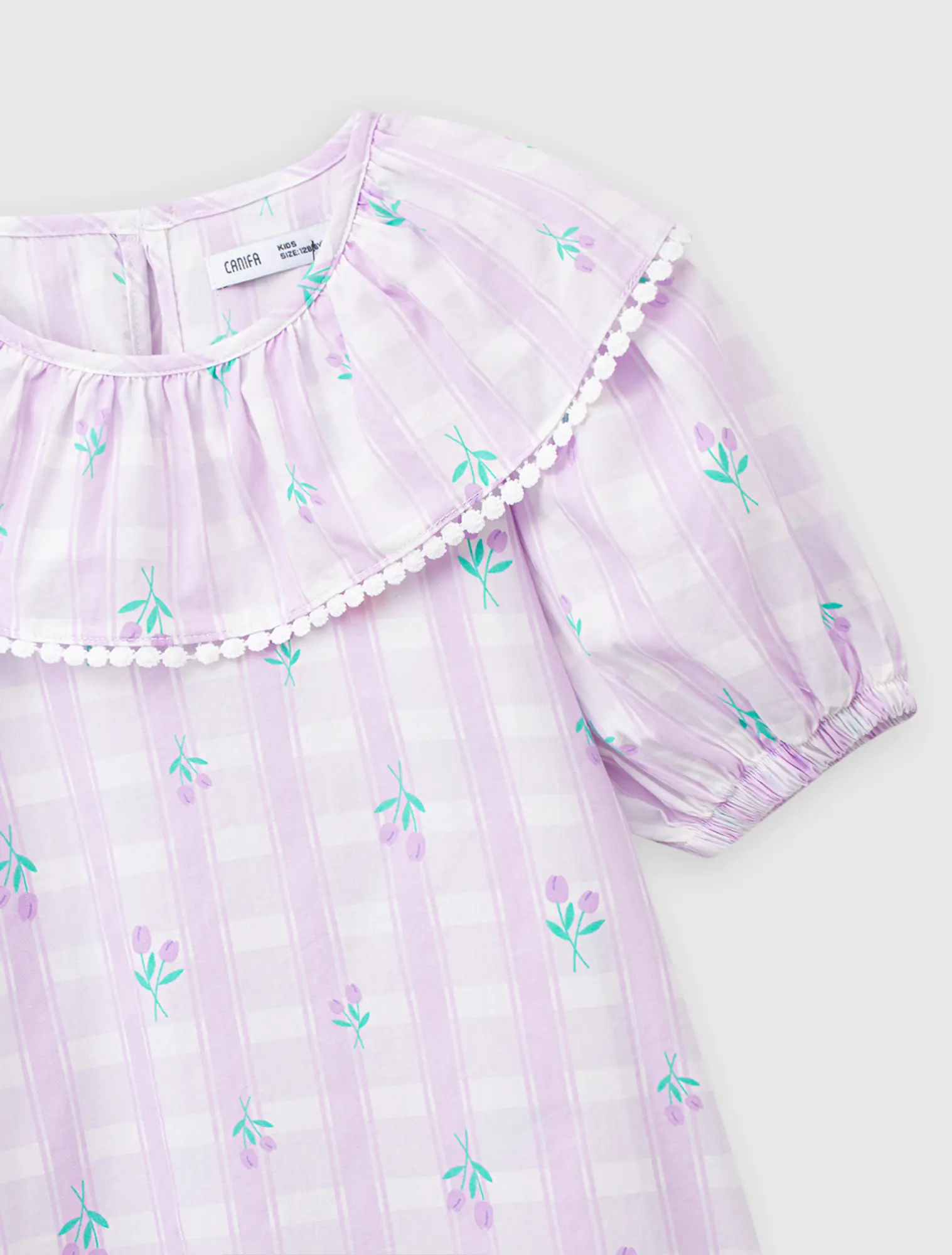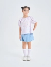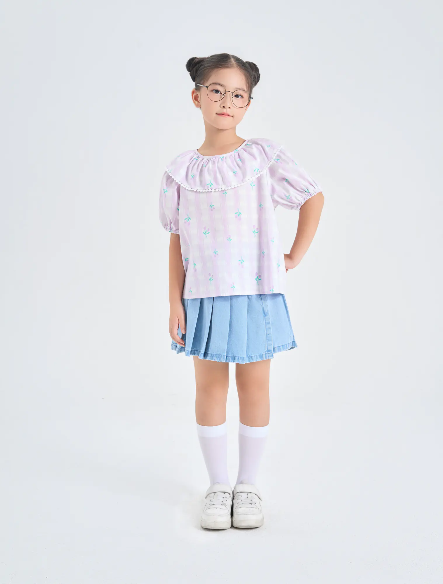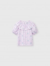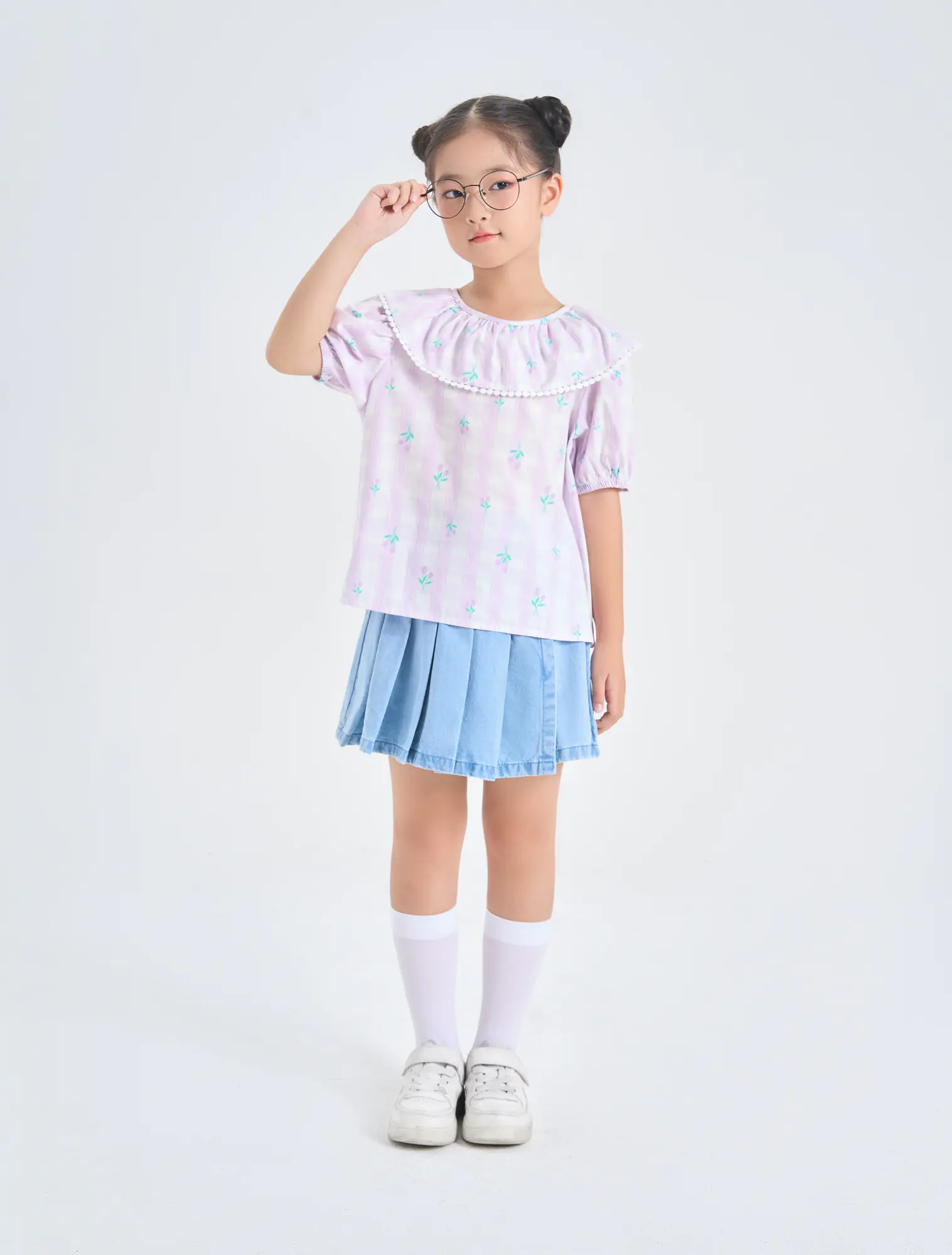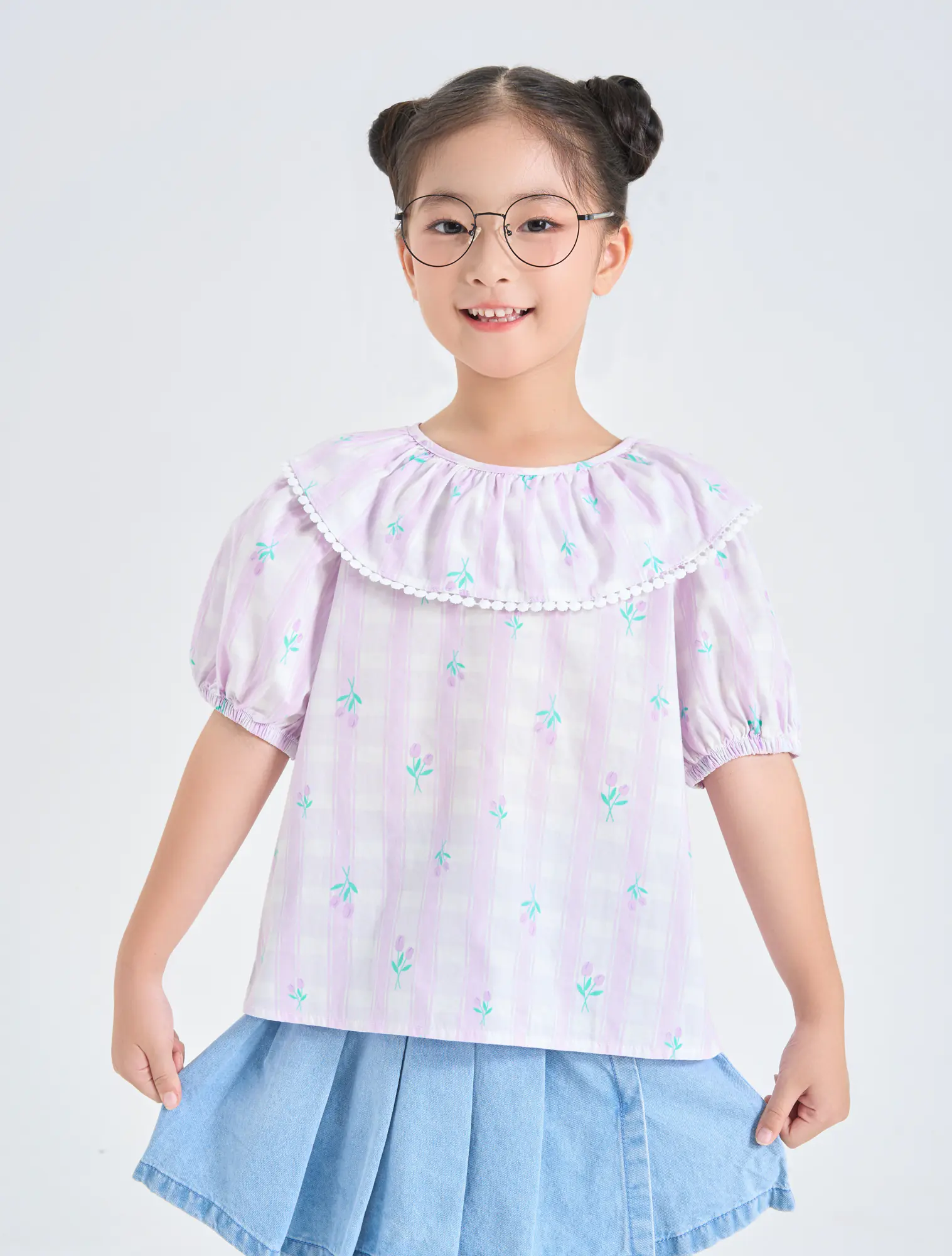 Áo kiểu bé gái với bèo trước ngực tạo sự nữ tính, phù hợp phối với nhiều loại trang phục cho bé gái.