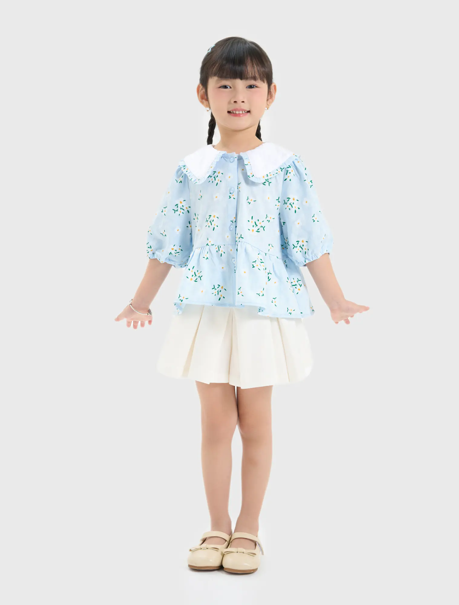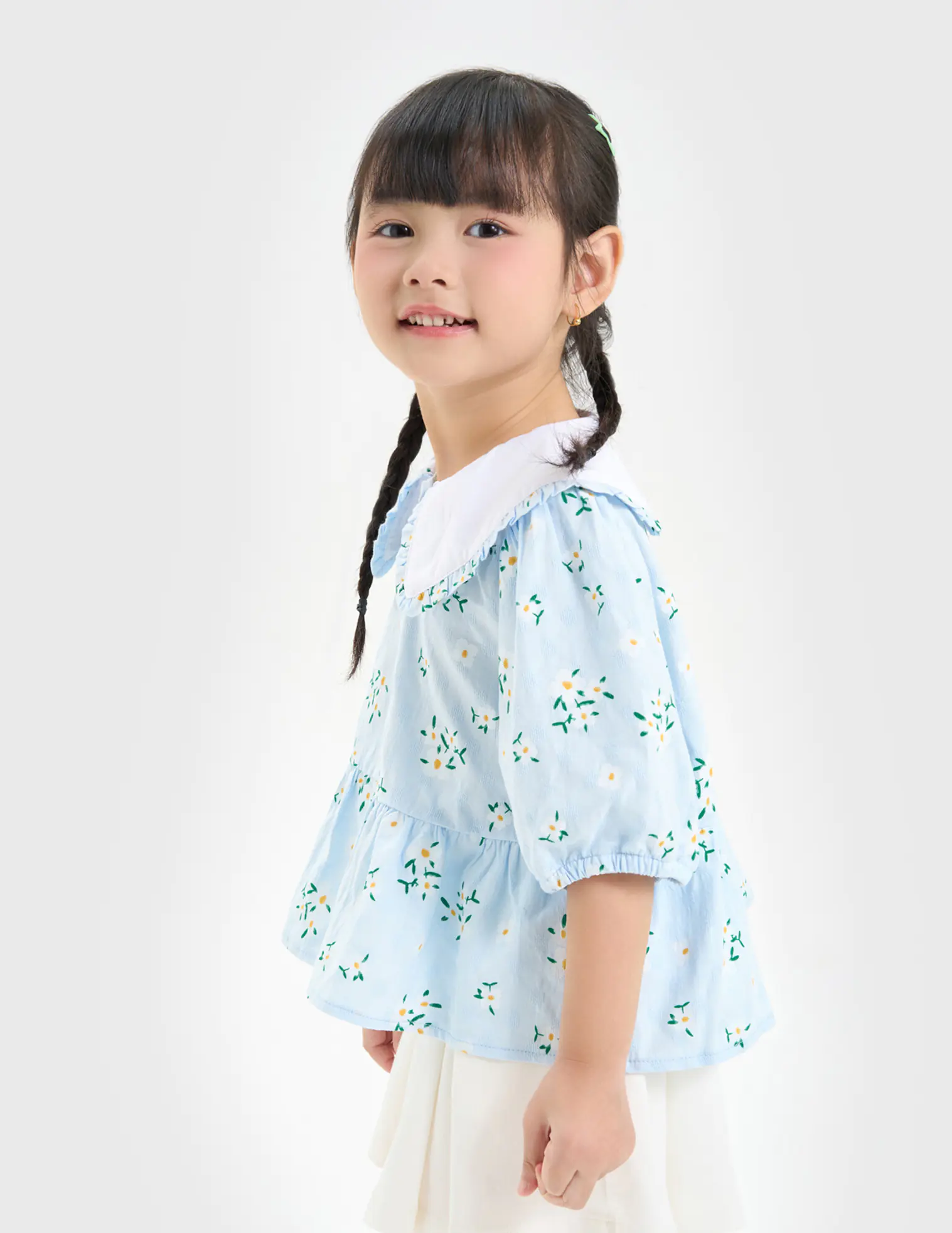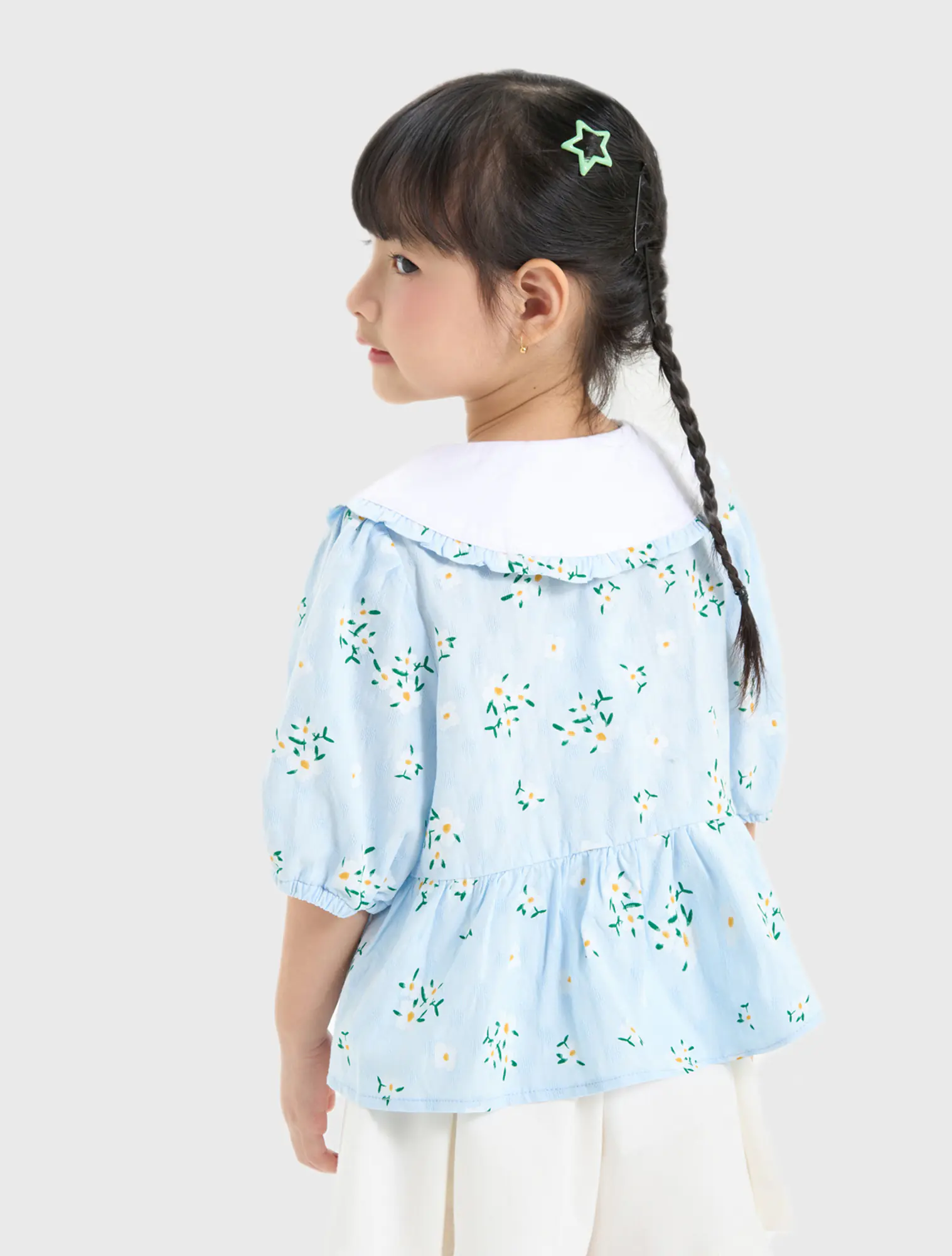 Áo kiểu bé gái hoạ tiết có bản bèo cổ mềm mại nữ tính, dễ kết hợp với nhiều loại sản phẩm. Phù hợp với các bé gái thích sự nữ tính.