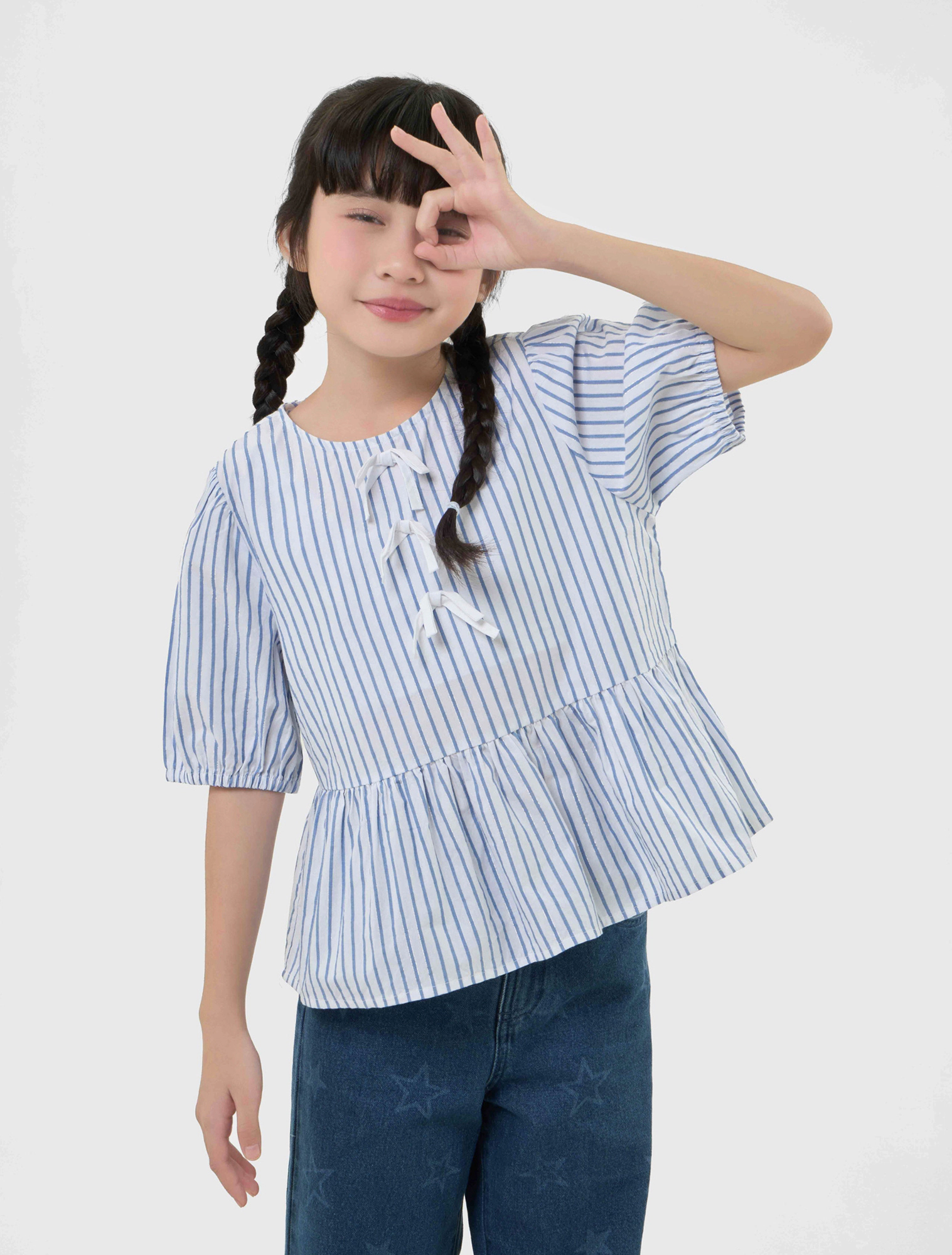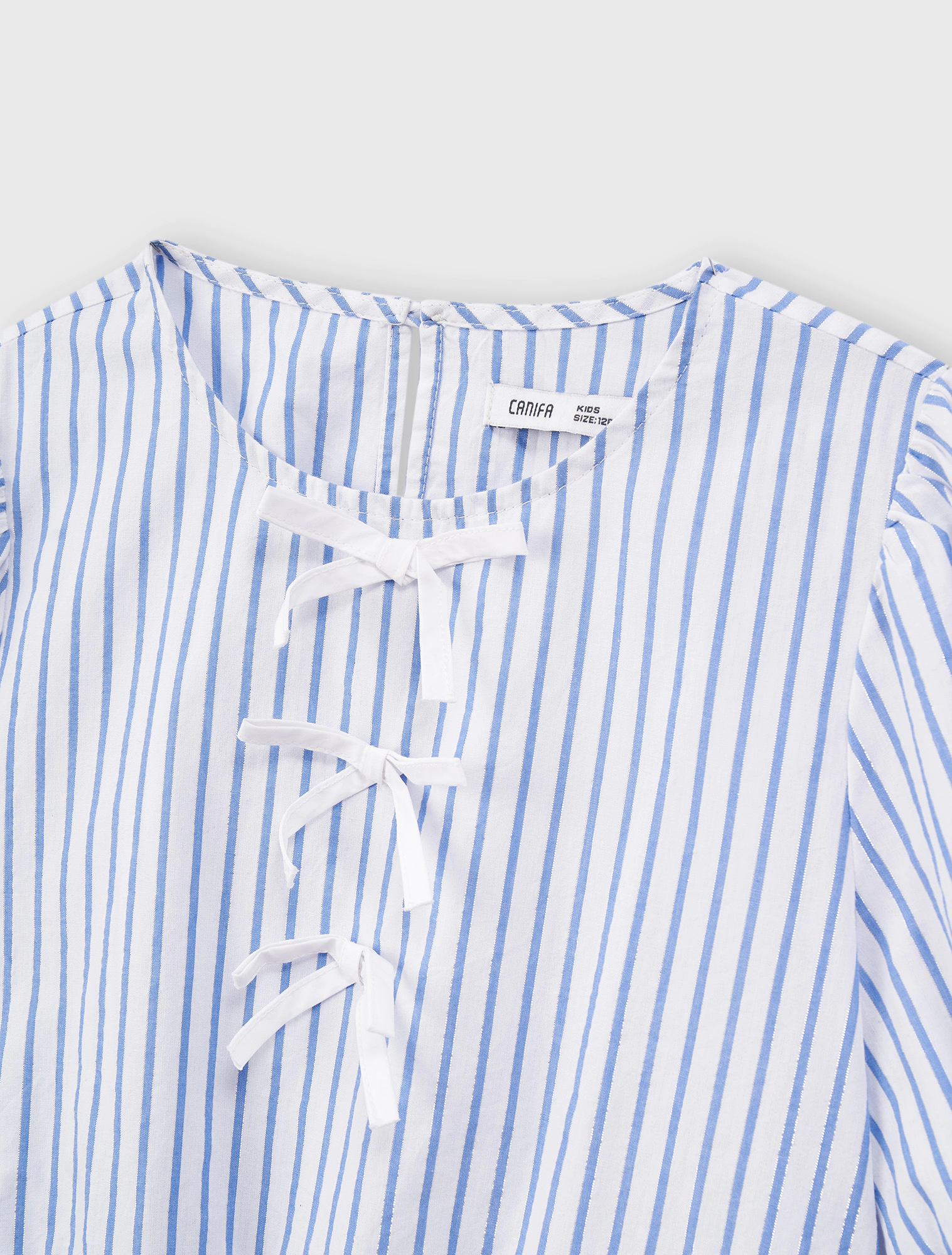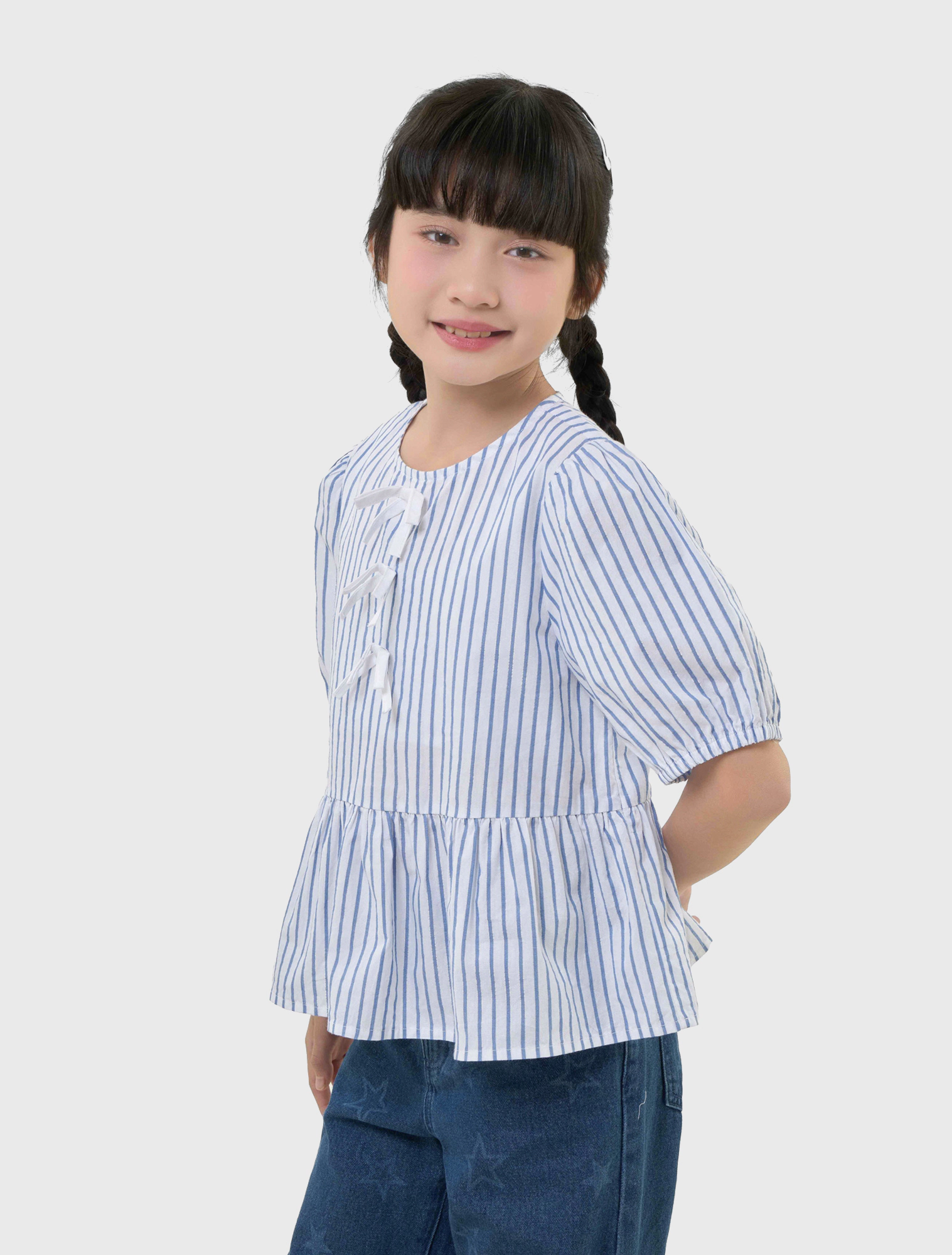 Áo kiểu bé gái đính nơ, có chi tiết nơ ở ngực mang đến sự nữ tính.