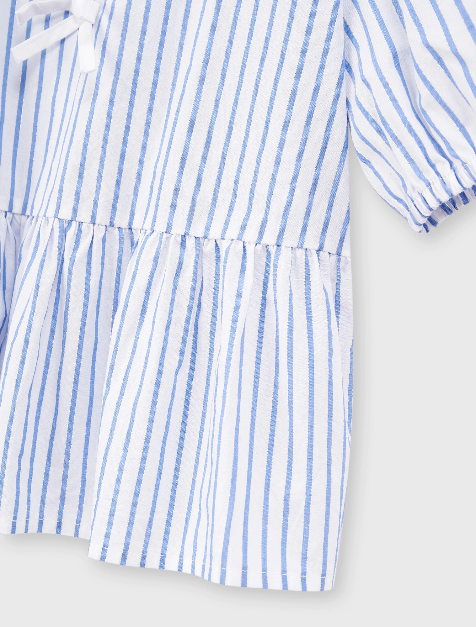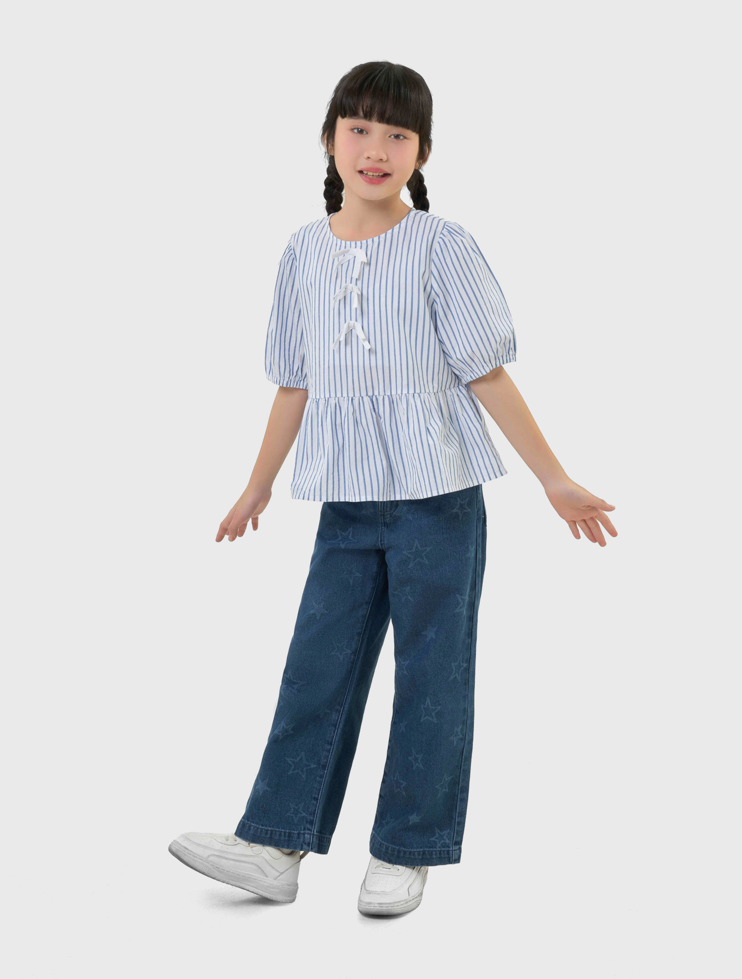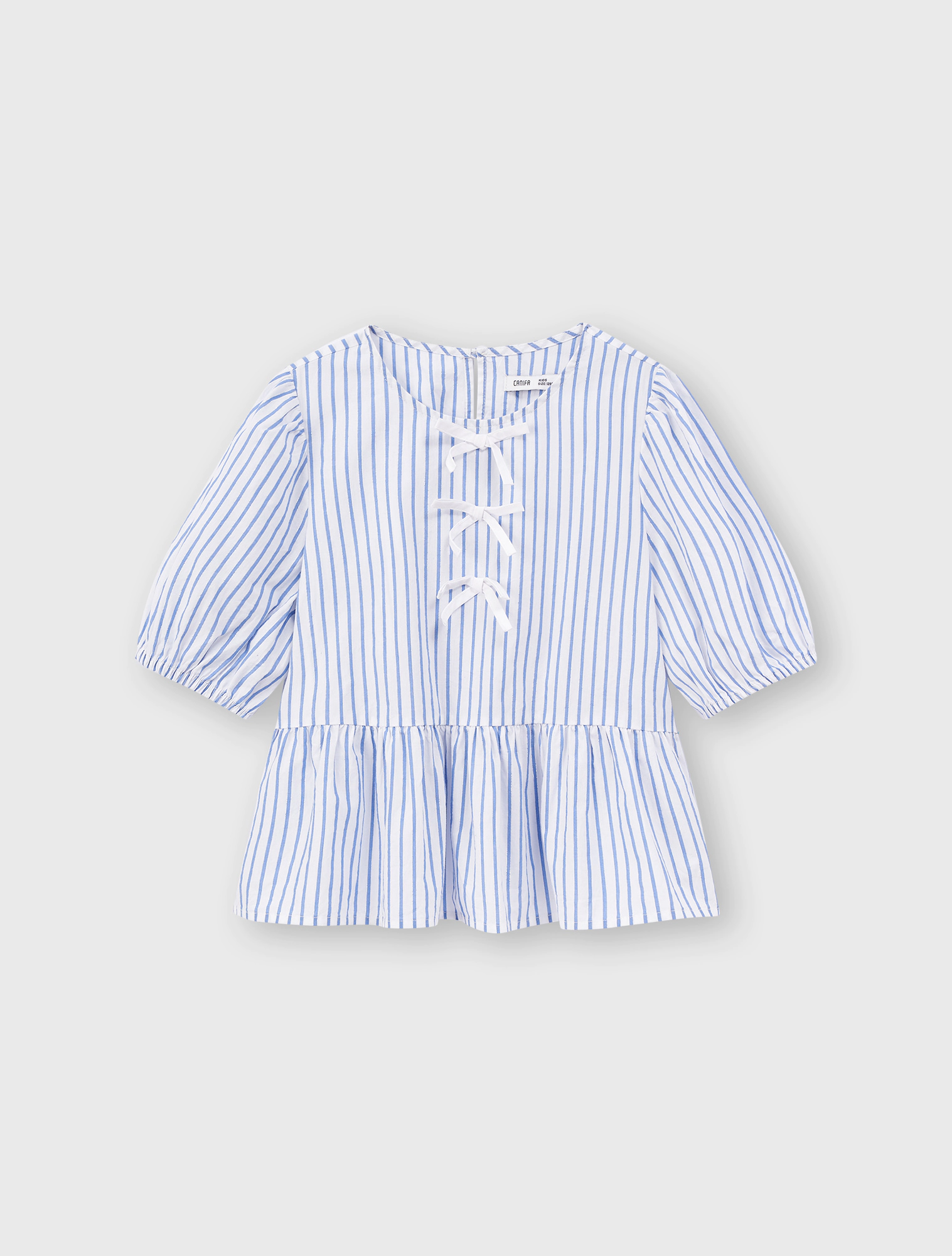 Áo kiểu bé gái đính nơ, có chi tiết nơ ở ngực mang đến sự nữ tính.