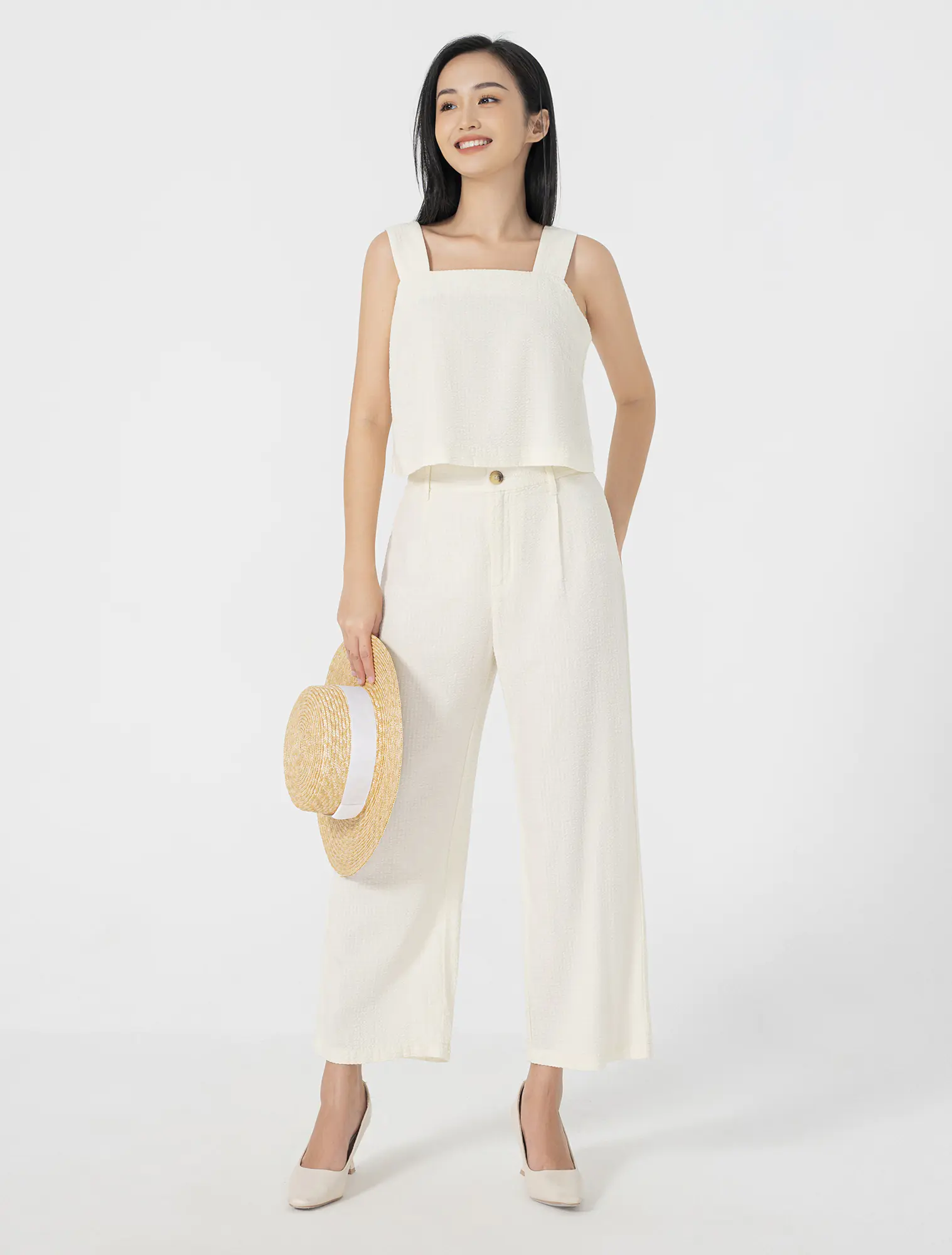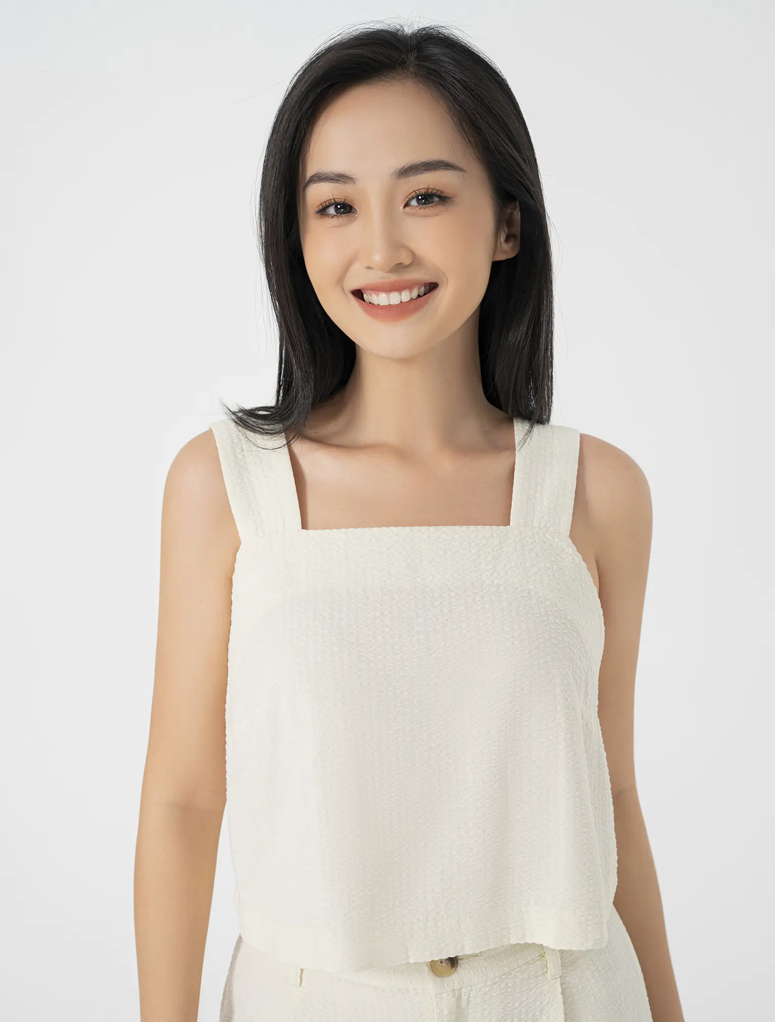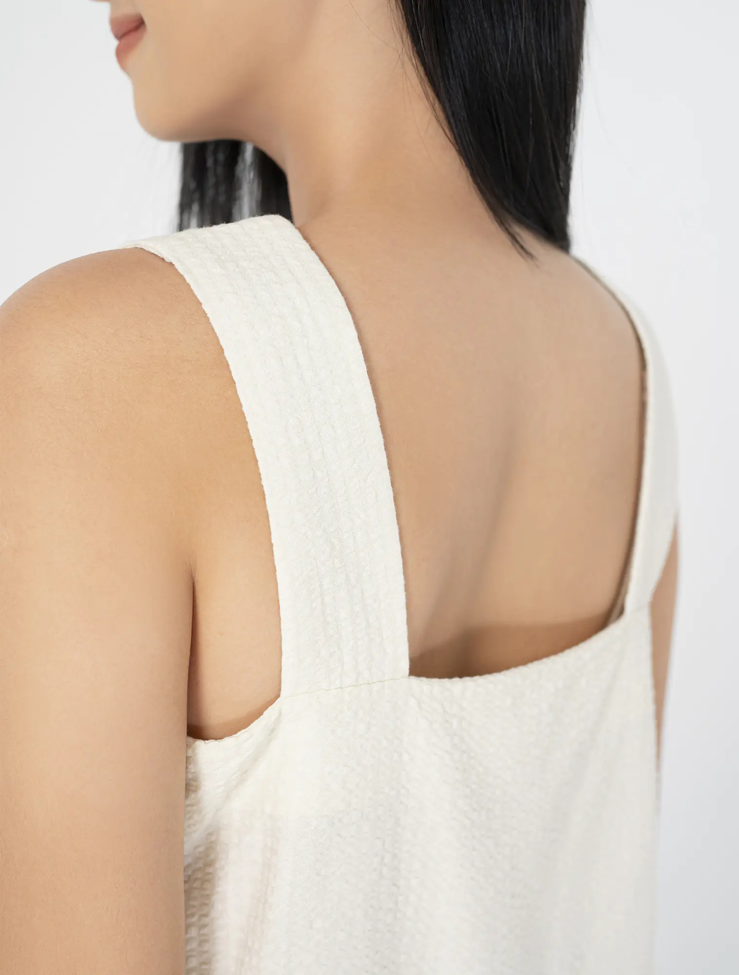 Áo hai dây bản to, cổ vuông. Chất liệu cotton pha rayon mềm mại.