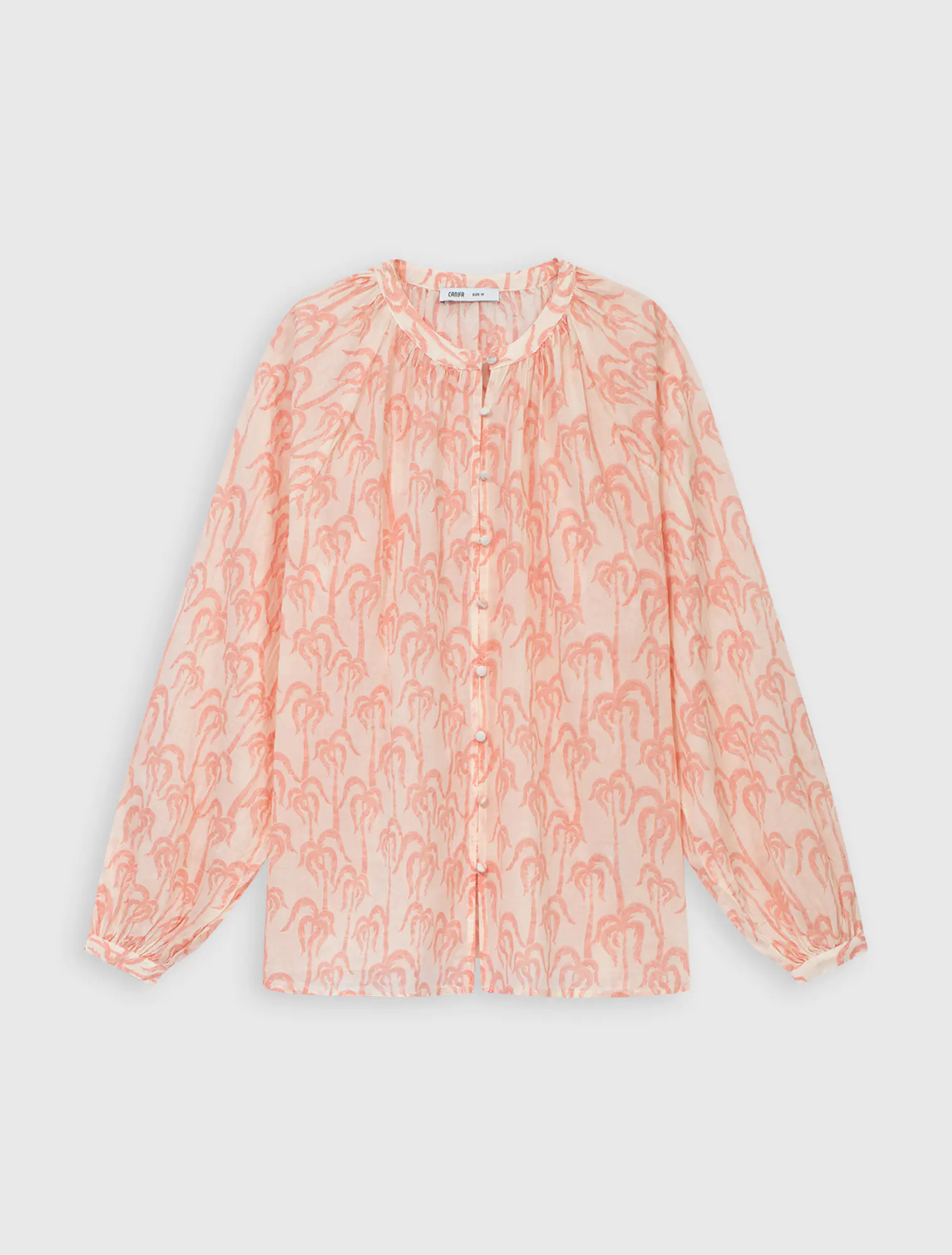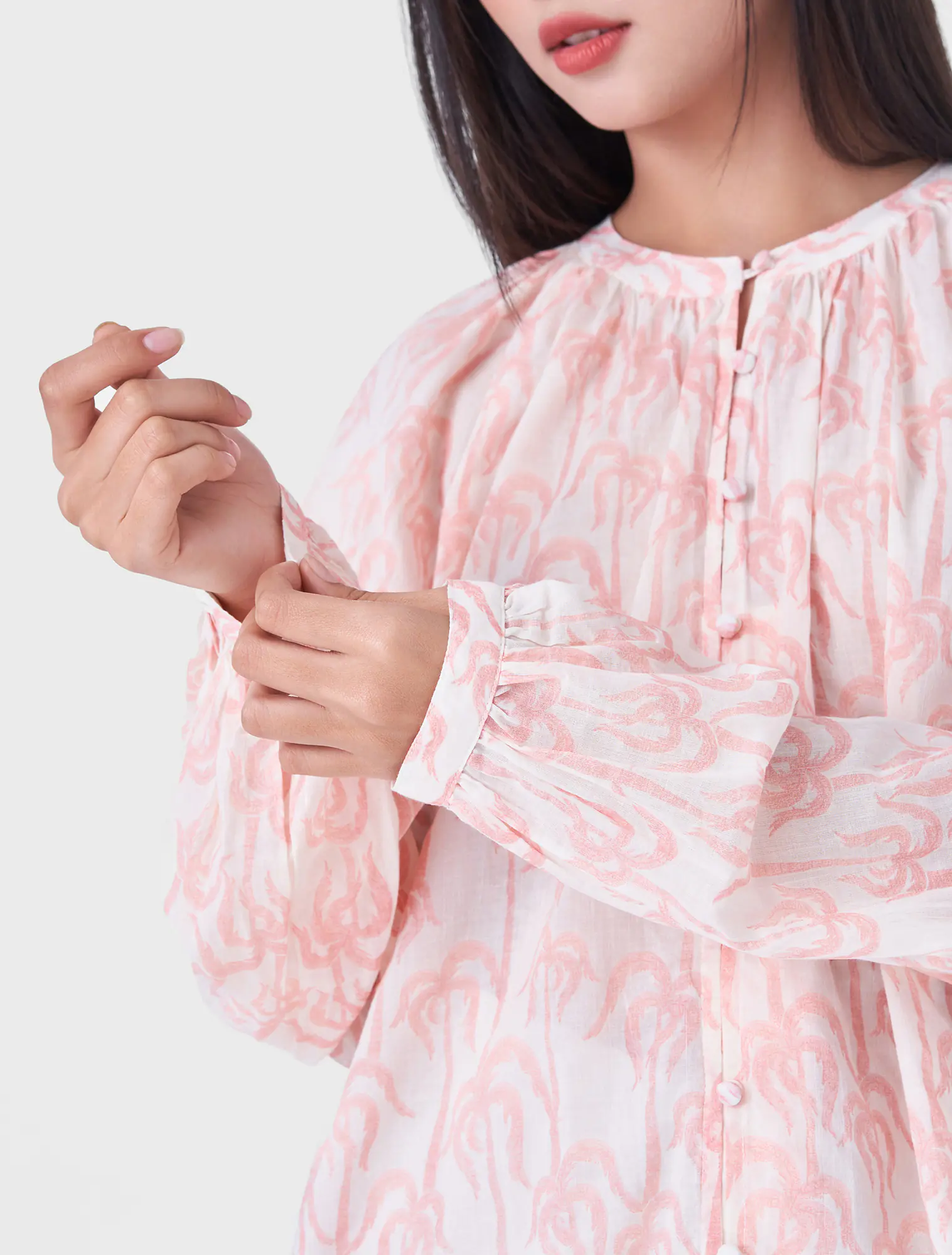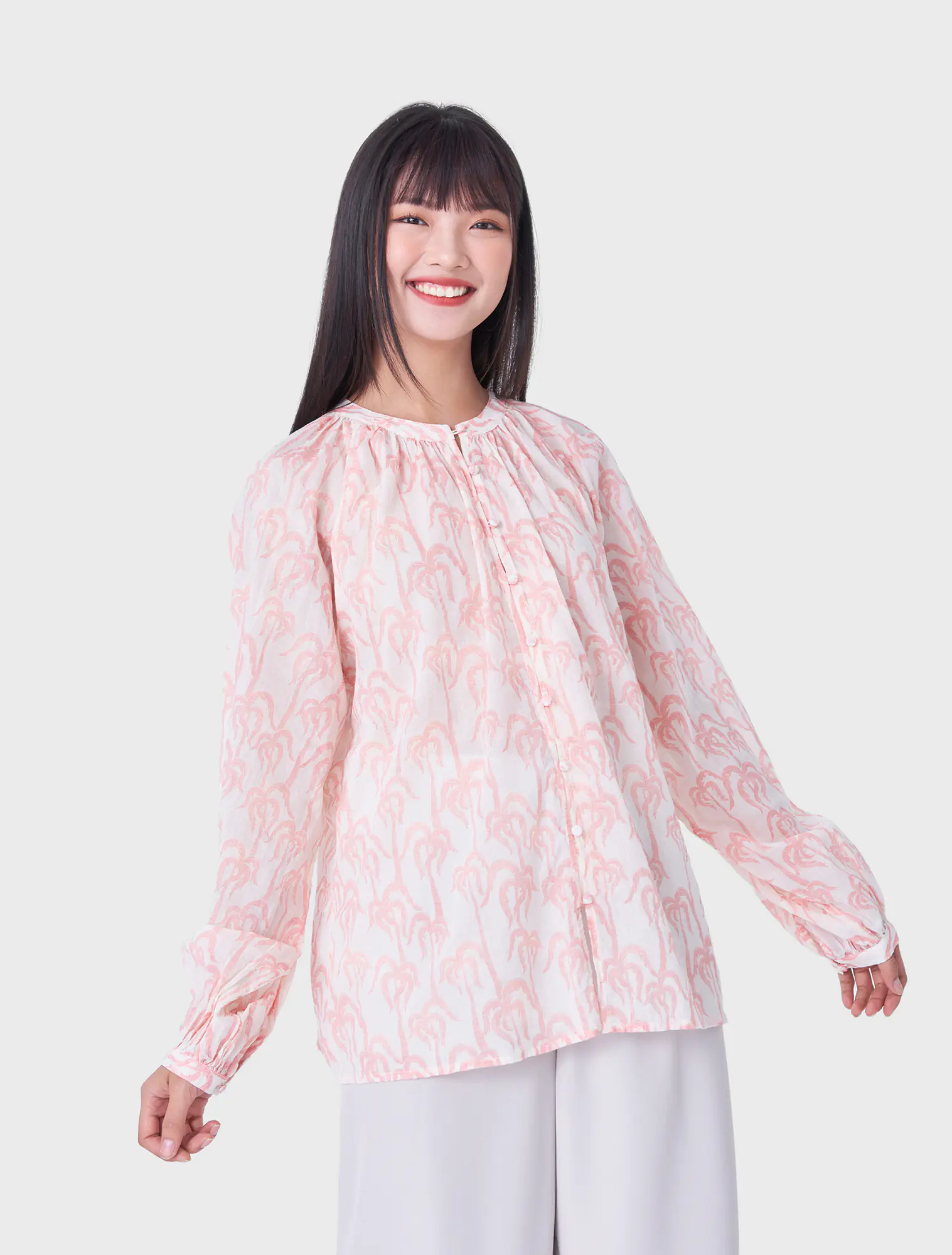 Áo kiểu chất liệu 100% cotton, cổ V mở cúc, tay phồng.