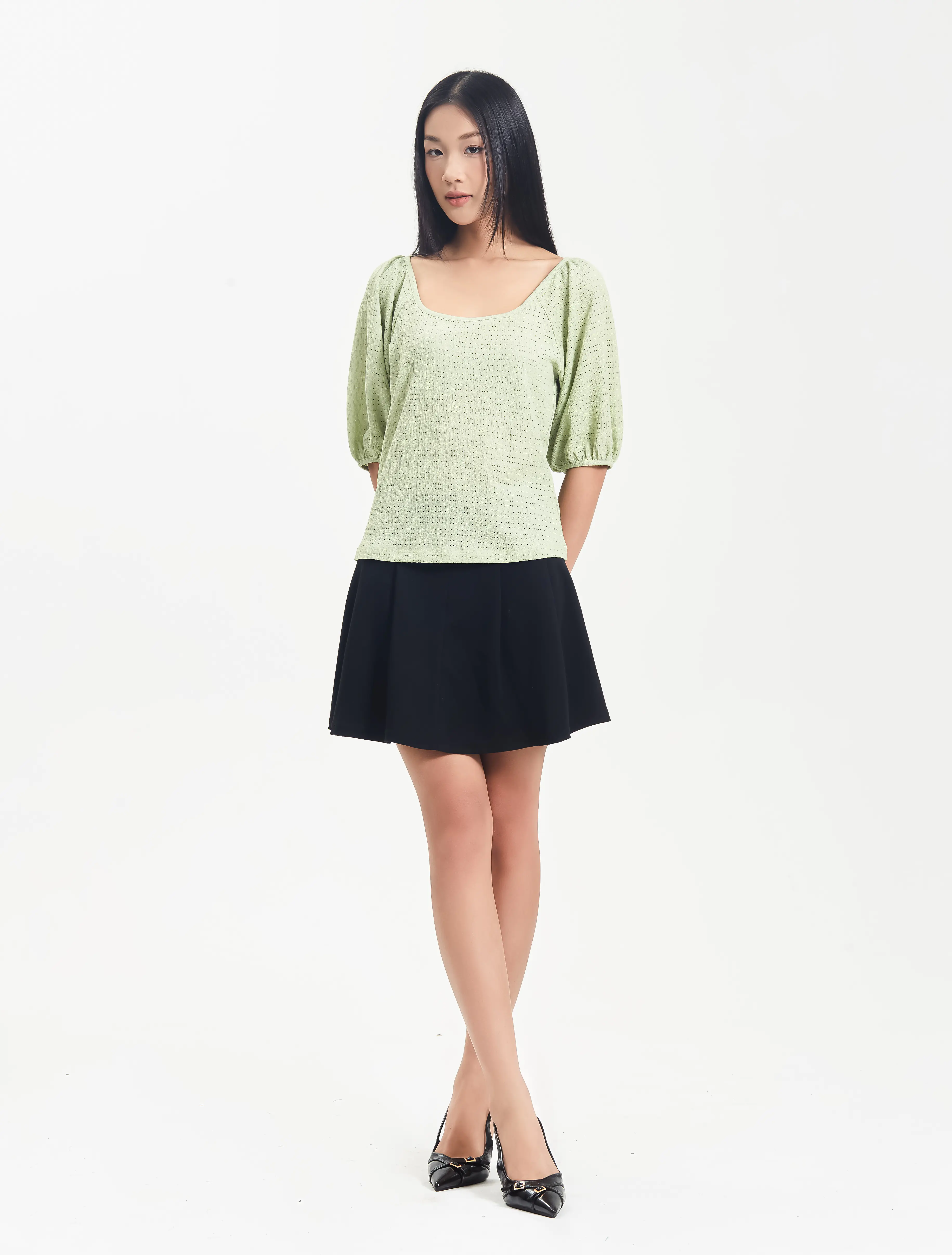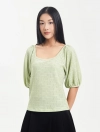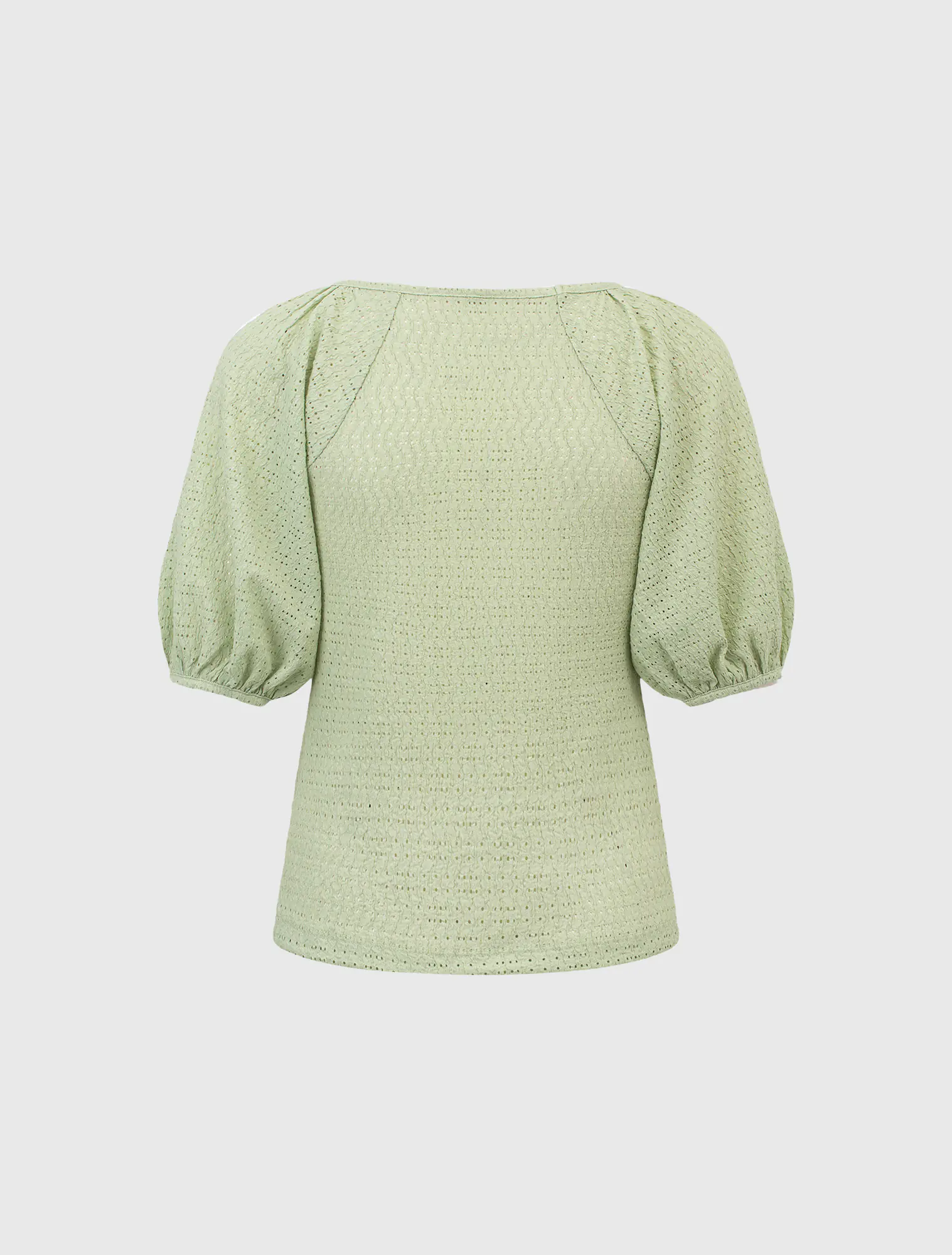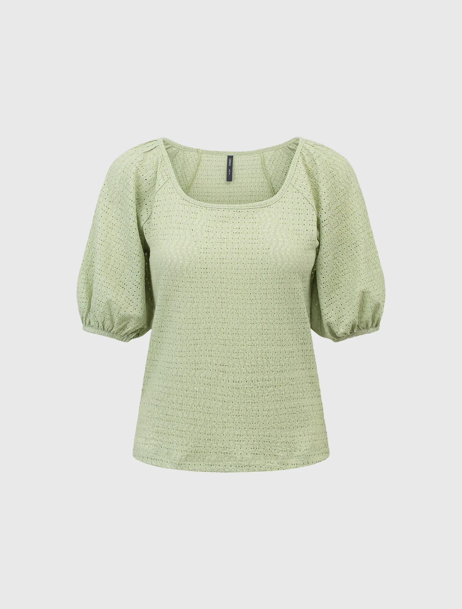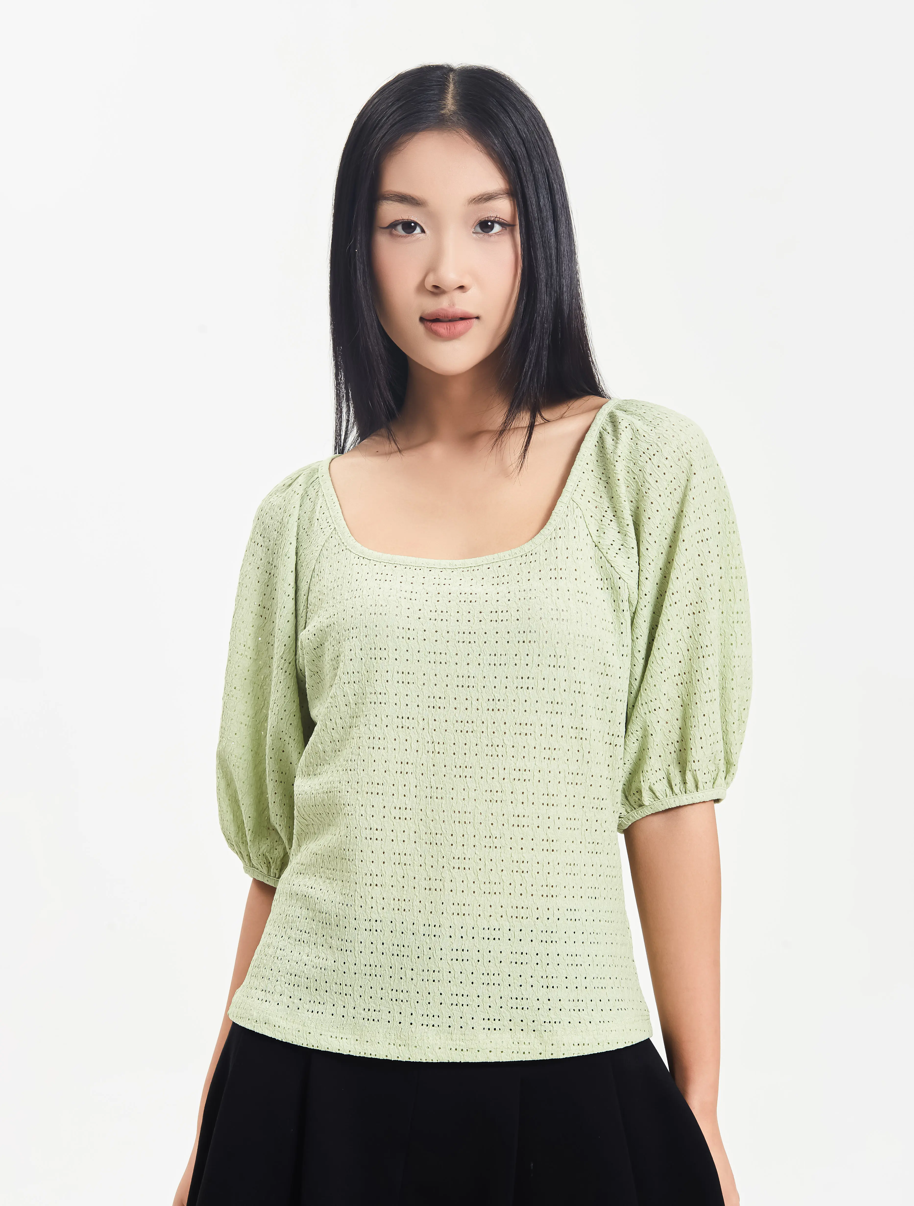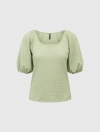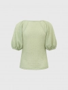 Áo kiểu nữ với điểm nhấn là kết cấu bề mặt của vải dệt họa tiết kết hợp với dáng áo tay bồng và cổ áo cách điệu làm nên sản phẩm mềm mại nữ tính, dễ kết hợp với nhiều loại sản phẩm khác như chân váy, quần jeans...