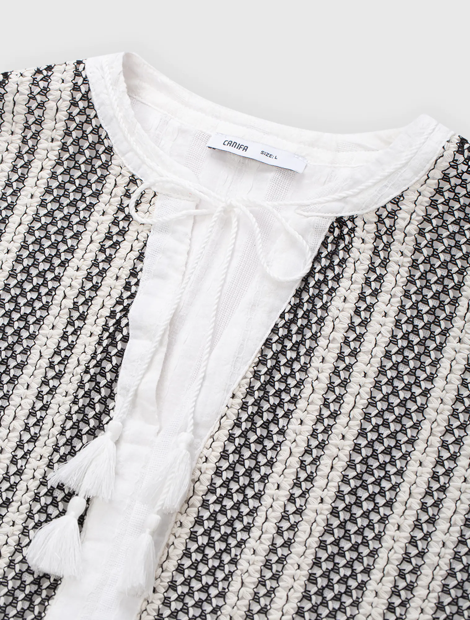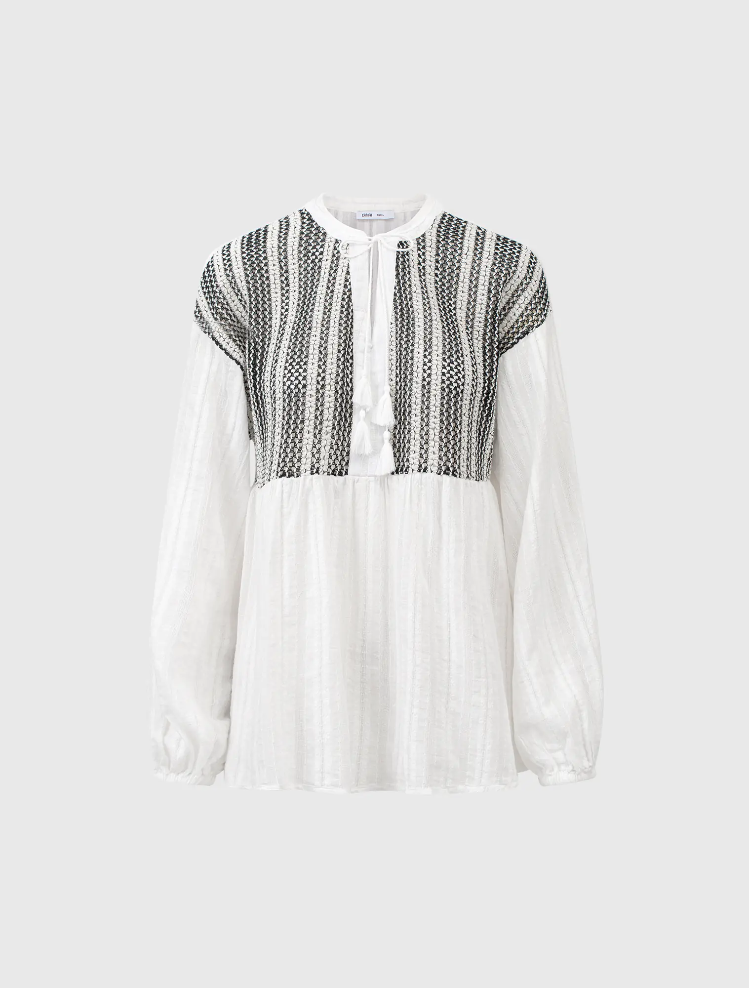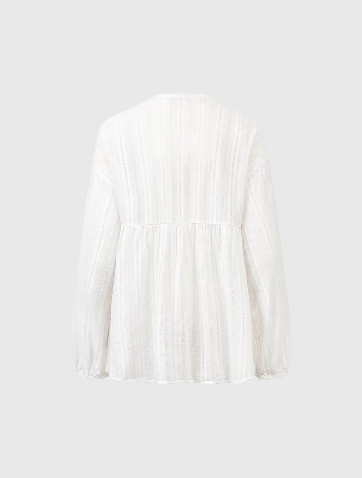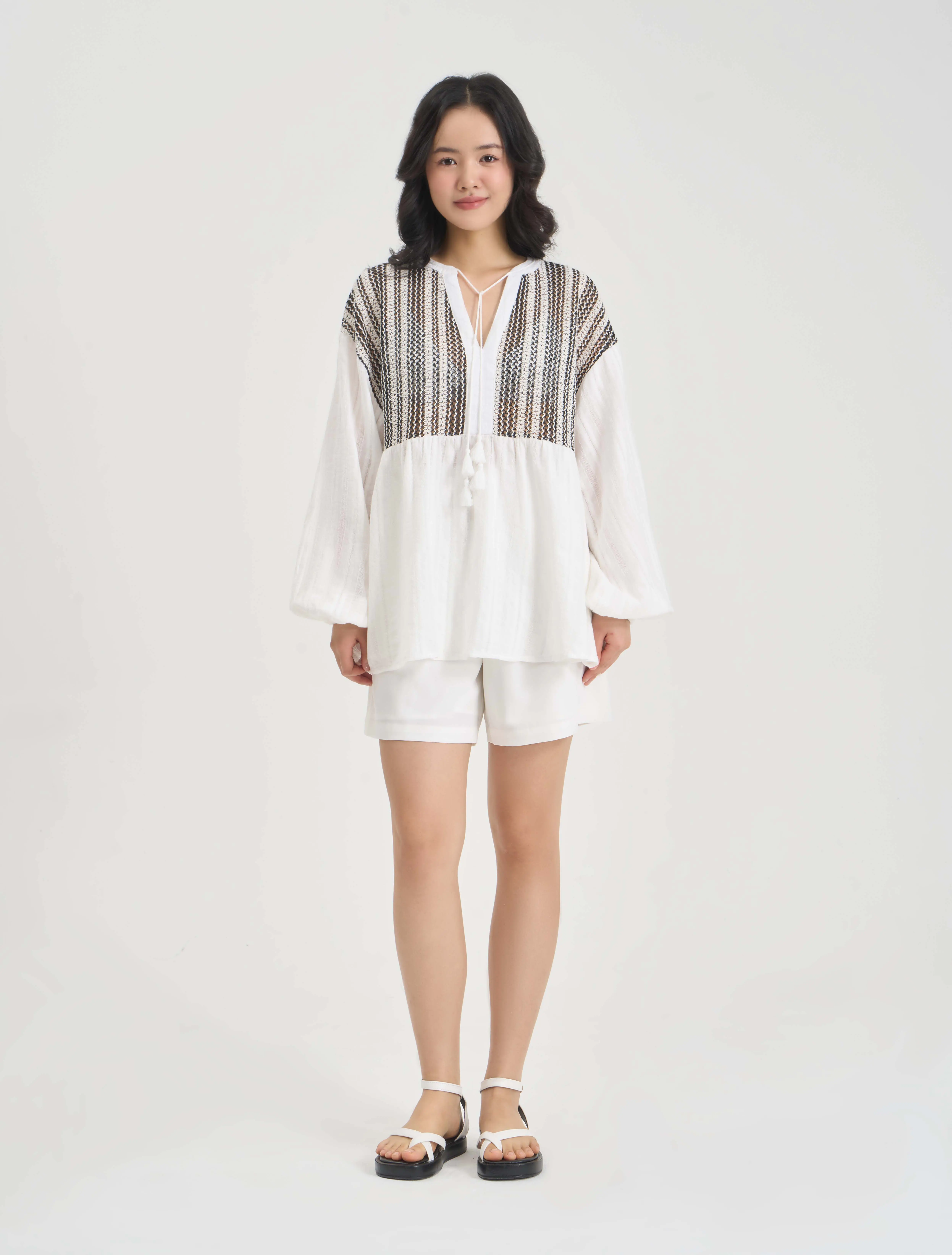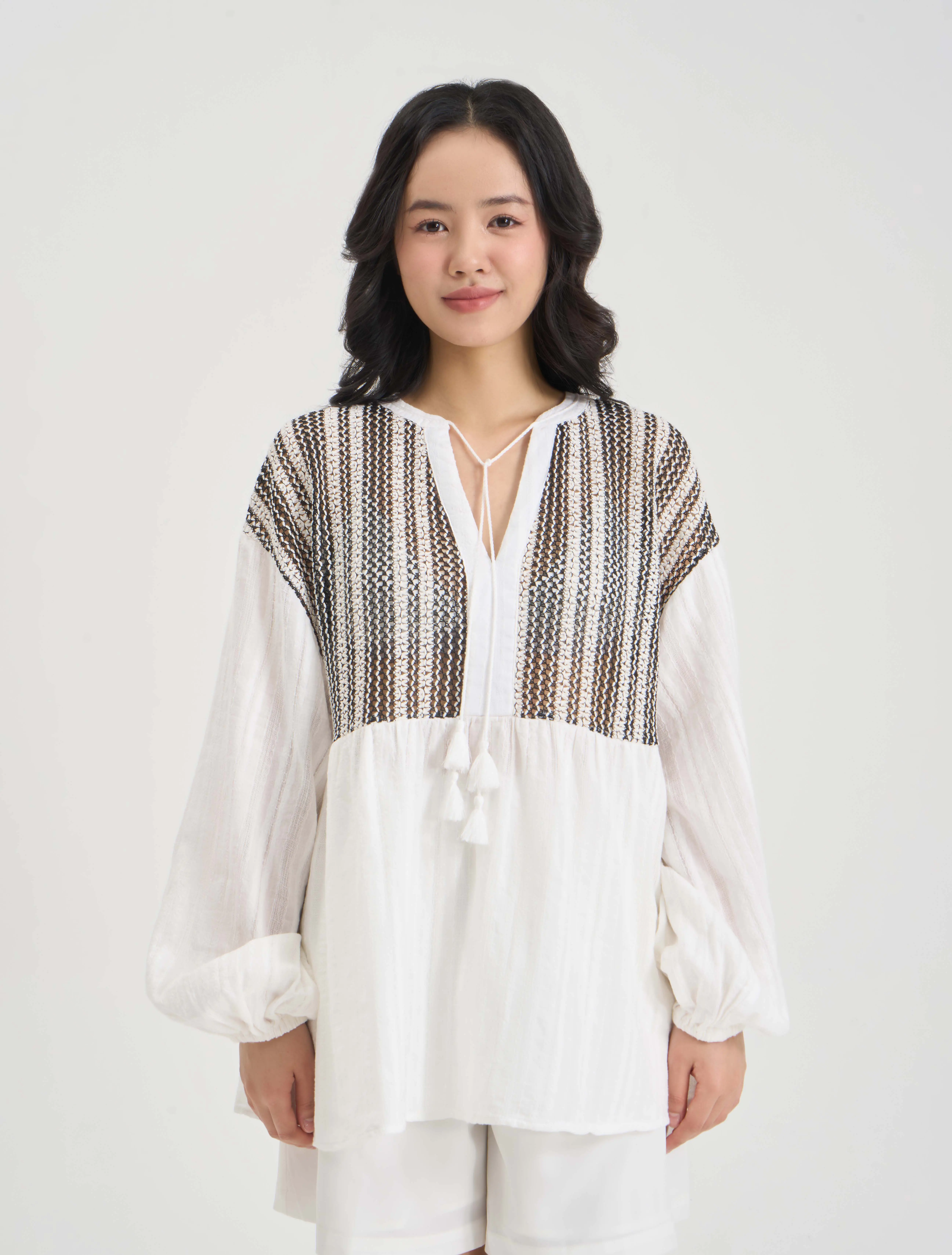 Áo kiểu nữ dáng babydoll, phom dáng rộng vừa, chất liệu cotton thoáng mát, phối họa tiết ren thêu phù hợp với mùa hè, đi chơi, dạo phố, du lịch.