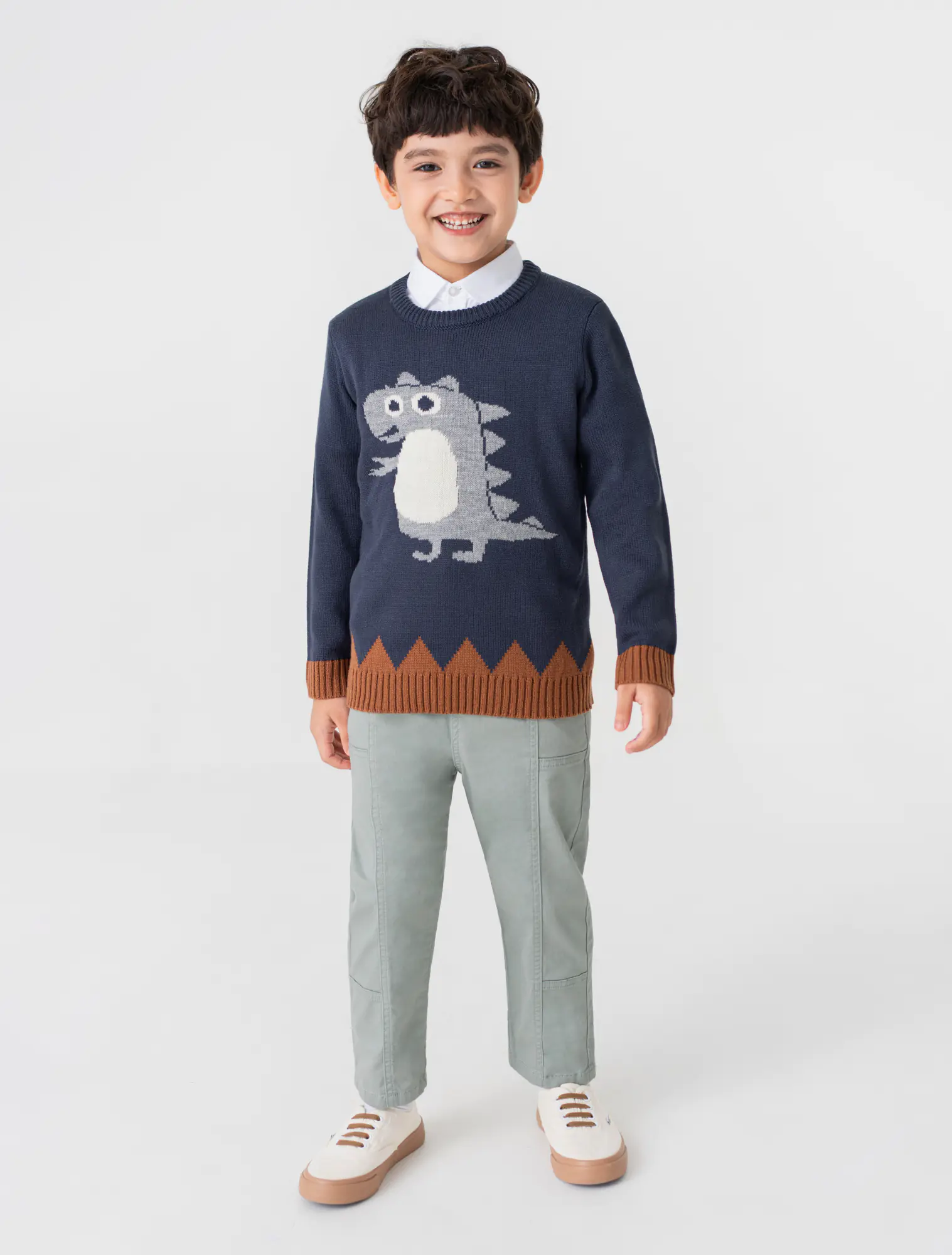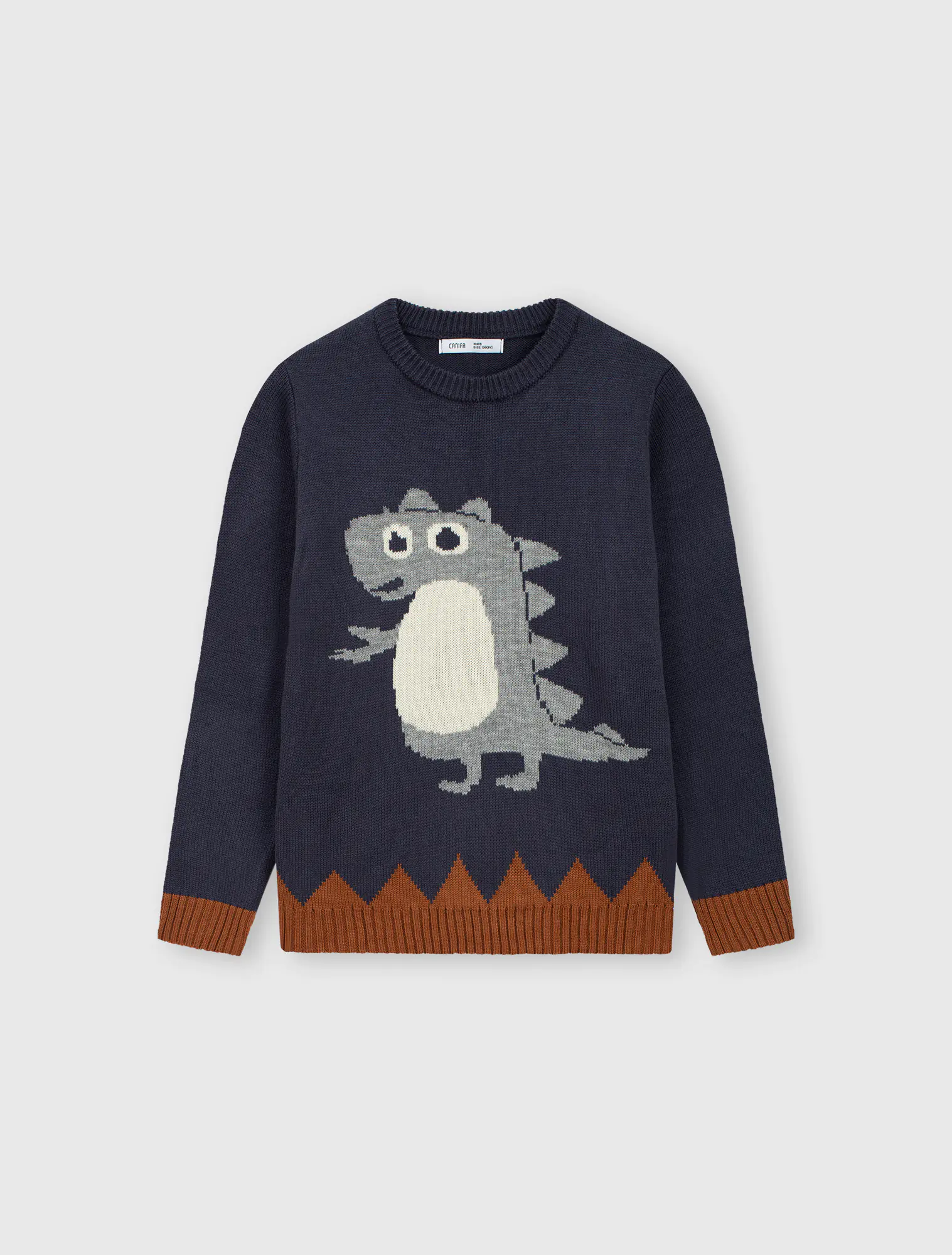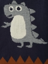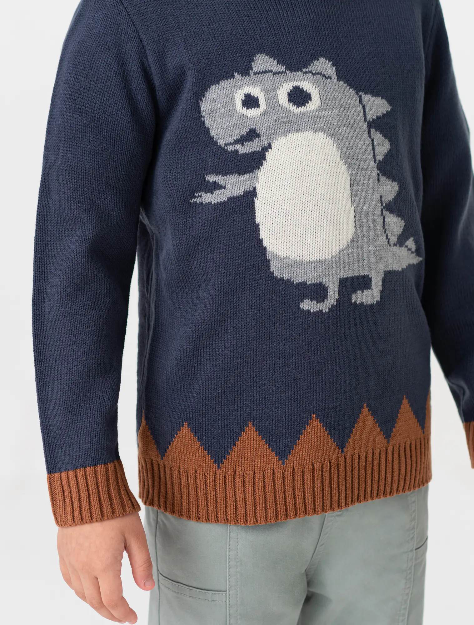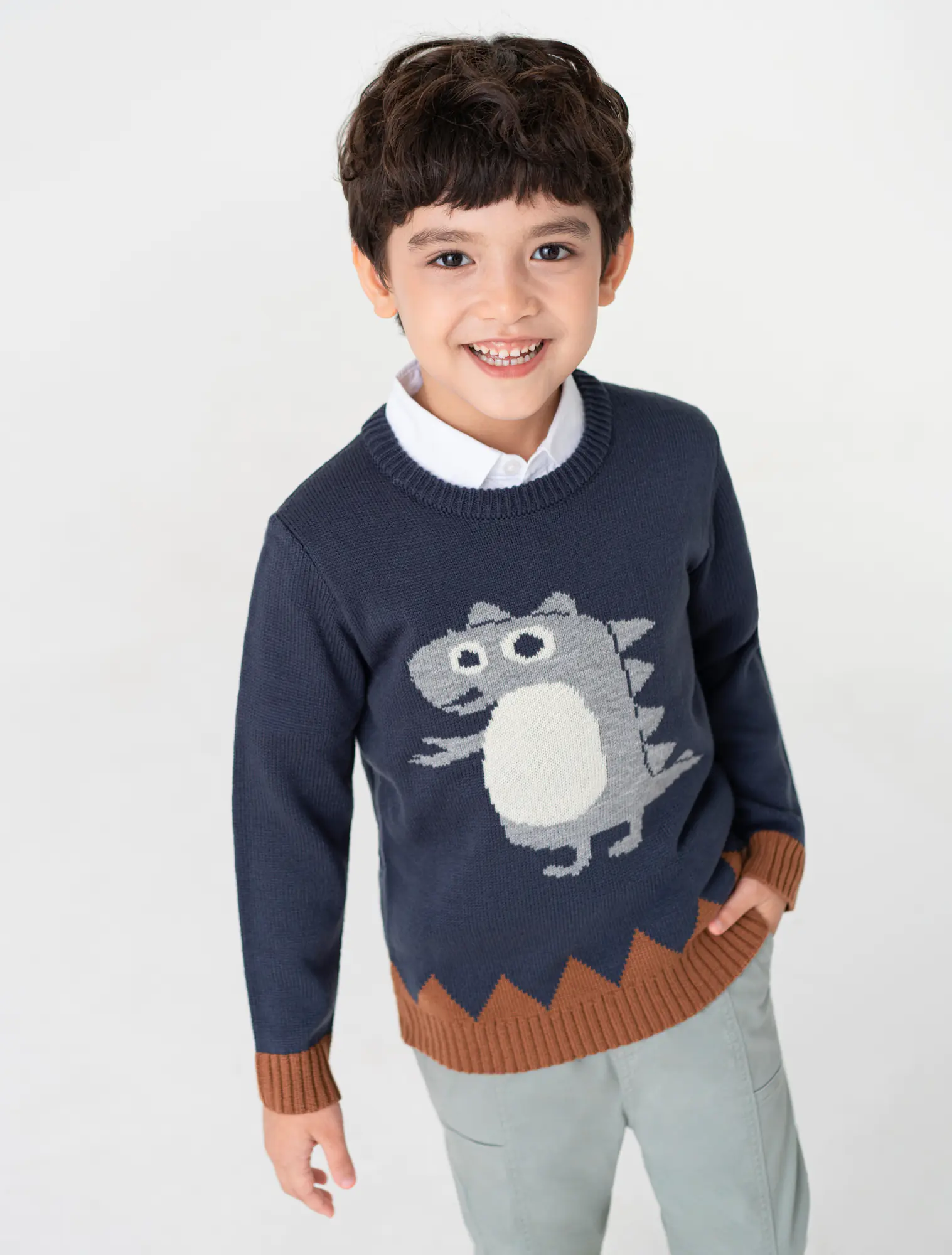 Áo len cổ tròn, dài tay. Phom dáng cơ bản, dệt hình khủng long thân trước. Gấu áo, gấu tay dệt khác màu.
