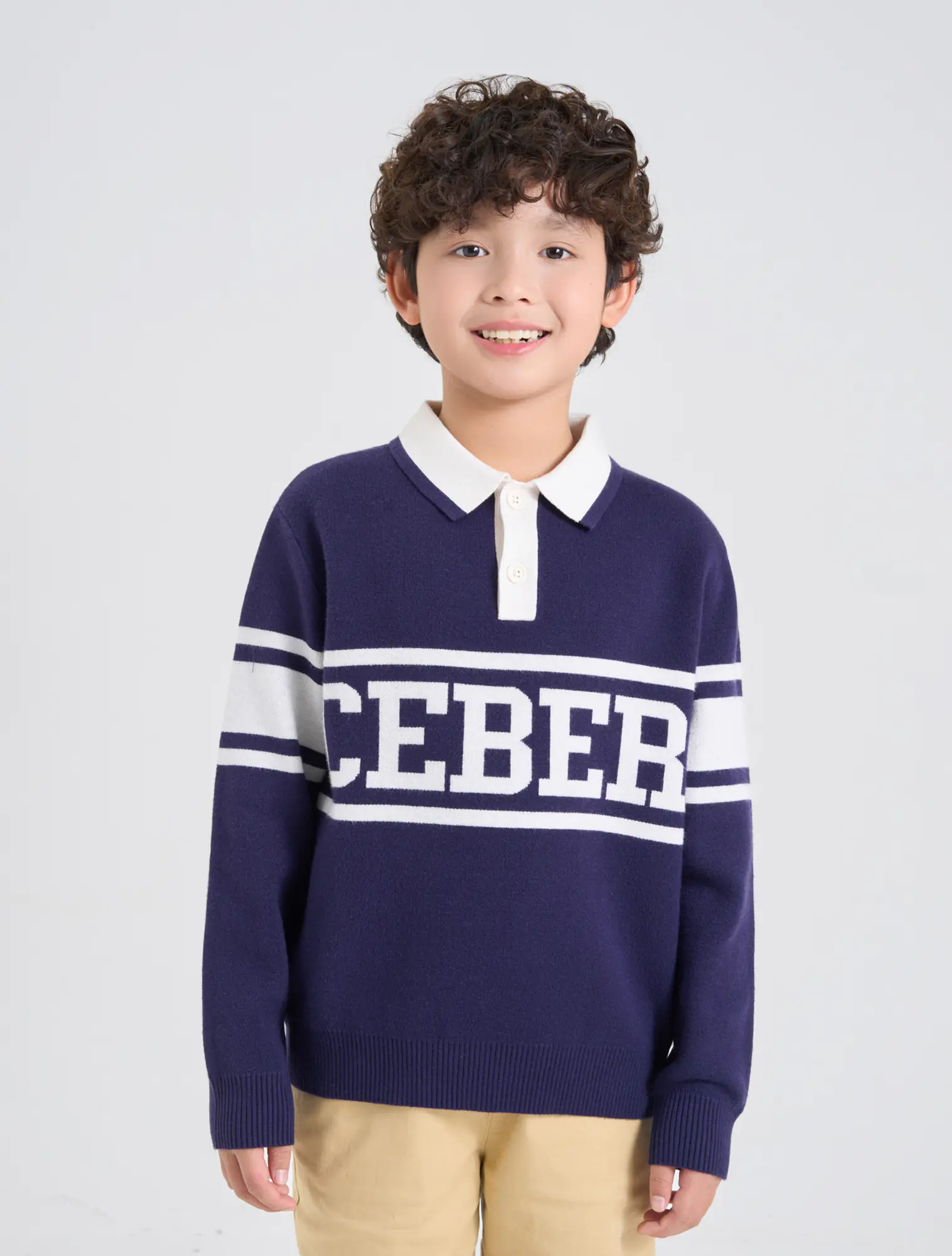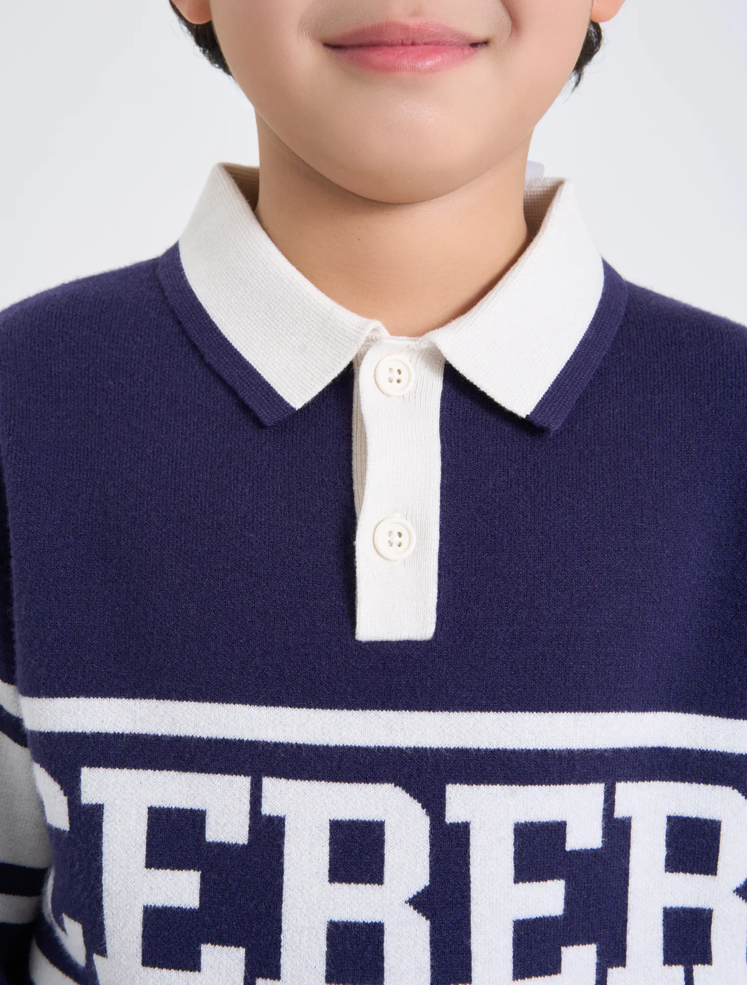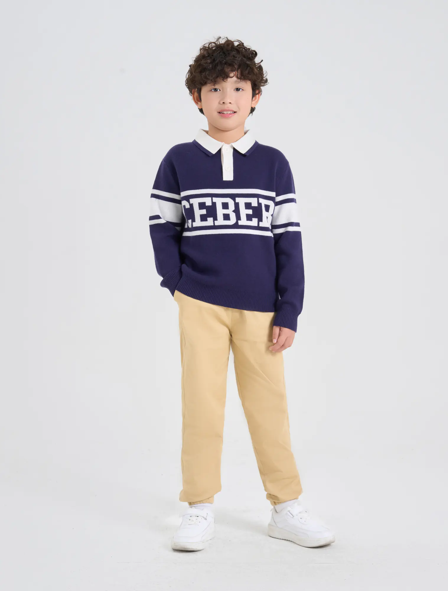Áo len bé trai cổ polo mix màu, phom dáng relax thoải mái, hình dệt chữ nổi bật tạo sự lựa chọn mới cho dàng sợi của các bé.