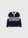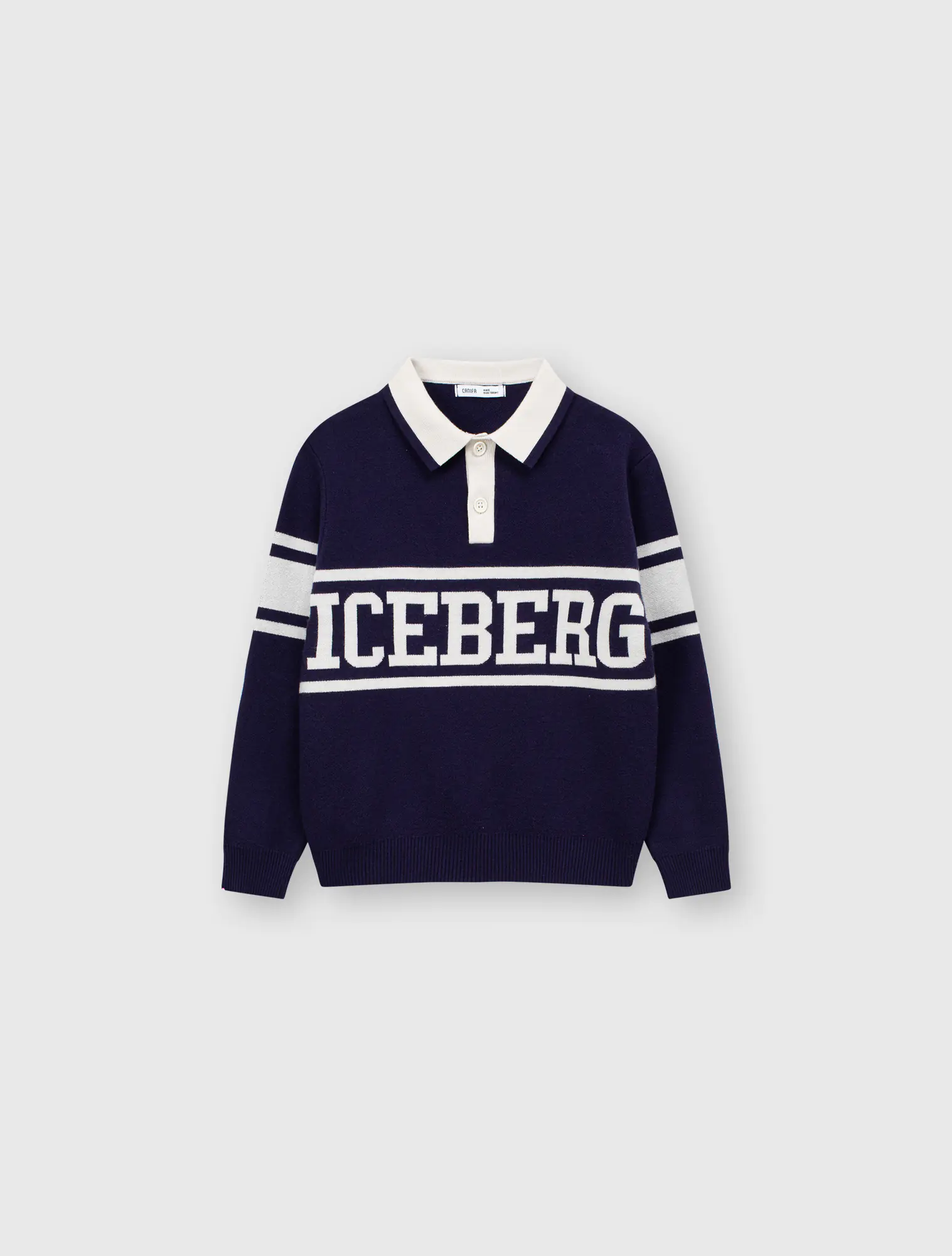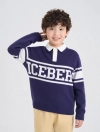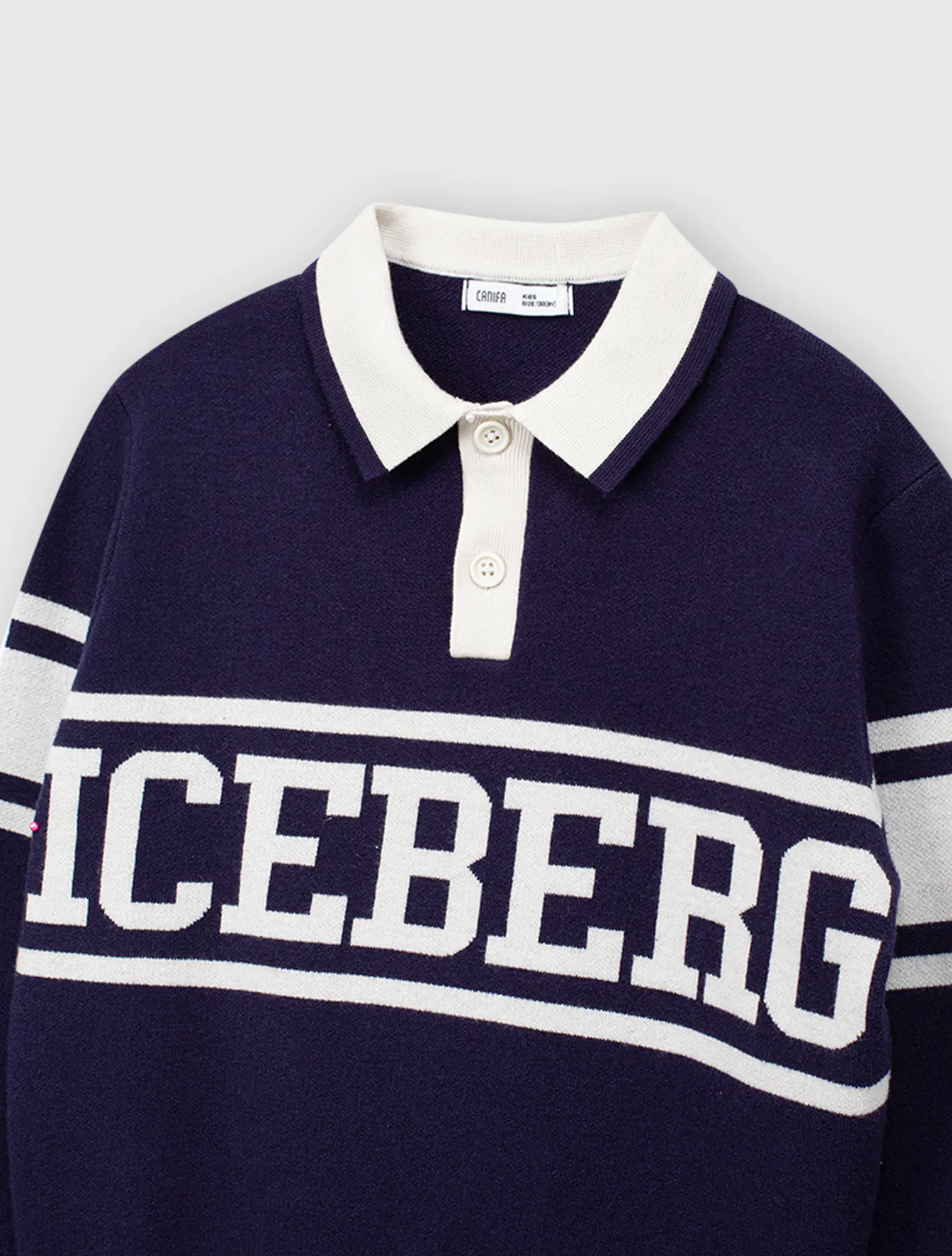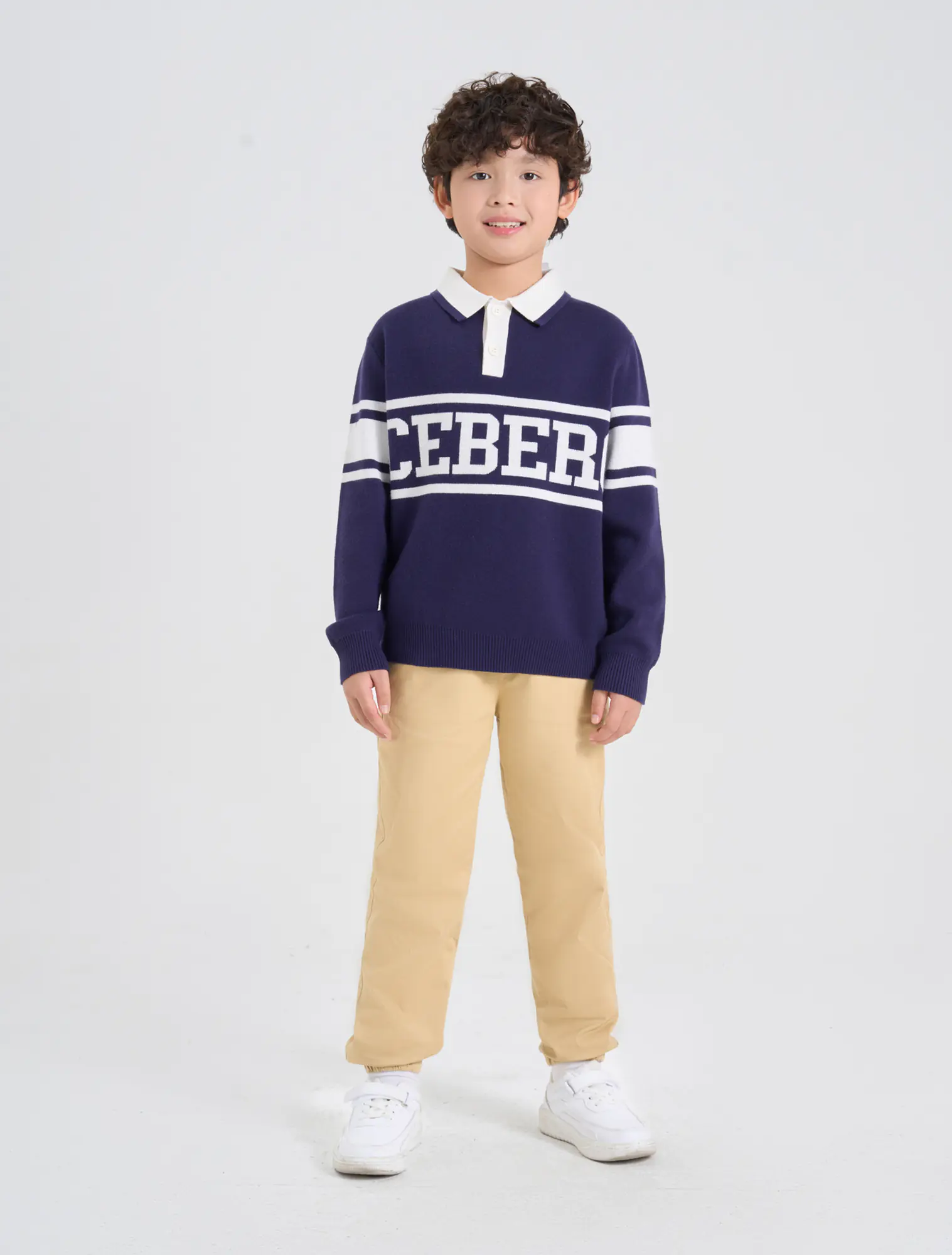 Áo len bé trai cổ polo mix màu, phom dáng relax thoải mái, hình dệt chữ nổi bật tạo sự lựa chọn mới cho dàng sợi của các bé.