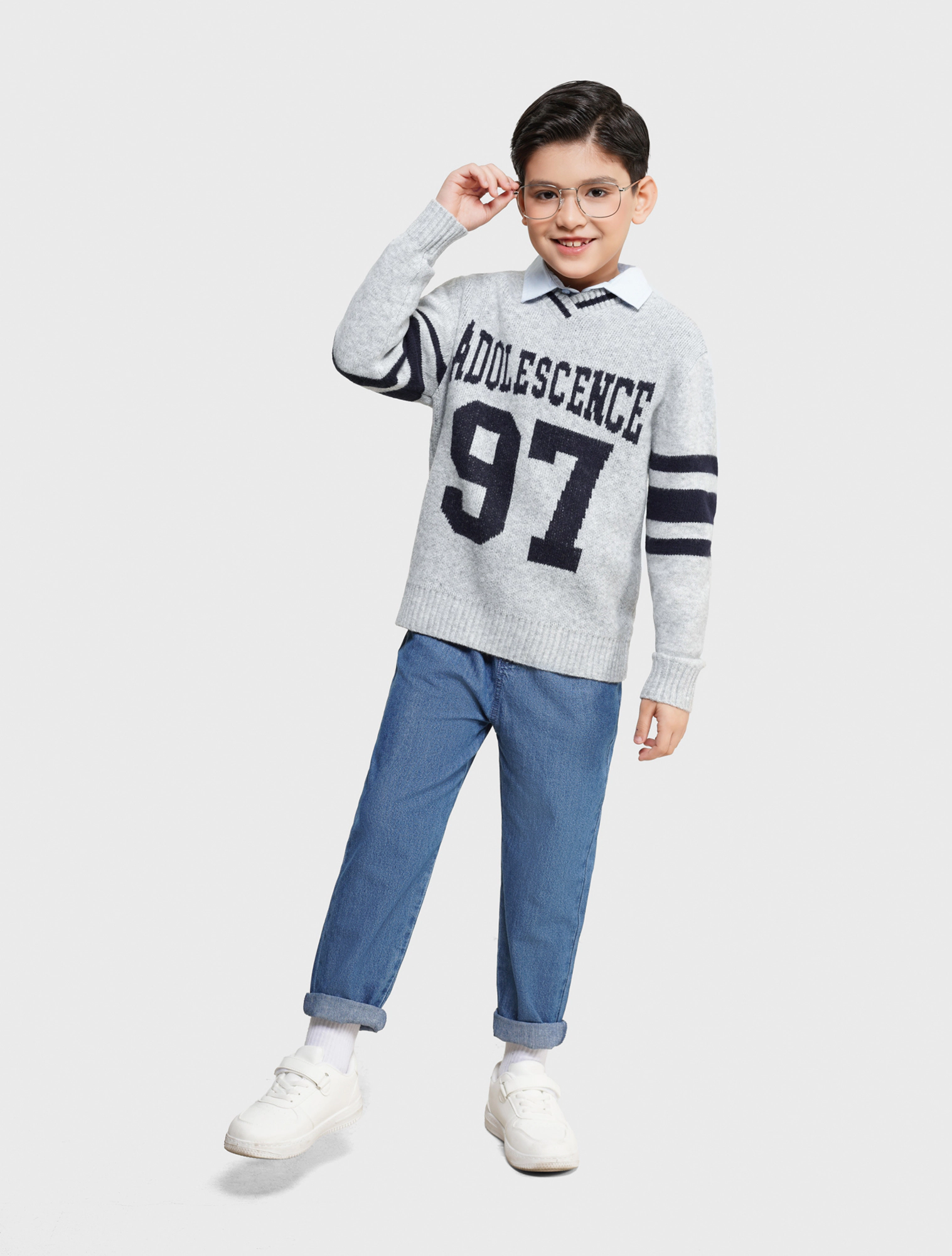 Áo len bé trai, phong cách sport mix màu khỏe khoắn năng động, cổ tim phối kẻ tạo sự mới mẻ cho các bạn trẻ.