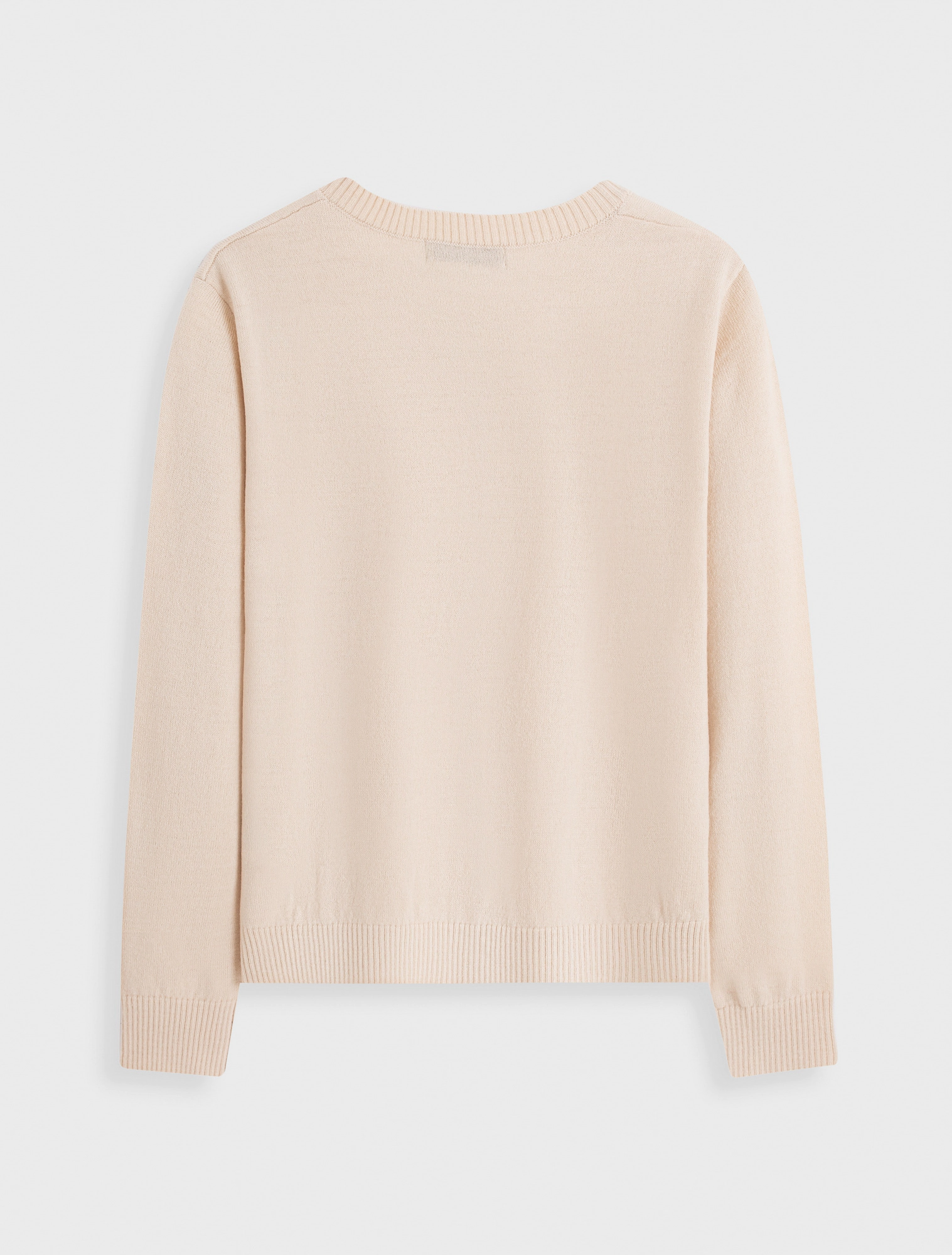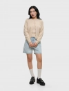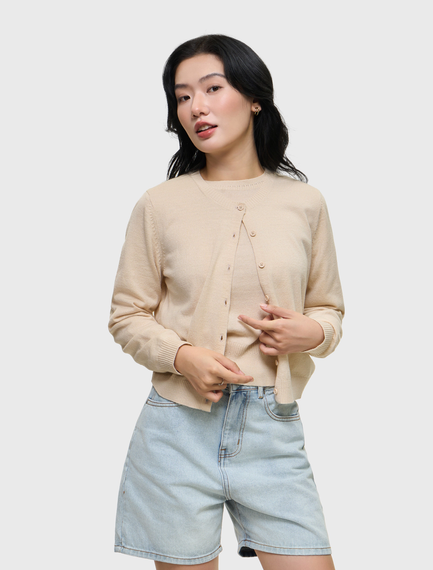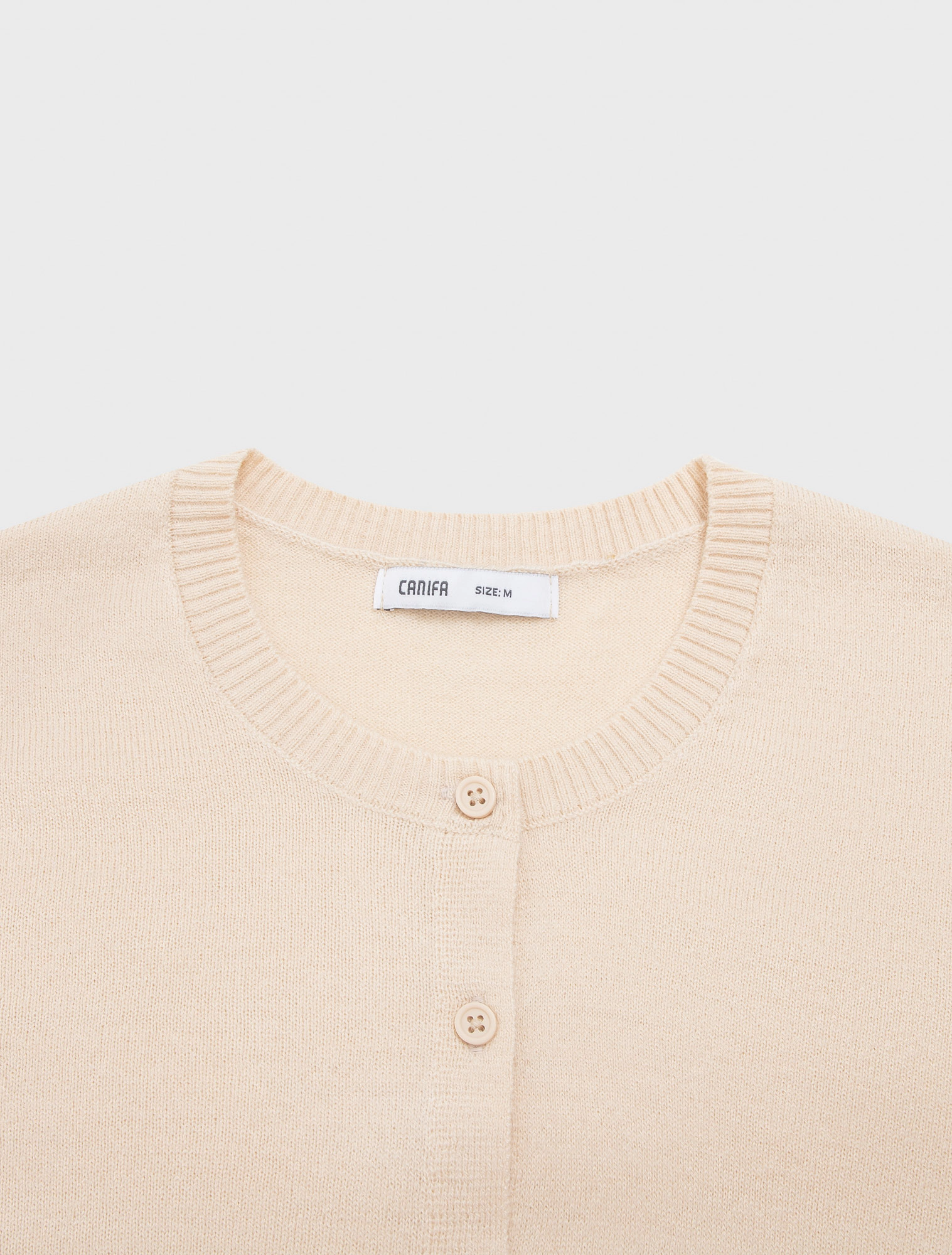 Áo cardigan nữ, cổ tròn dáng rộng vừa.