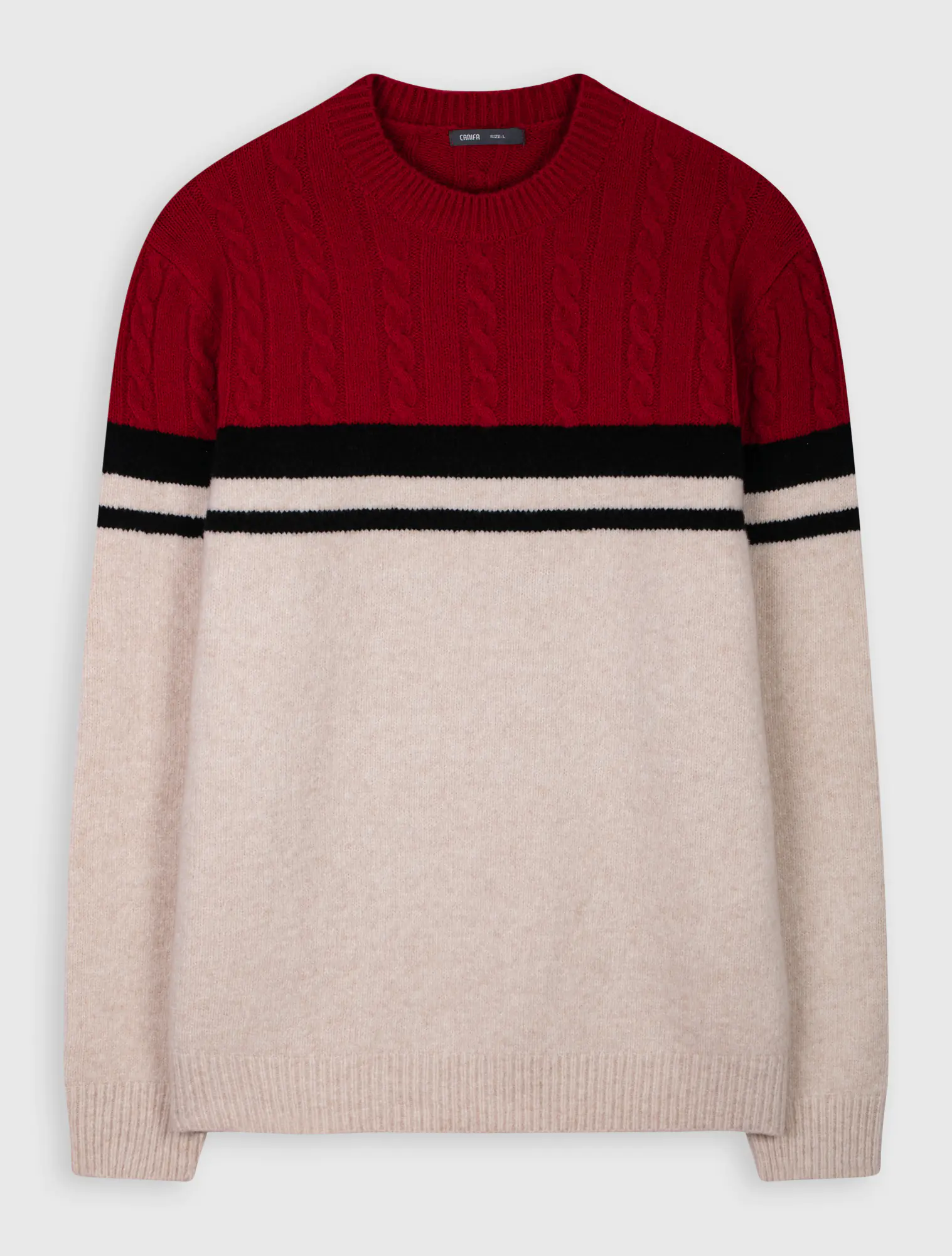 Áo len nam sợi xù dệt thừng và phối màu phần ngực áo.