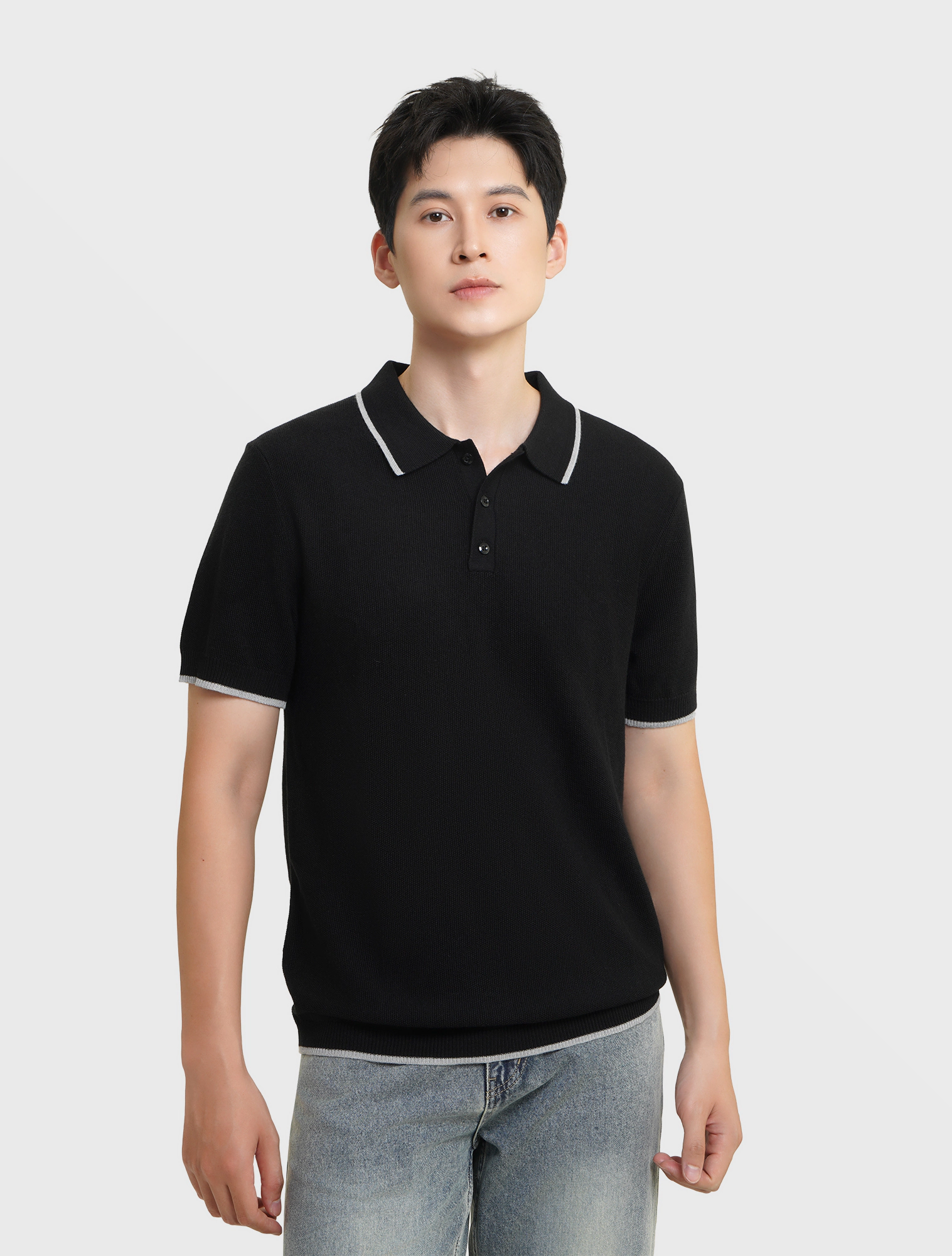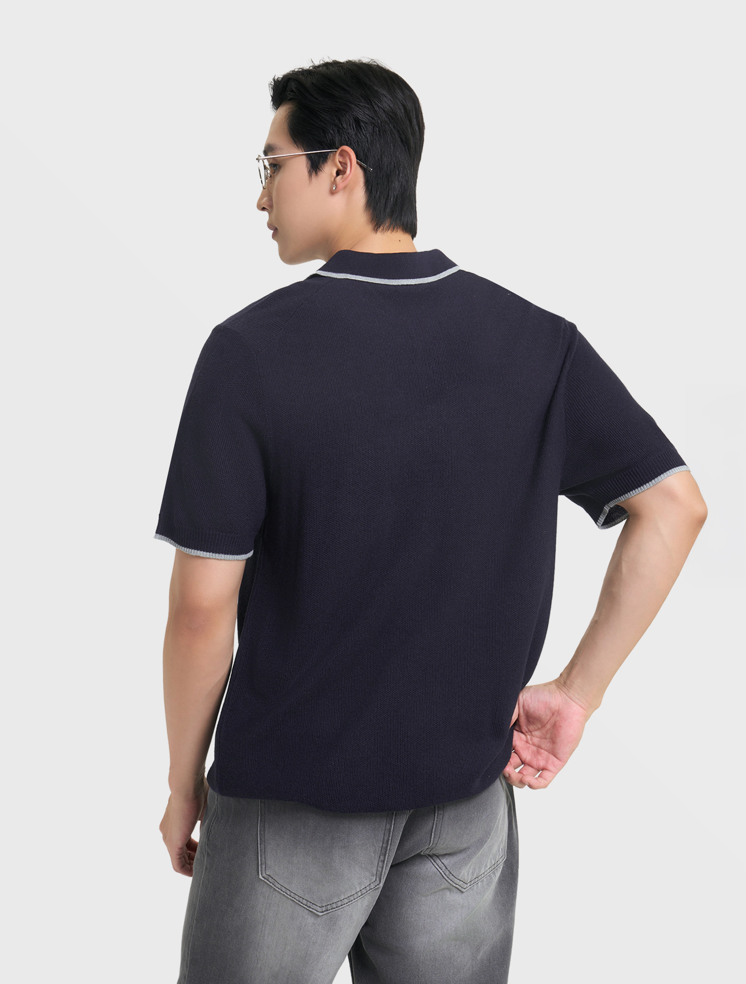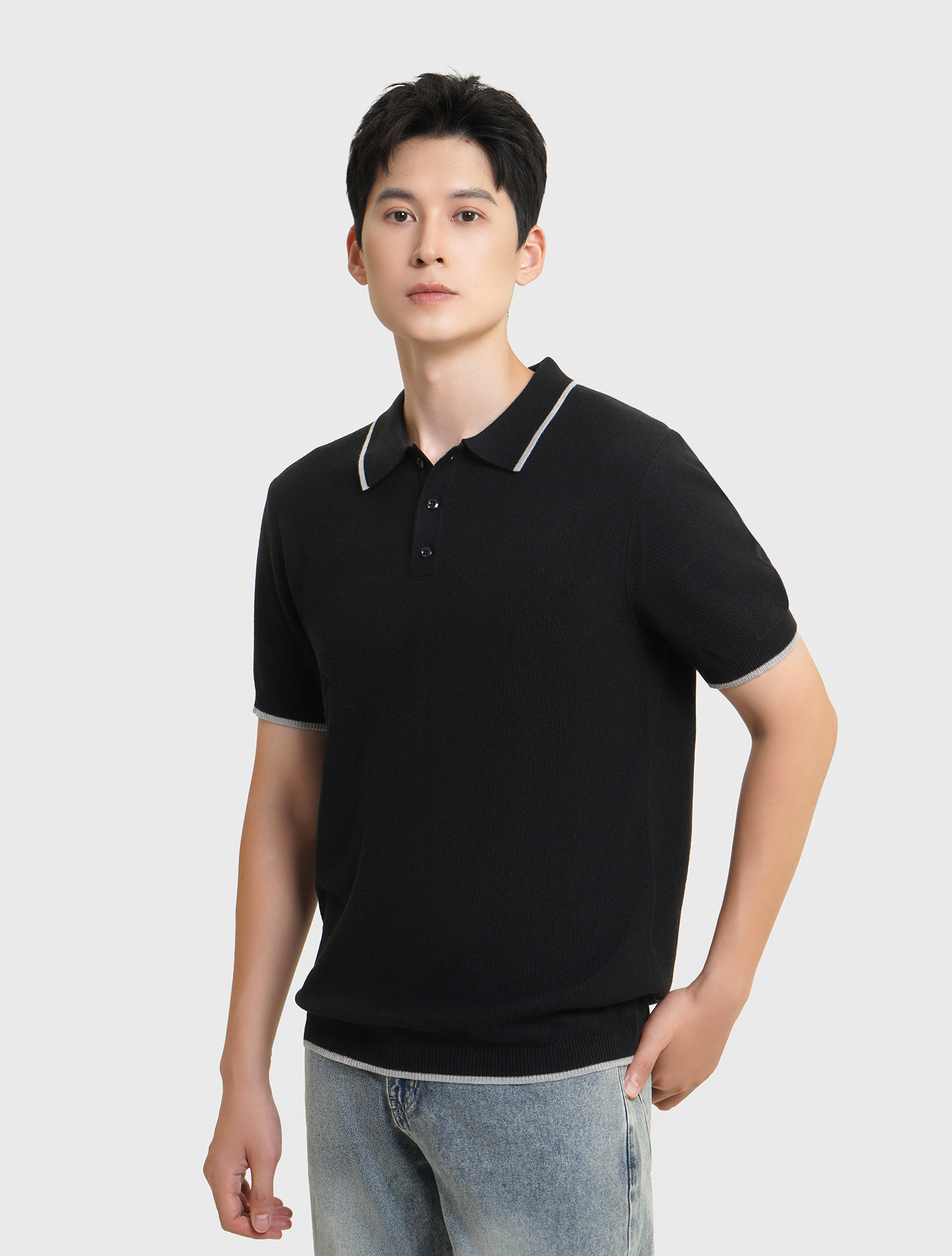 Áo len nam ngắn tay, cổ polo, dáng regular, mang phong cách hiện đại.
