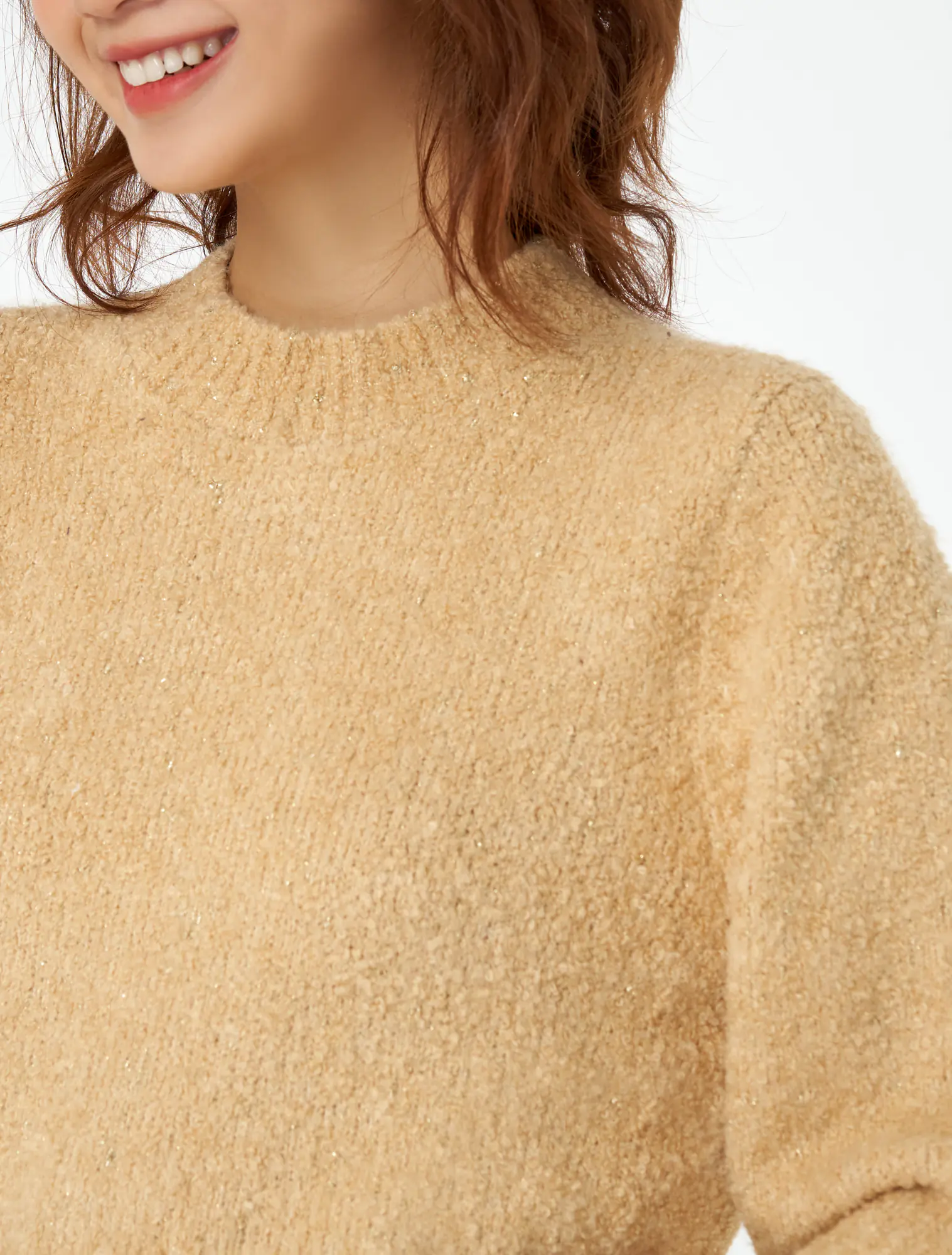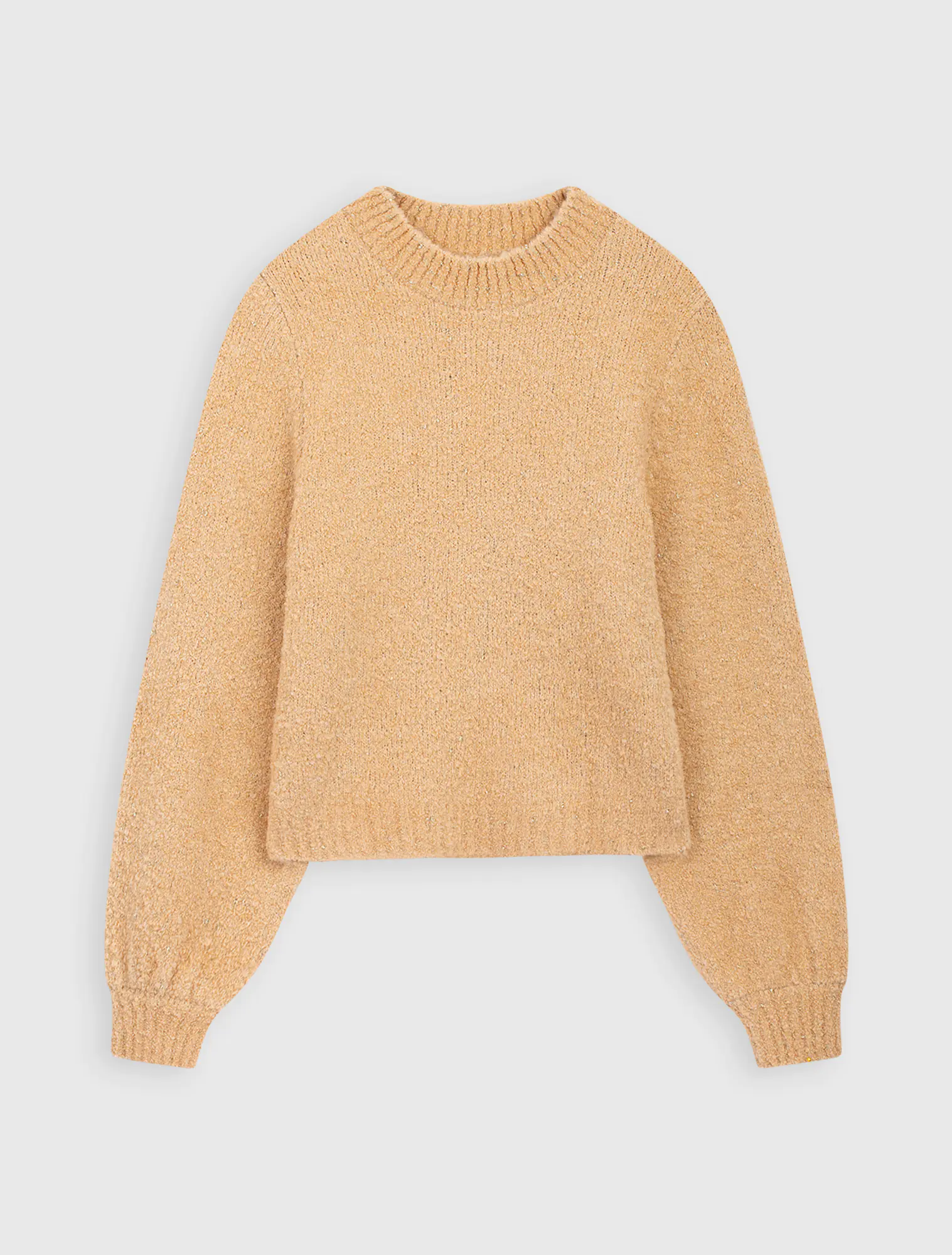Áo len cổ tròn tay phồng nhẹ.