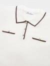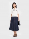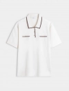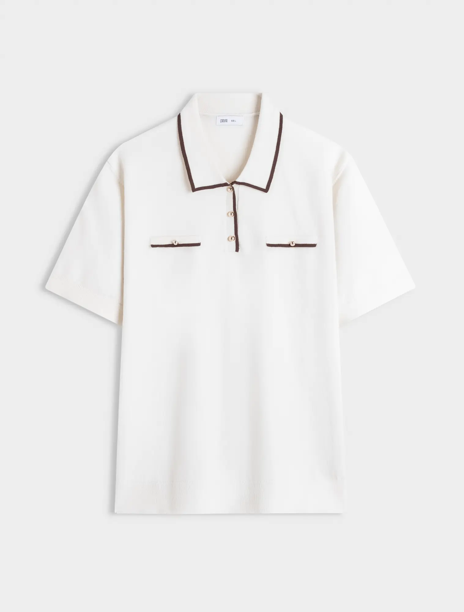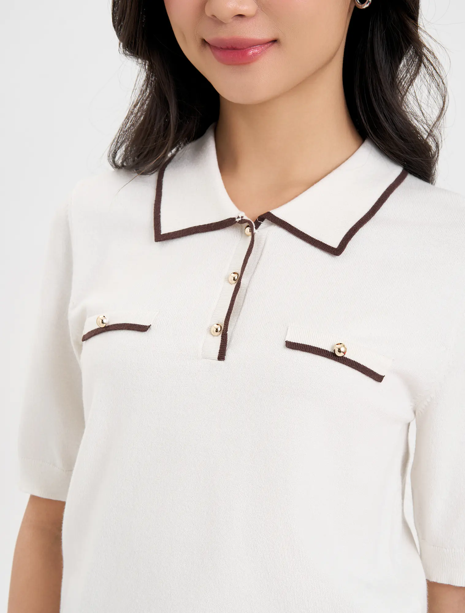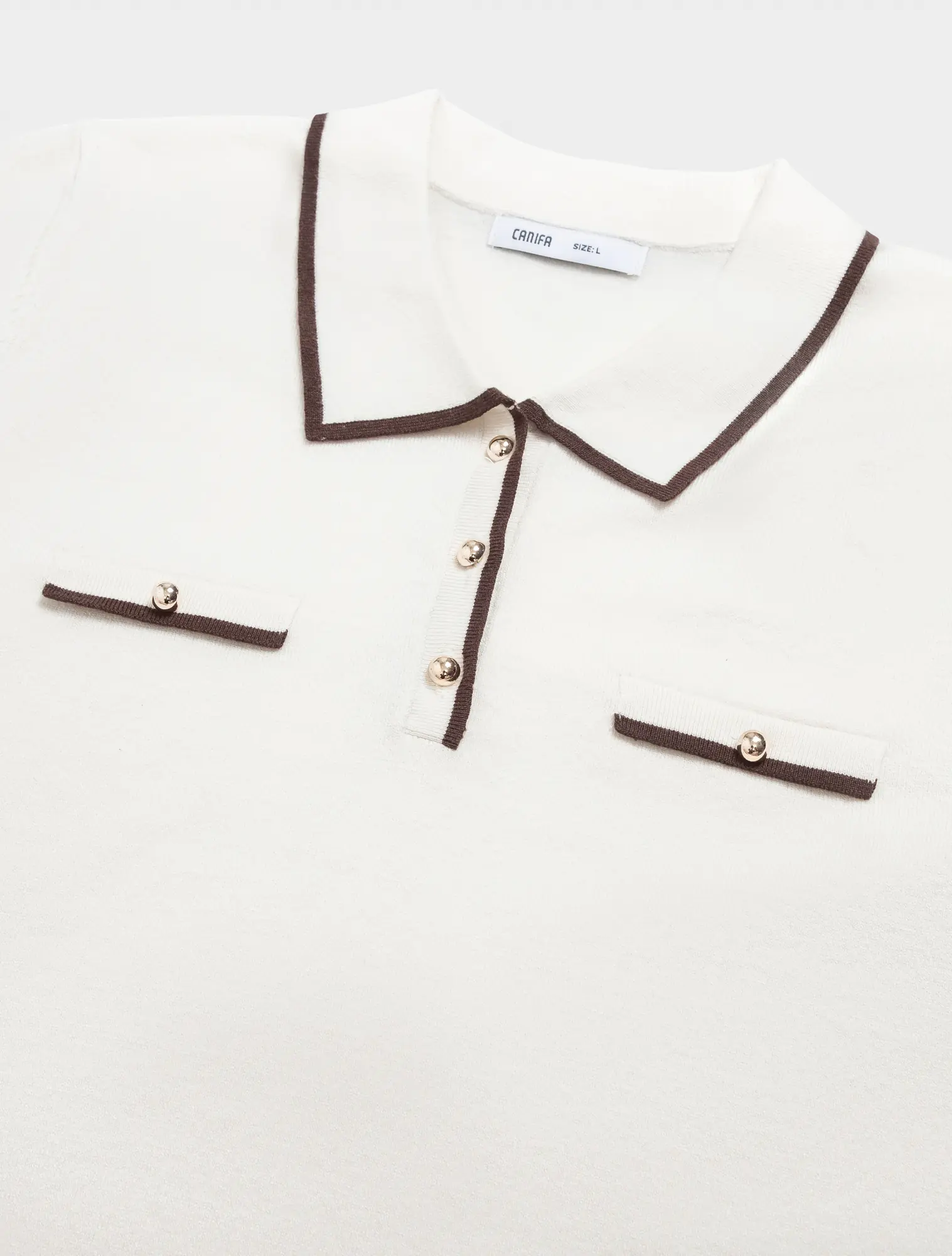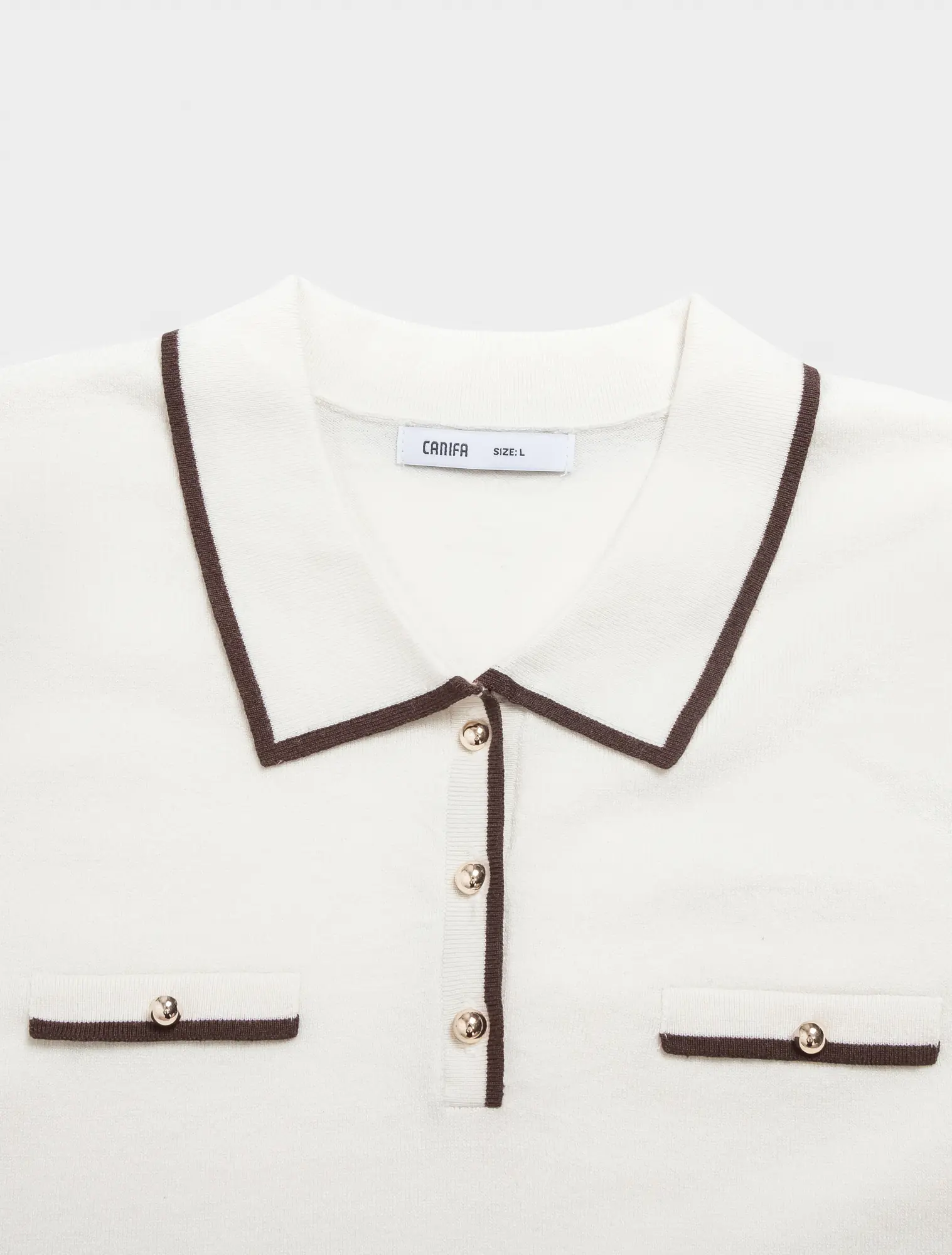 Áo len cổ polo phối màu, tay lỡ dáng ôm vừa, chất liệu mềm mại, thoải mái.