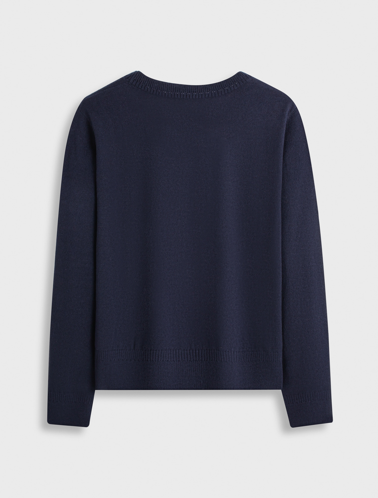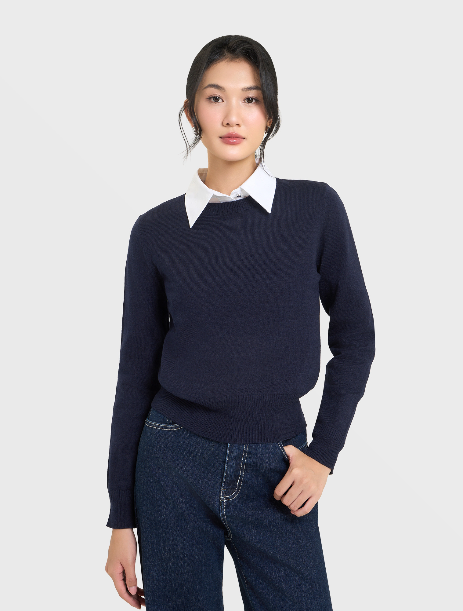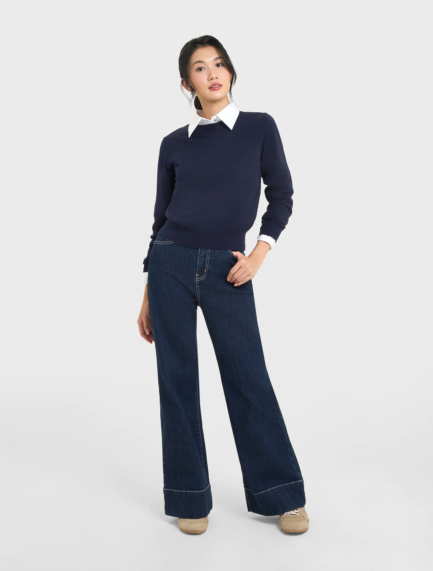 Áo len nữ dài tay cổ tròn,dáng rộng vừa, chi tiết kiểu ở cổ tay và gấu áo.