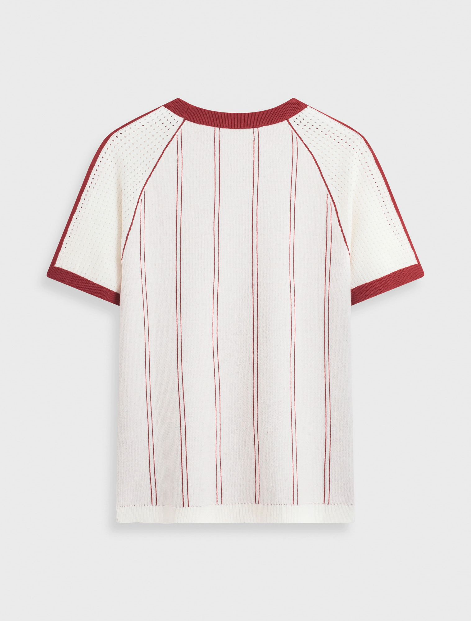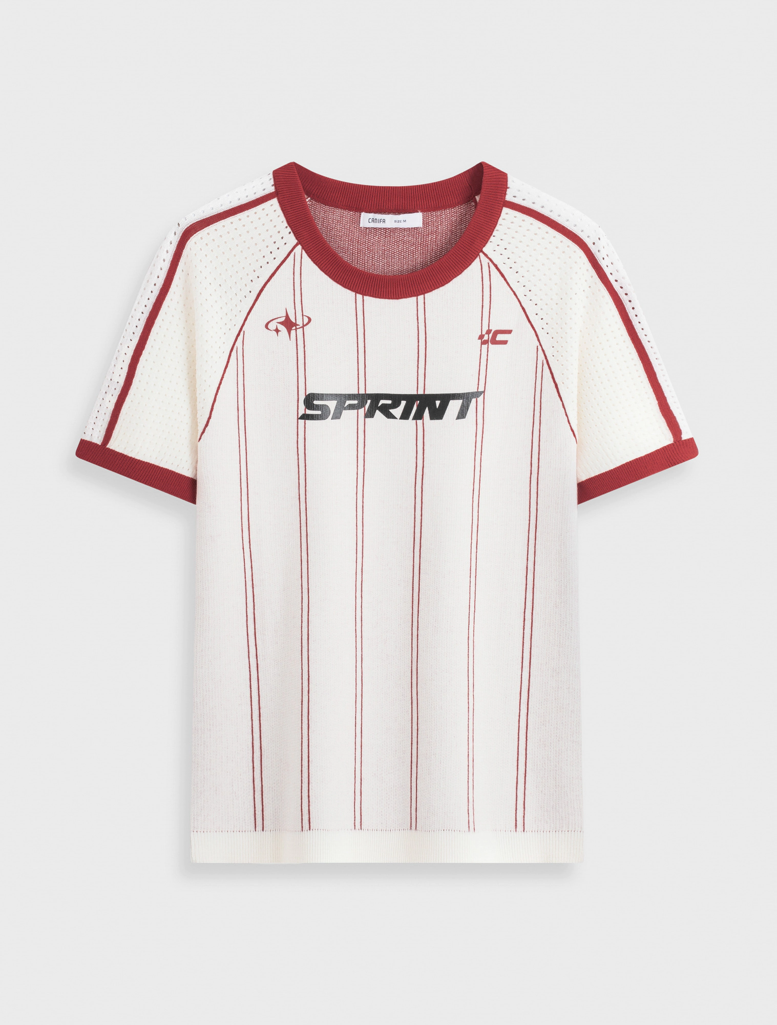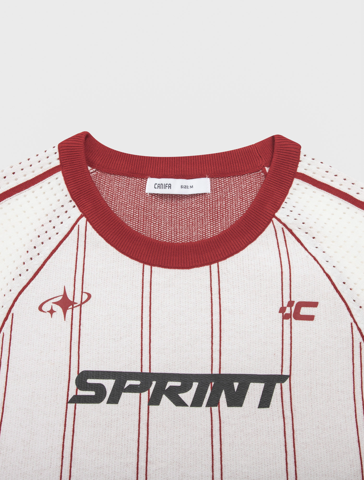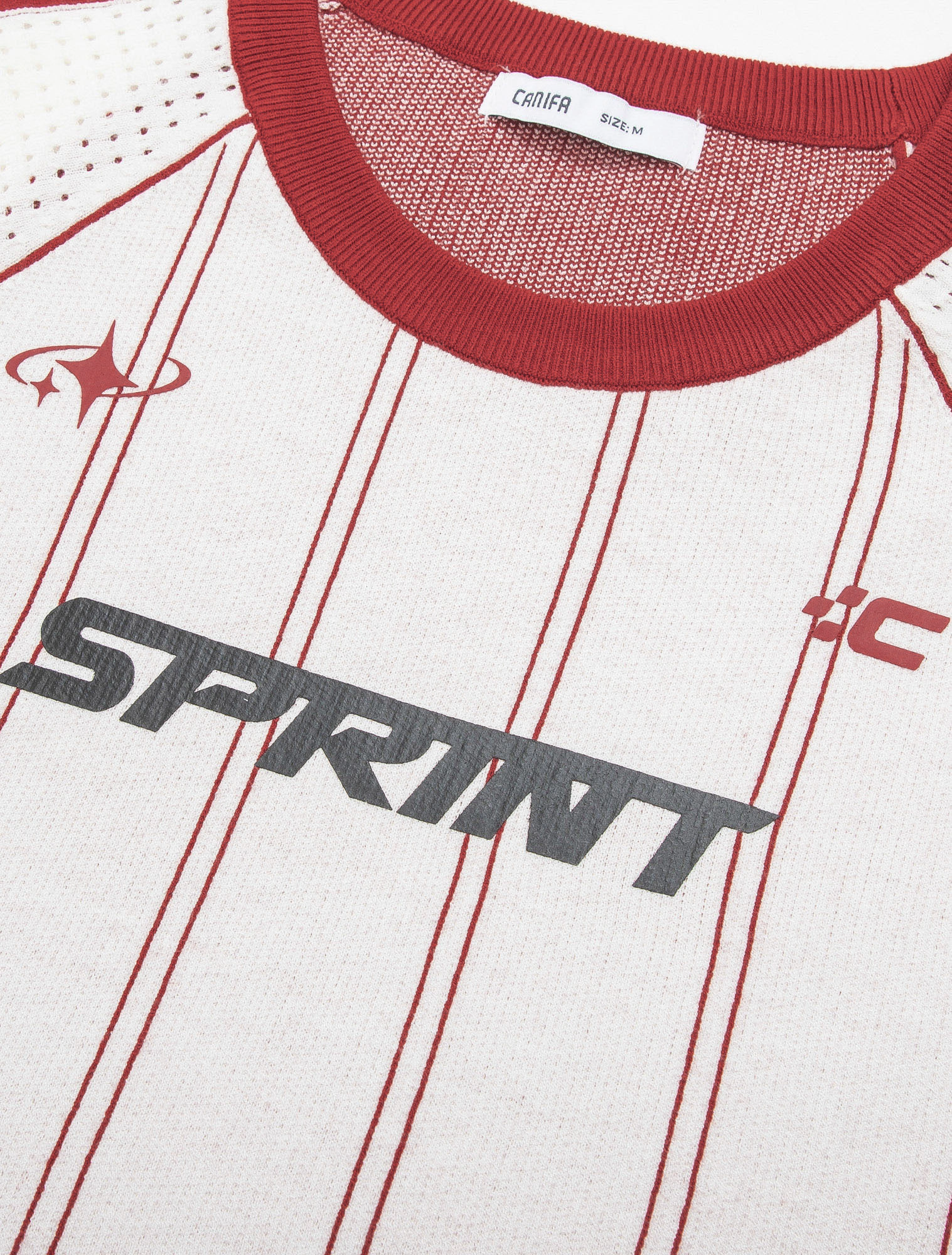 Áo len cổ tròn, tay ngắn dáng ôm vừa, có chi tiết phối màu và in. Chất liệu mềm mại, thoải mái.