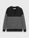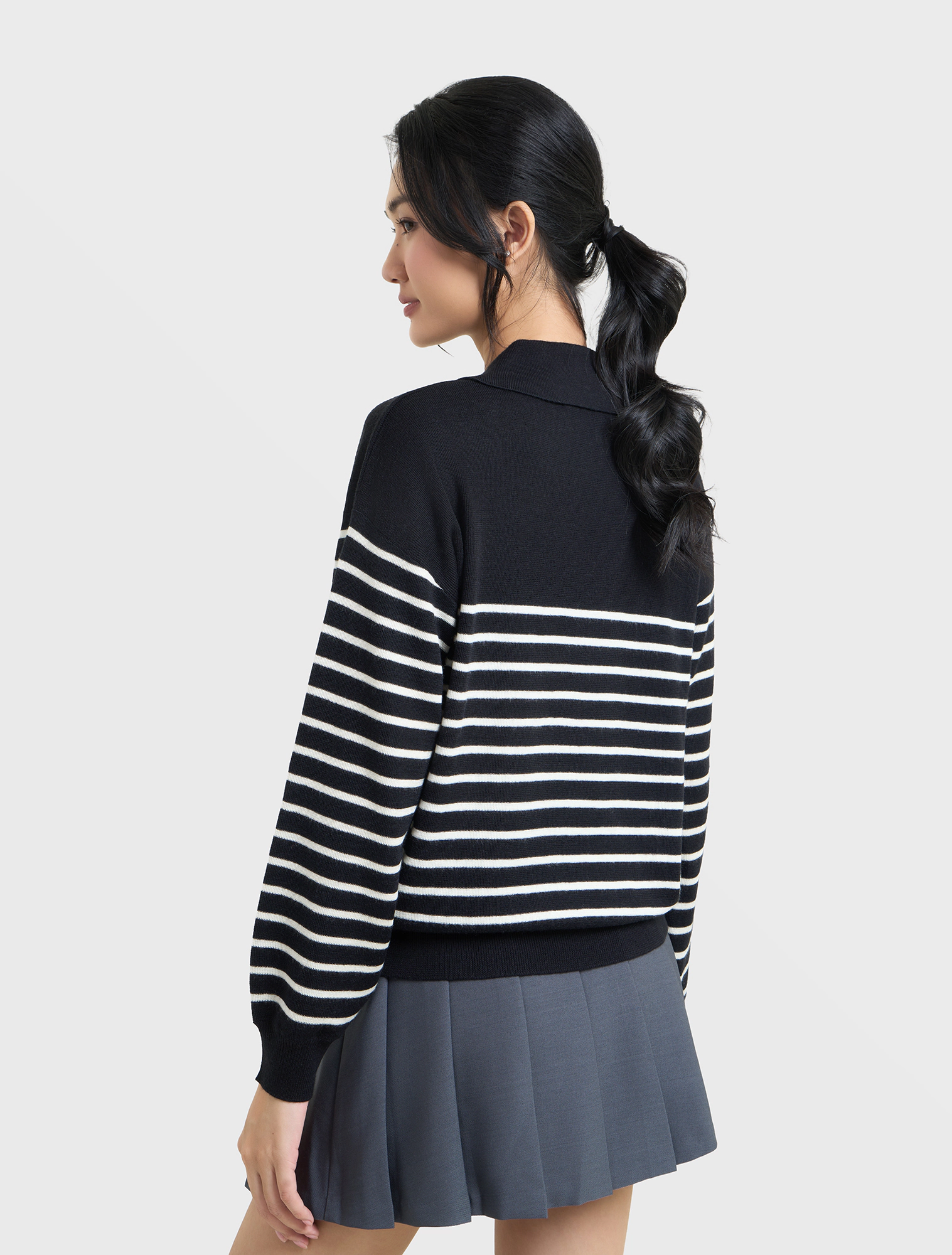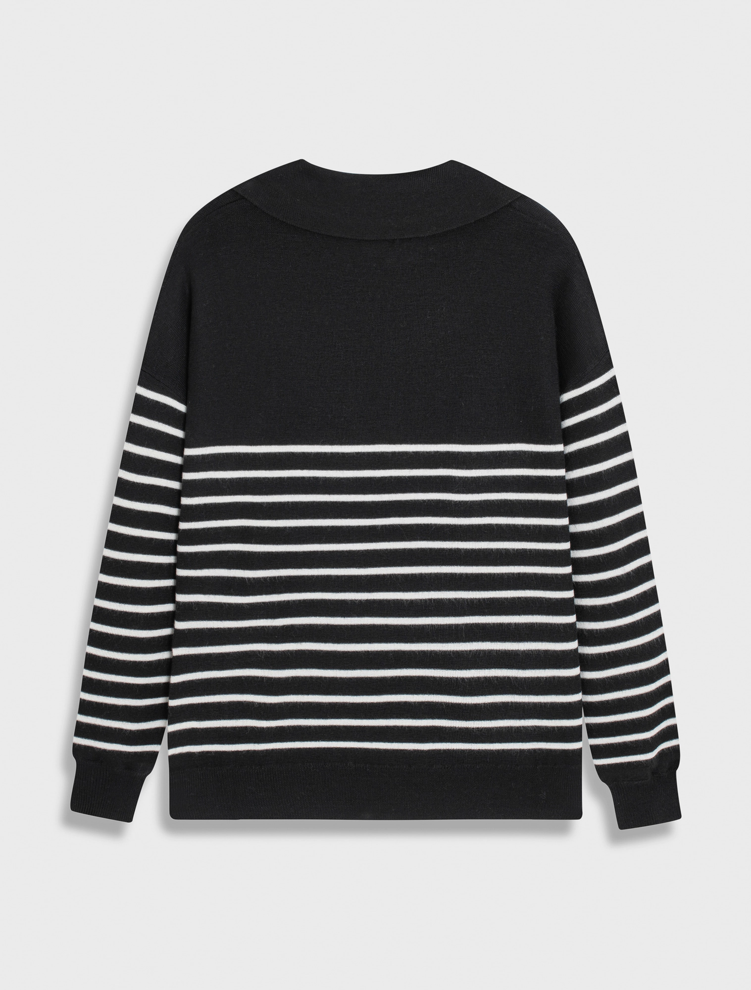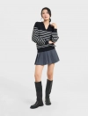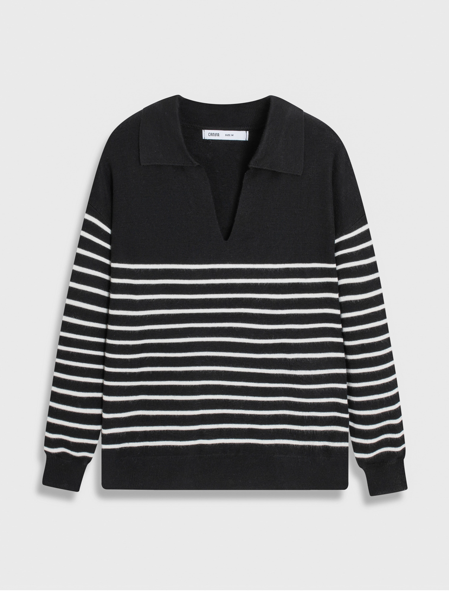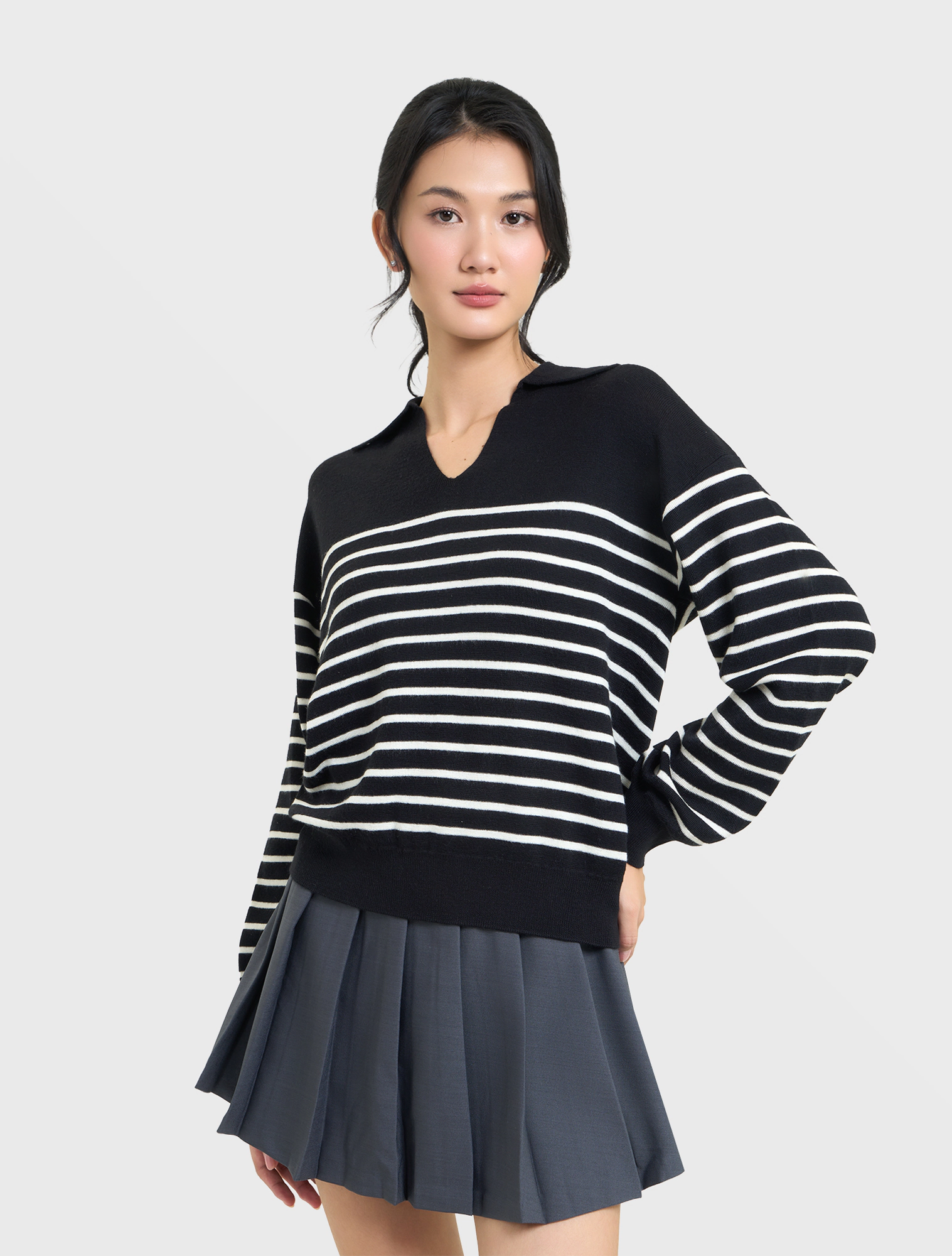 Áo len nữ dài tay, cổ bẻ, dáng suông, phối màu kẻ, chất liệu mềm mại, thoải mái, hoàn cảnh sử dụng linh hoạt.