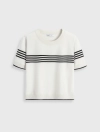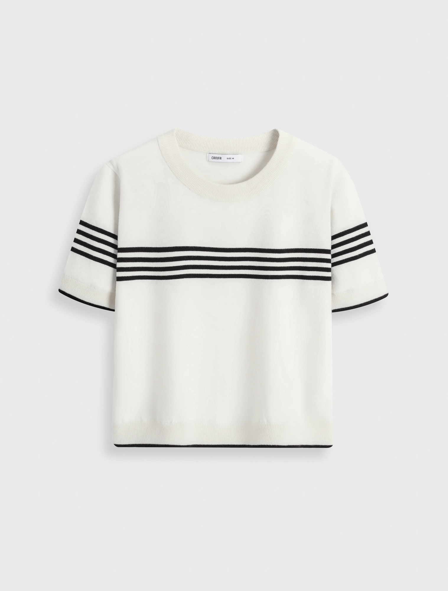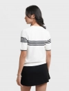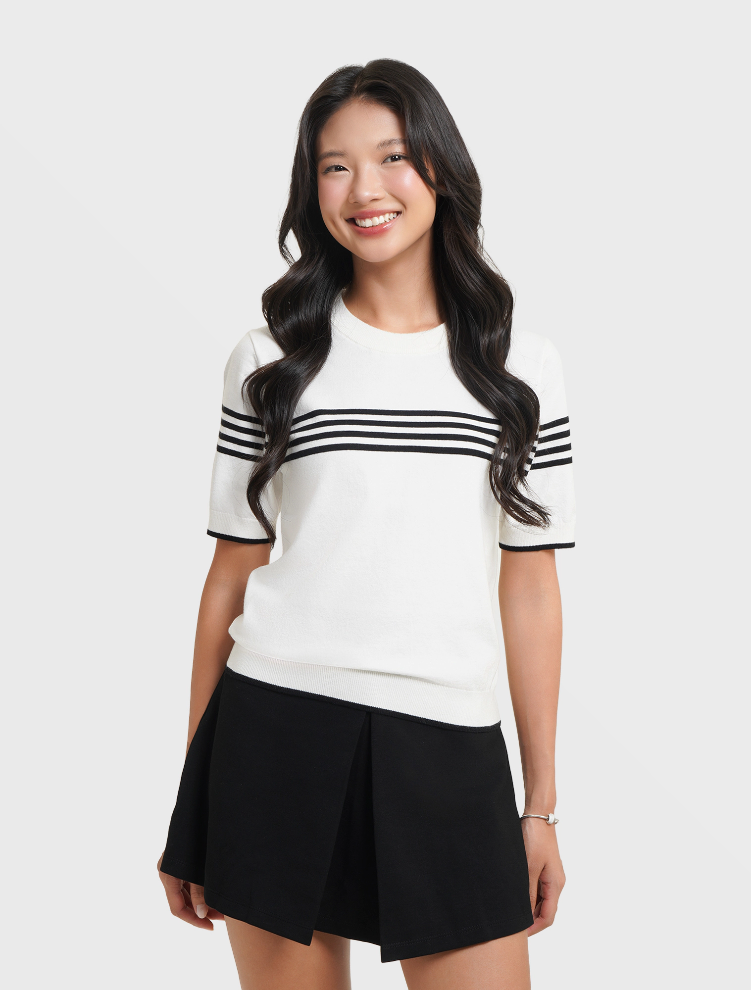 Áo len nữ cộc tay dáng ôm, phối màu kẻ nổi bật, tôn dáng và dễ phối đồ.