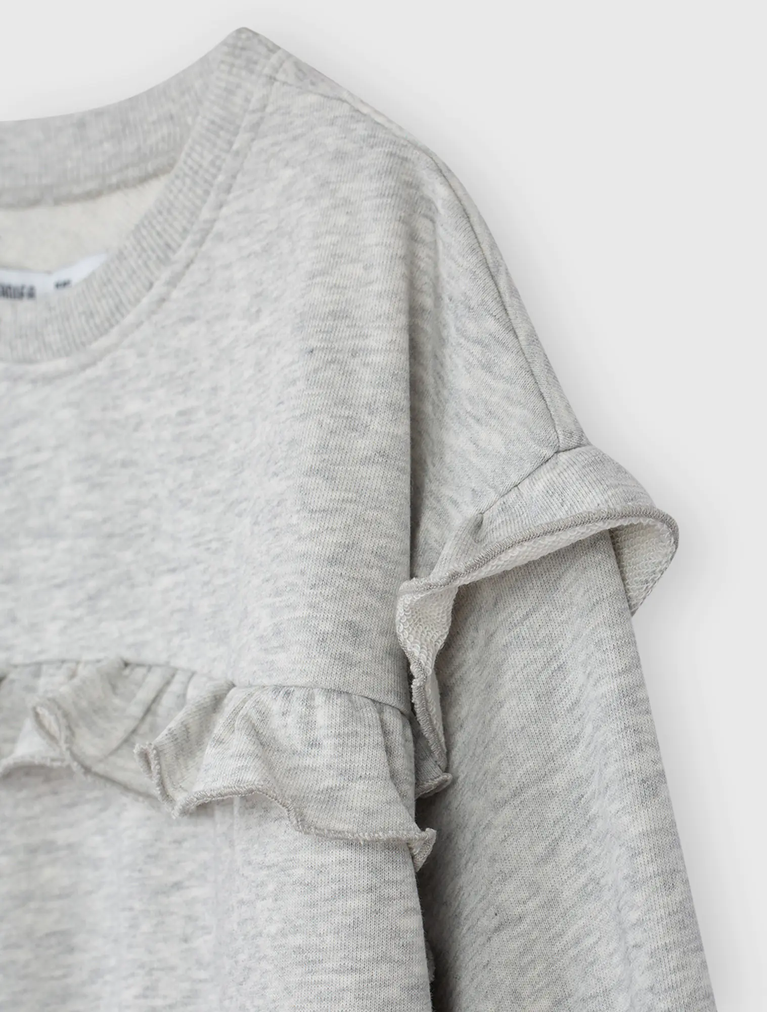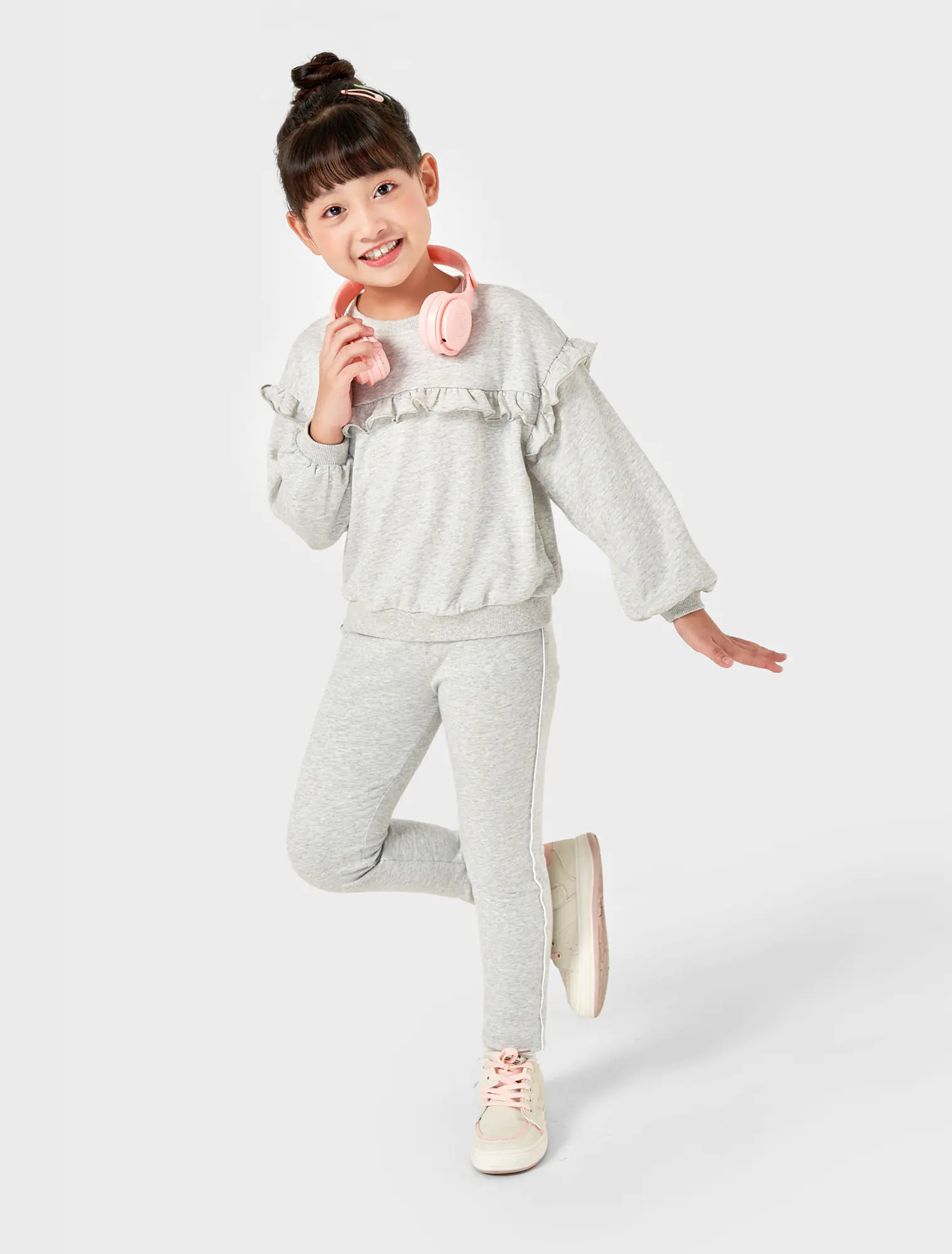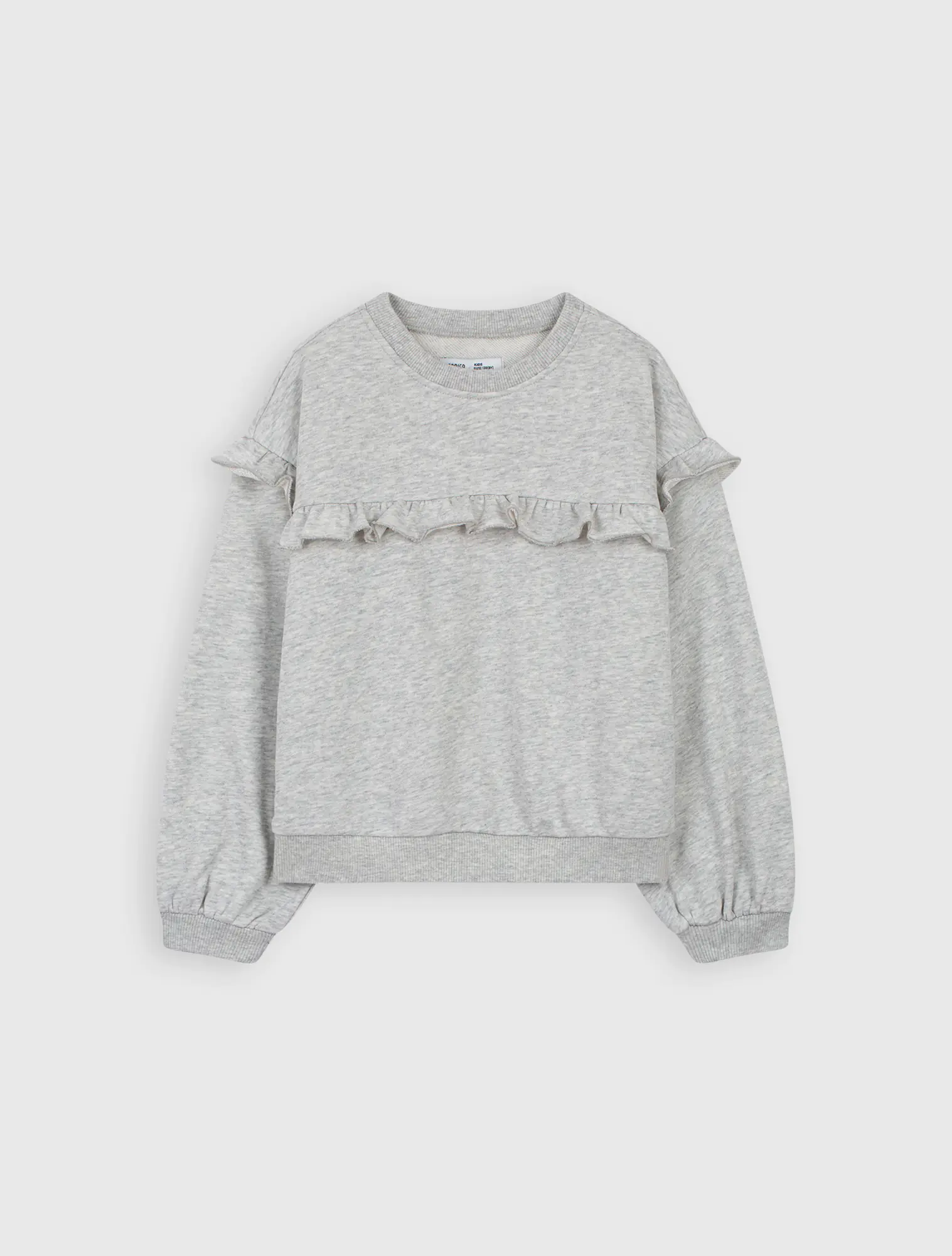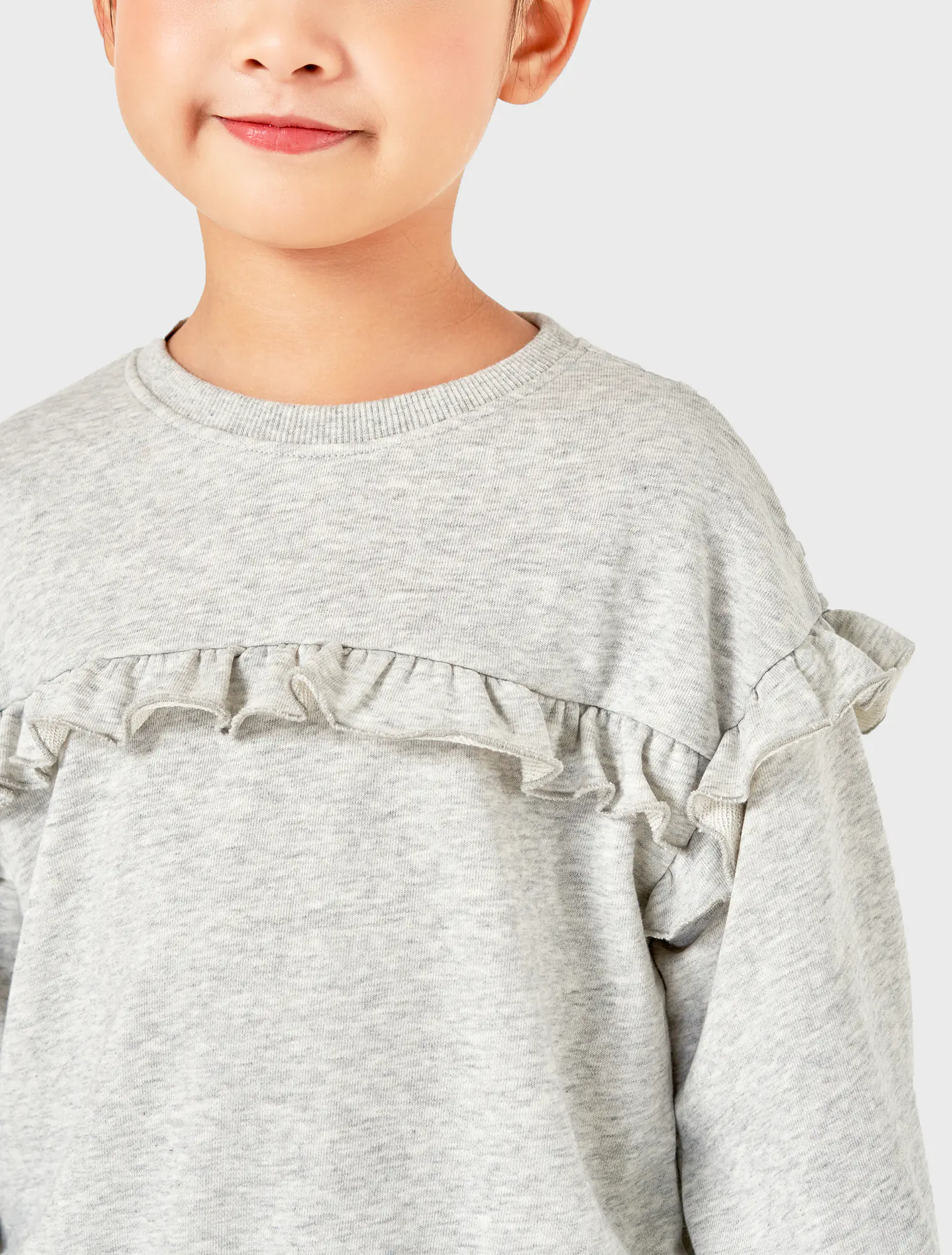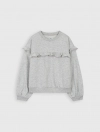 Áo nỉ chất liệu cotton pha, cổ tròn, tay phồng nhẹ, bèo chạy ngang thân trên.
