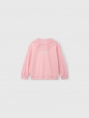 Áo nỉ bé gái cổ kiểu in hình tự do, phối bèo lưới ở cổ.