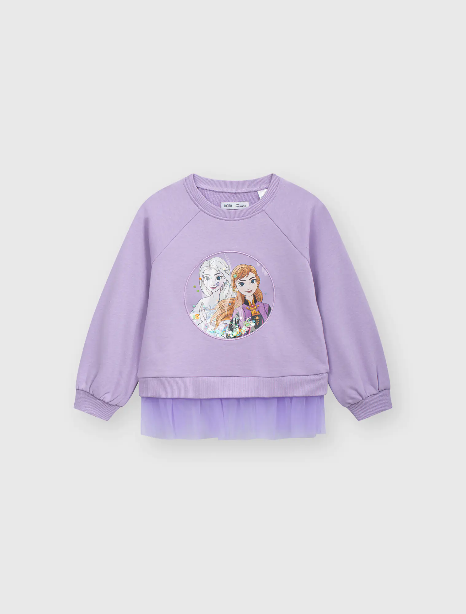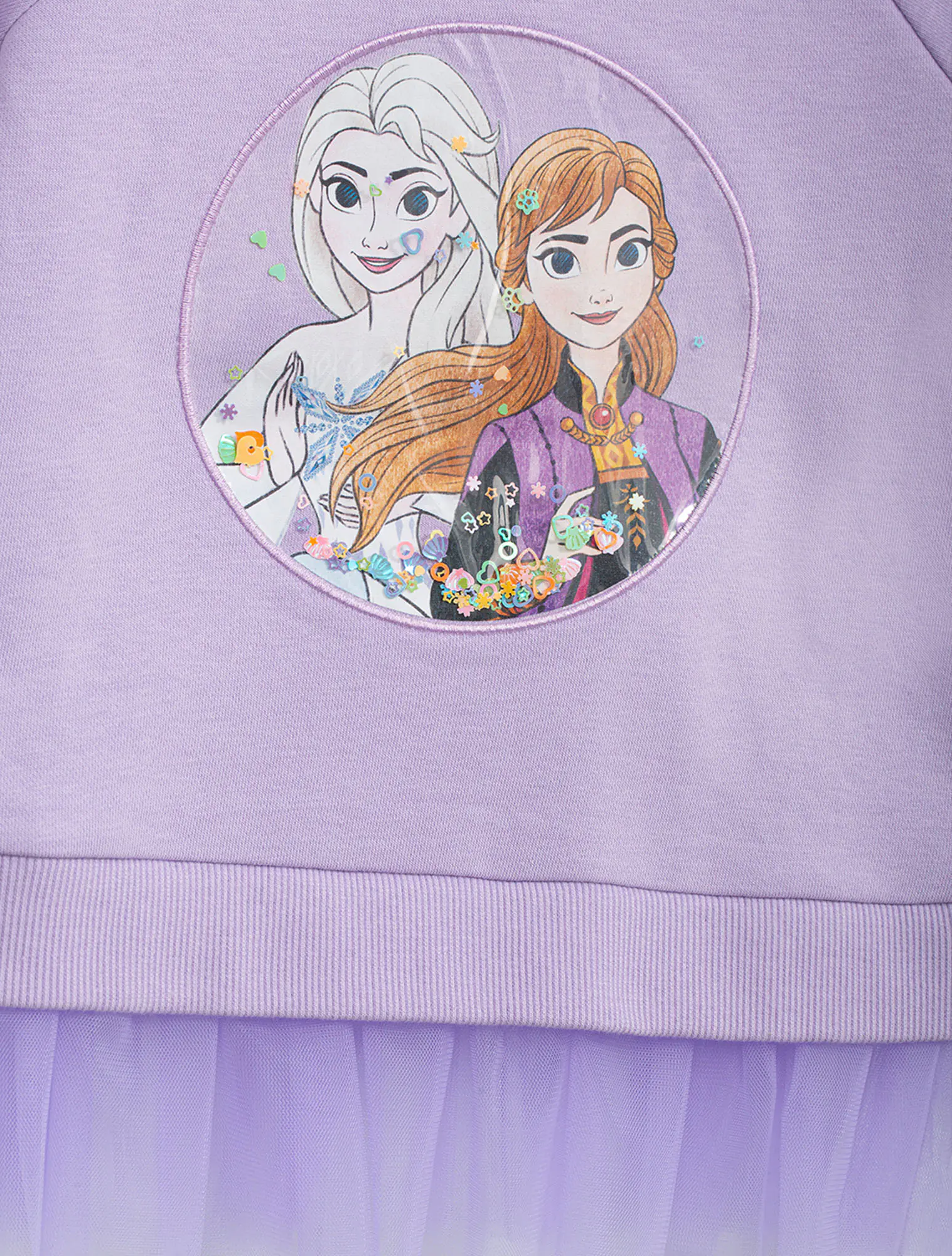 Áo nỉ bé gái in hình Elsa & Anna. Có lớp lưới dưới gấu phù hợp với các bé điệu đà, nữ tính.