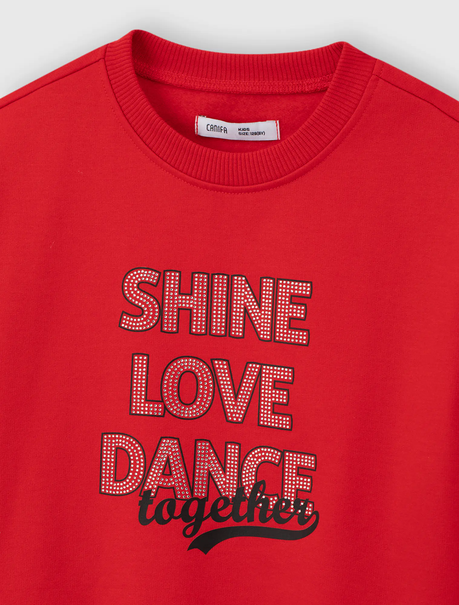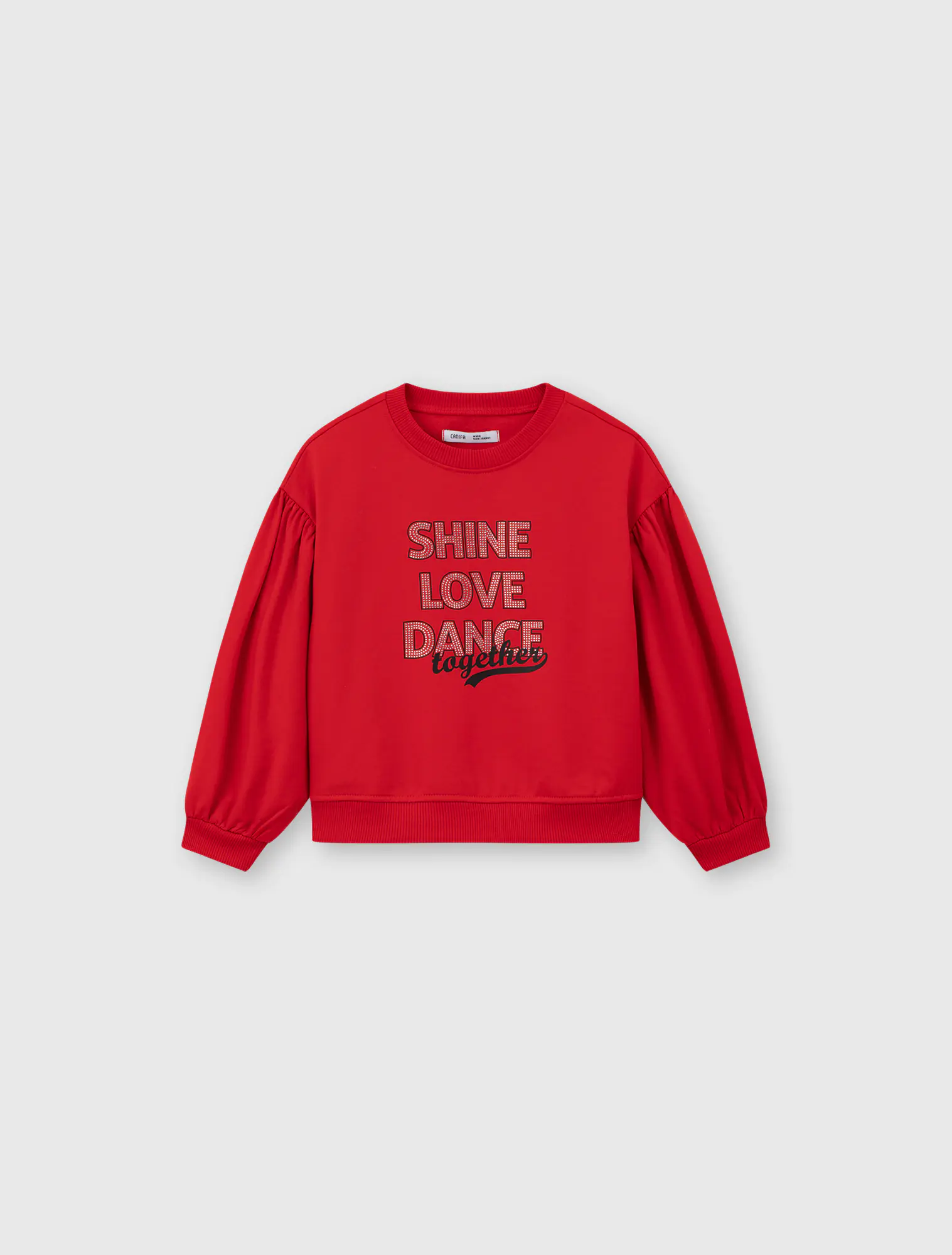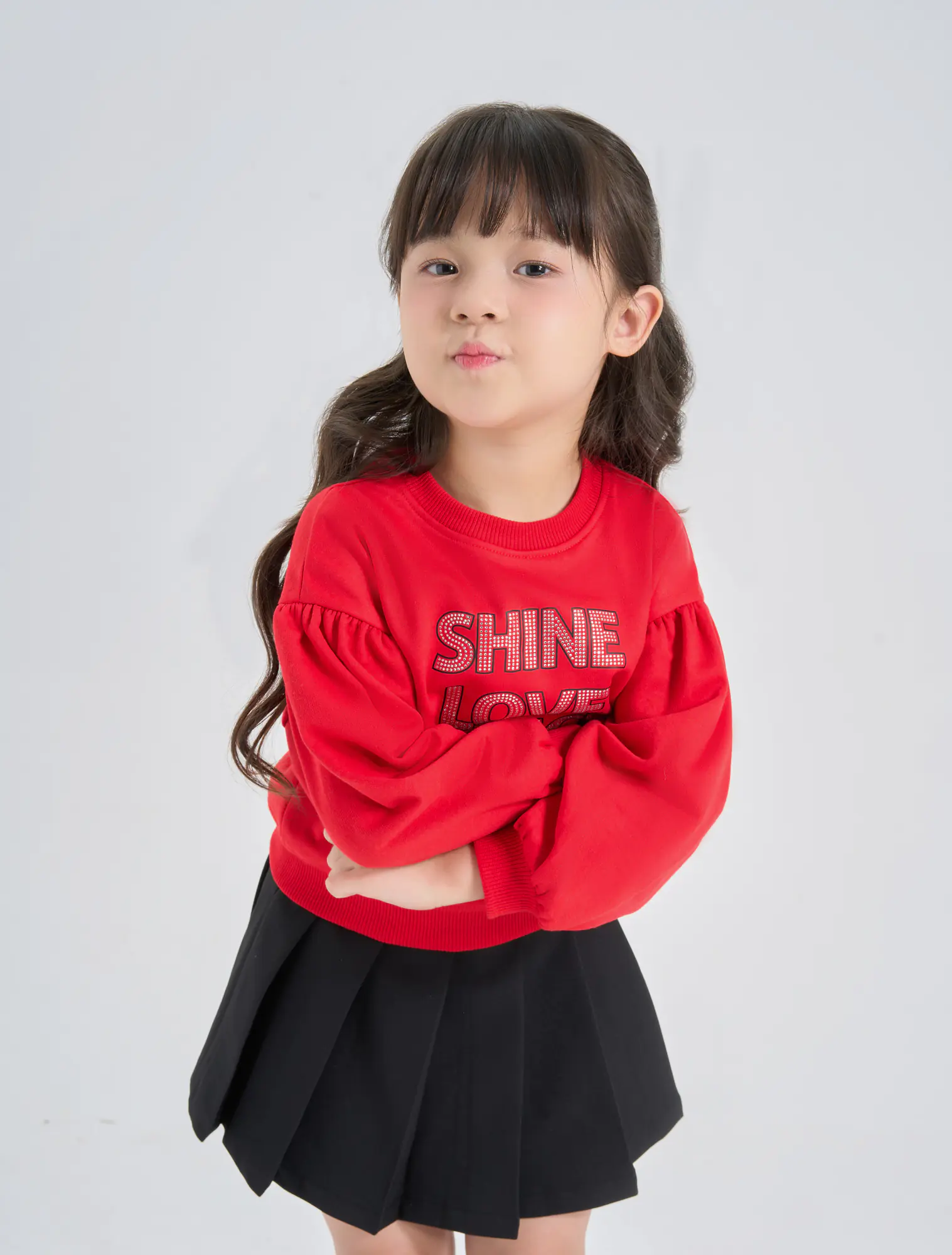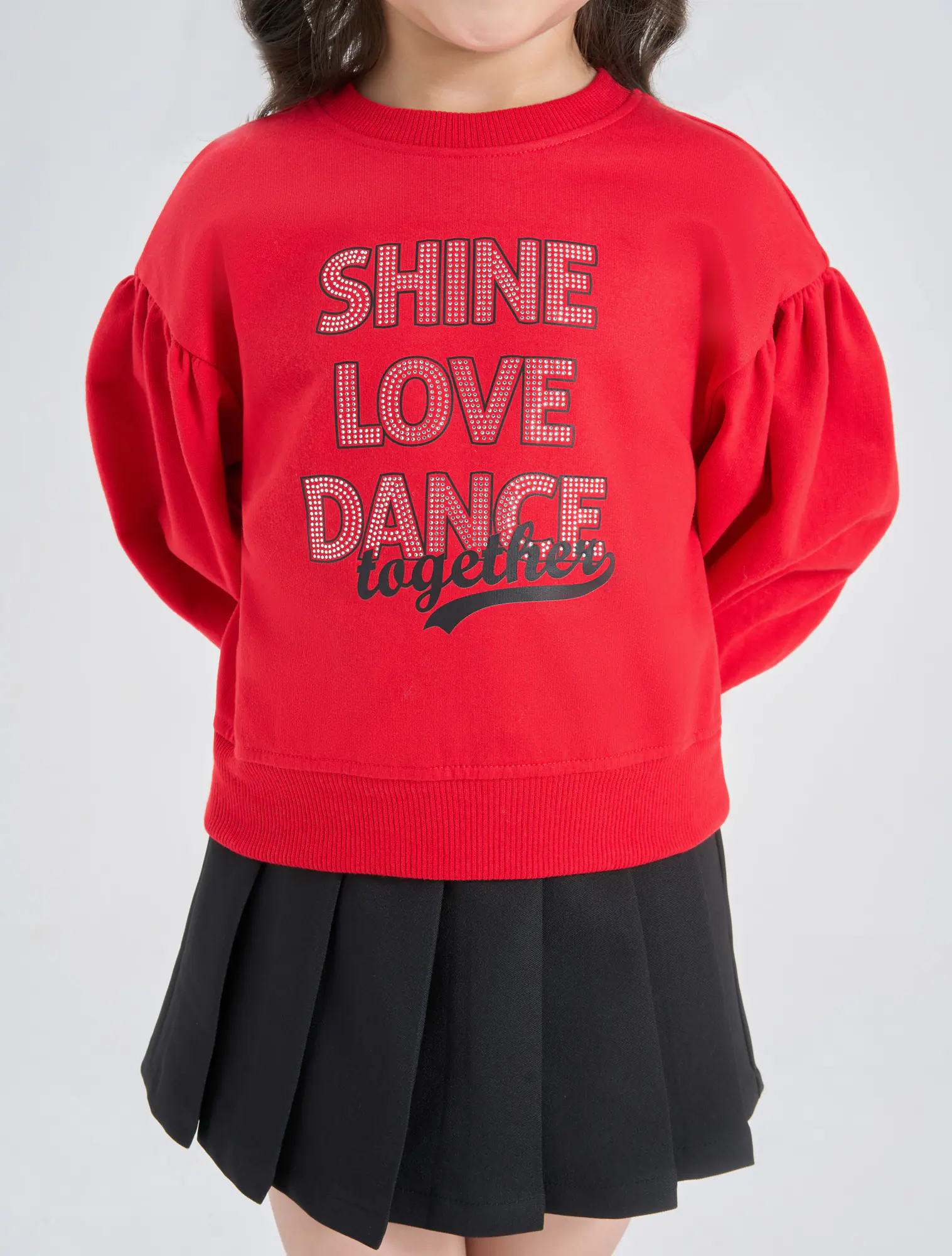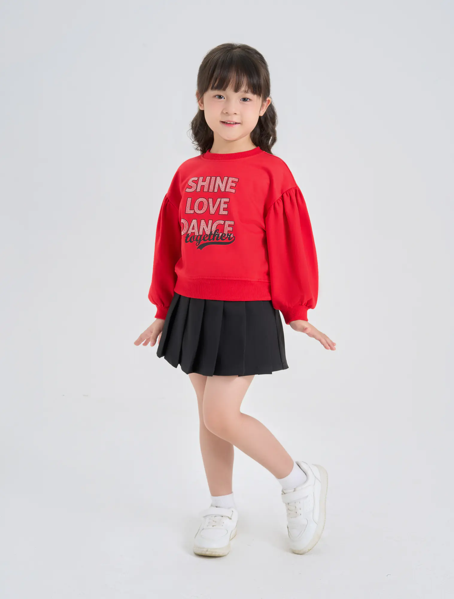 Áo nỉ bé gái cổ tròn, tay nhún phồng thời trang. Hình in đính đá lấp lánh, màu sắc tươi sáng, bắt mắt, dễ kết hợp trang phục, phù hợp nhiều hoàn cảnh sử dụng.