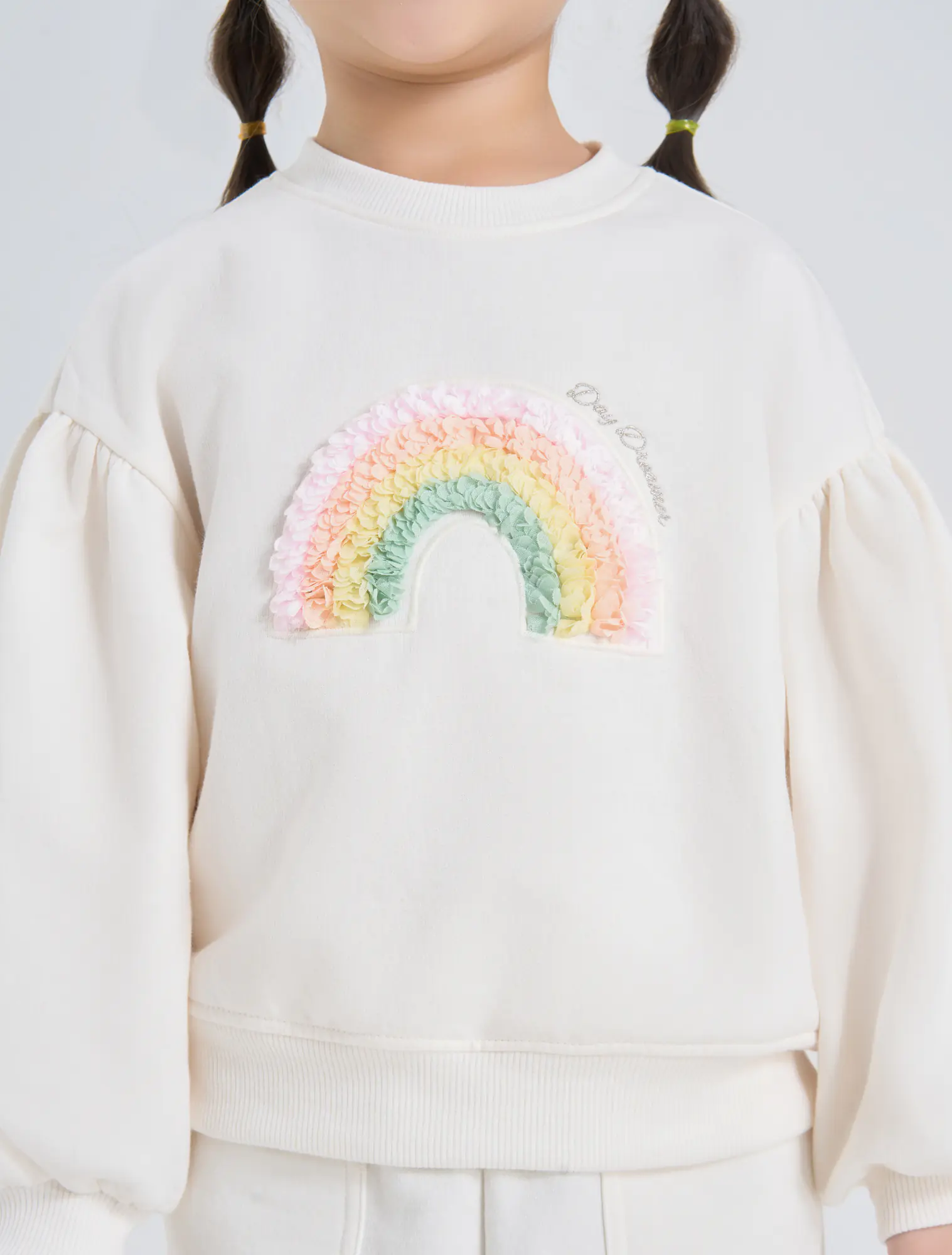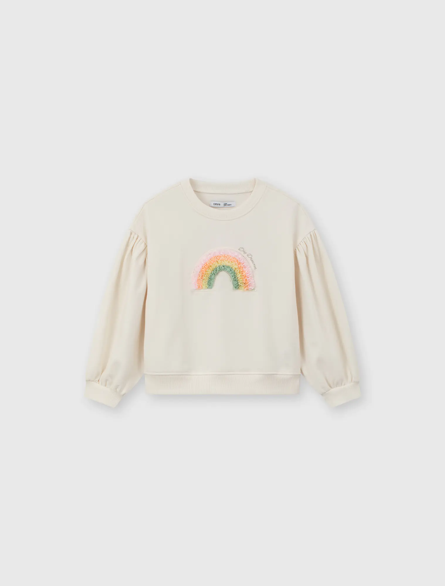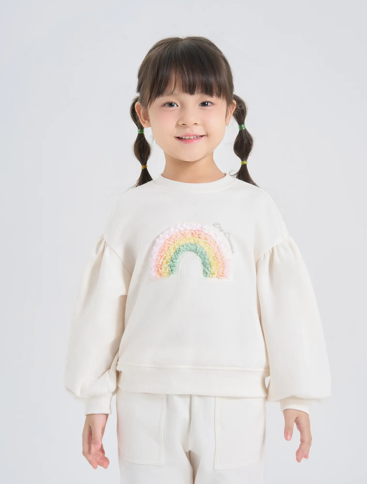 Áo nỉ bé gái cổ tròn, tay nhún phồng thời trang. Hình in đính đá lấp lánh, màu sắc tươi sáng, bắt mắt, dễ kết hợp trang phục, phù hợp nhiều hoàn cảnh sử dụng.