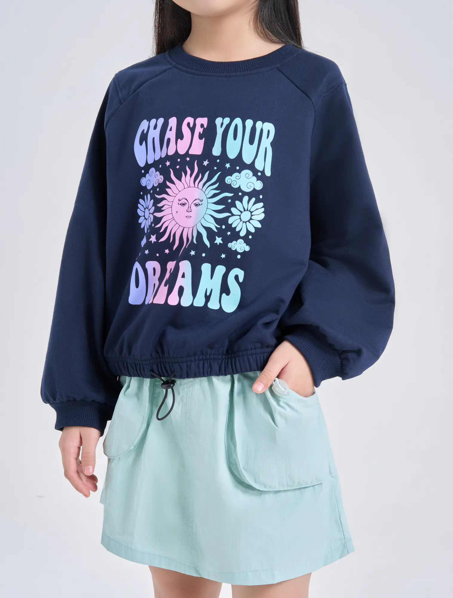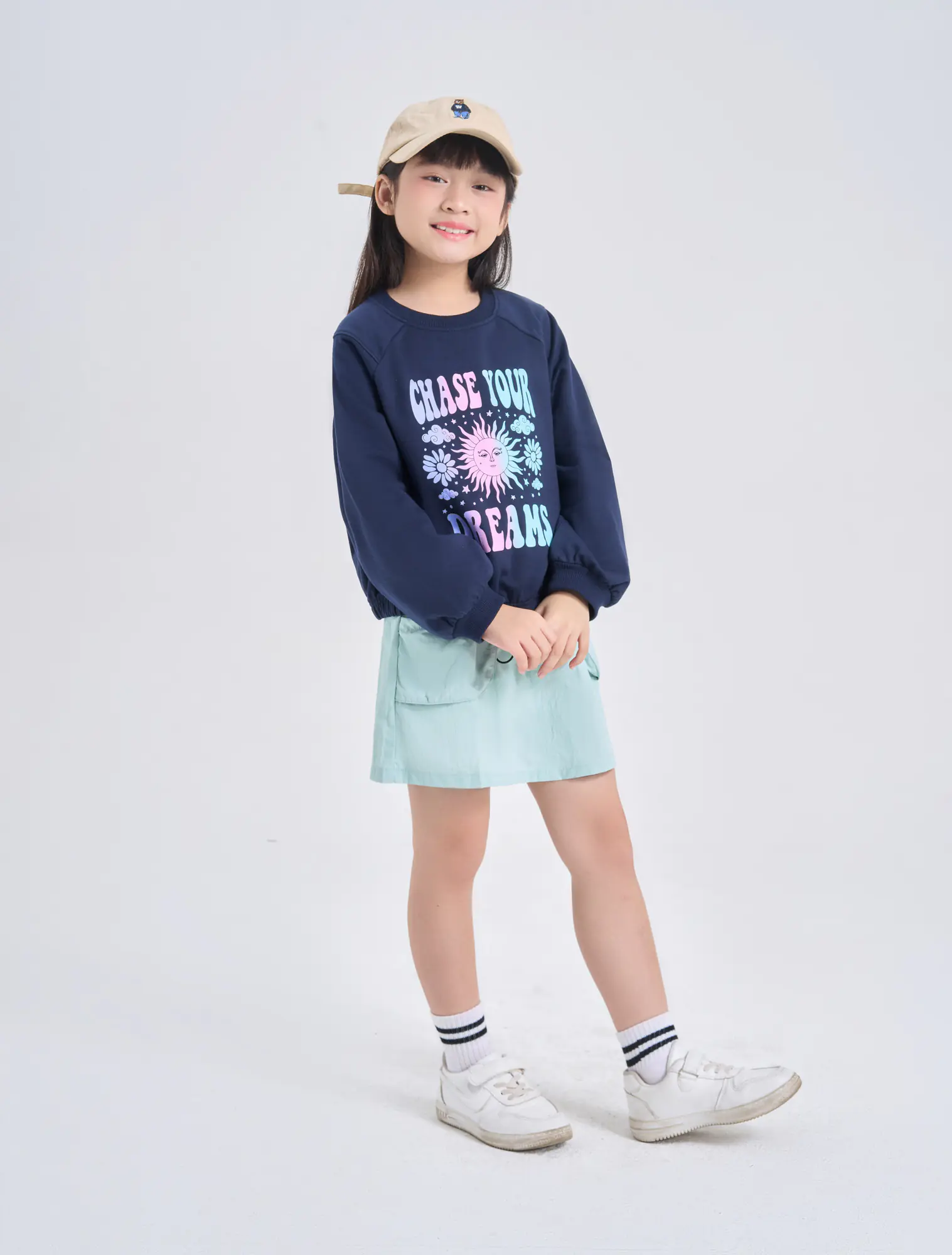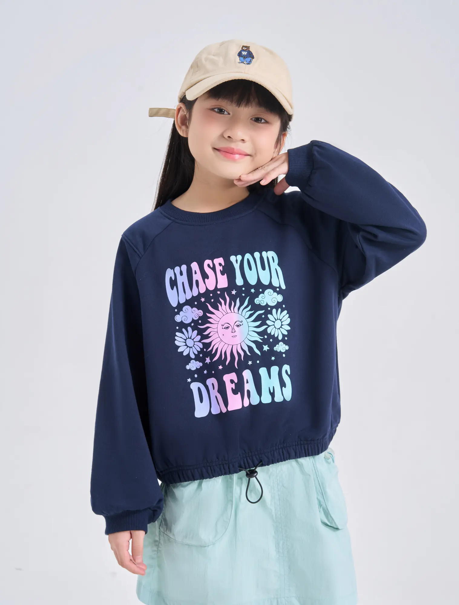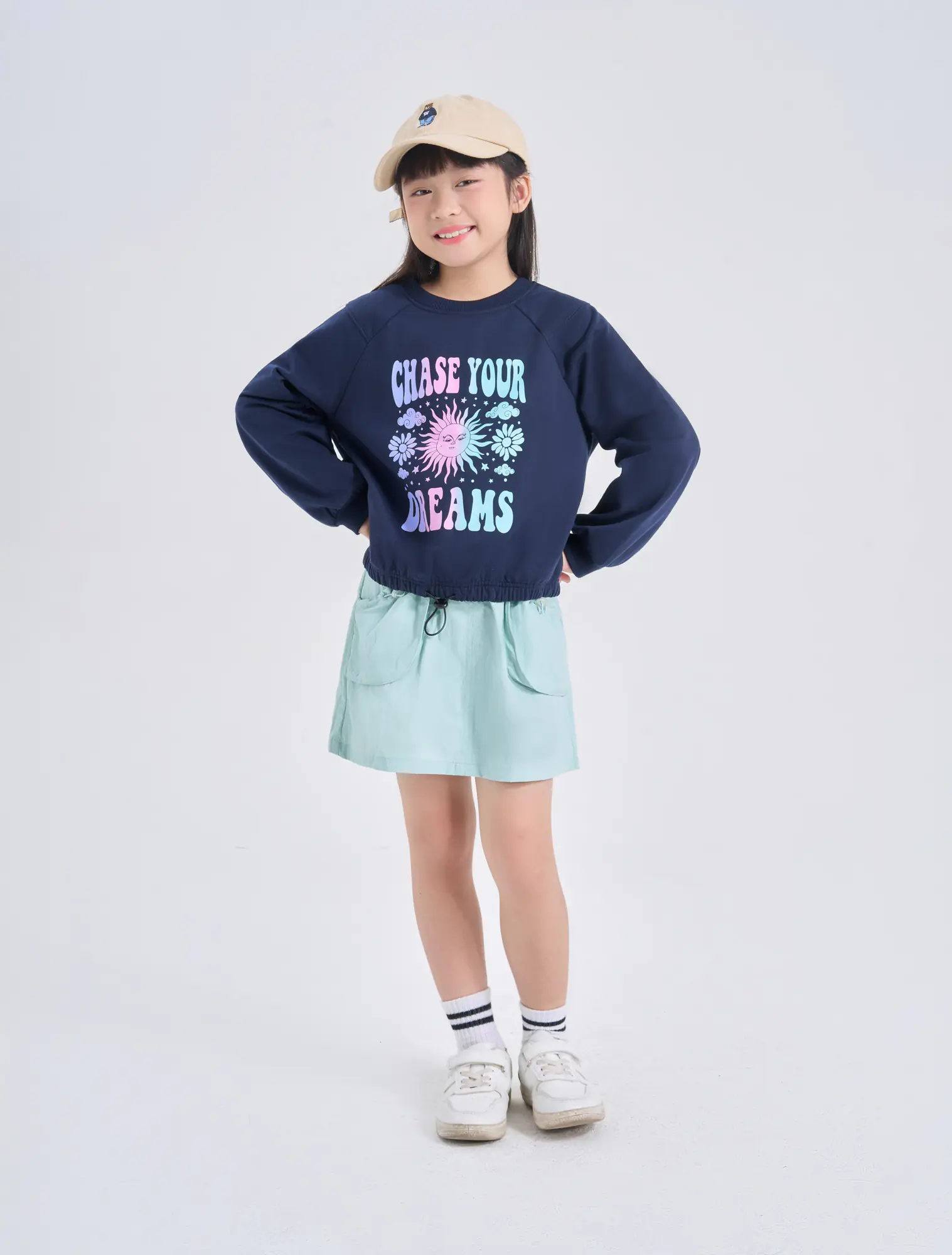 Áo nỉ bé gái dáng croptop. Chi tiết gấu áo rút chun hiện đại, dễ dàng kết hợp trang phục. Màu sắc phong phú, tươi sáng, hình in dễ thương.