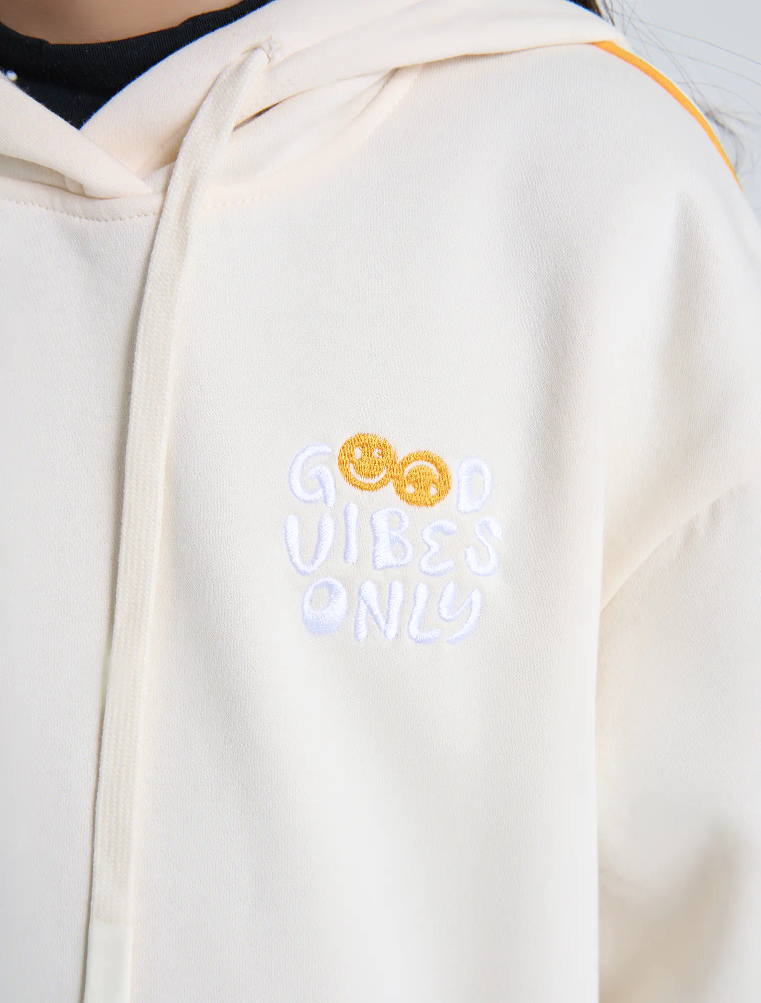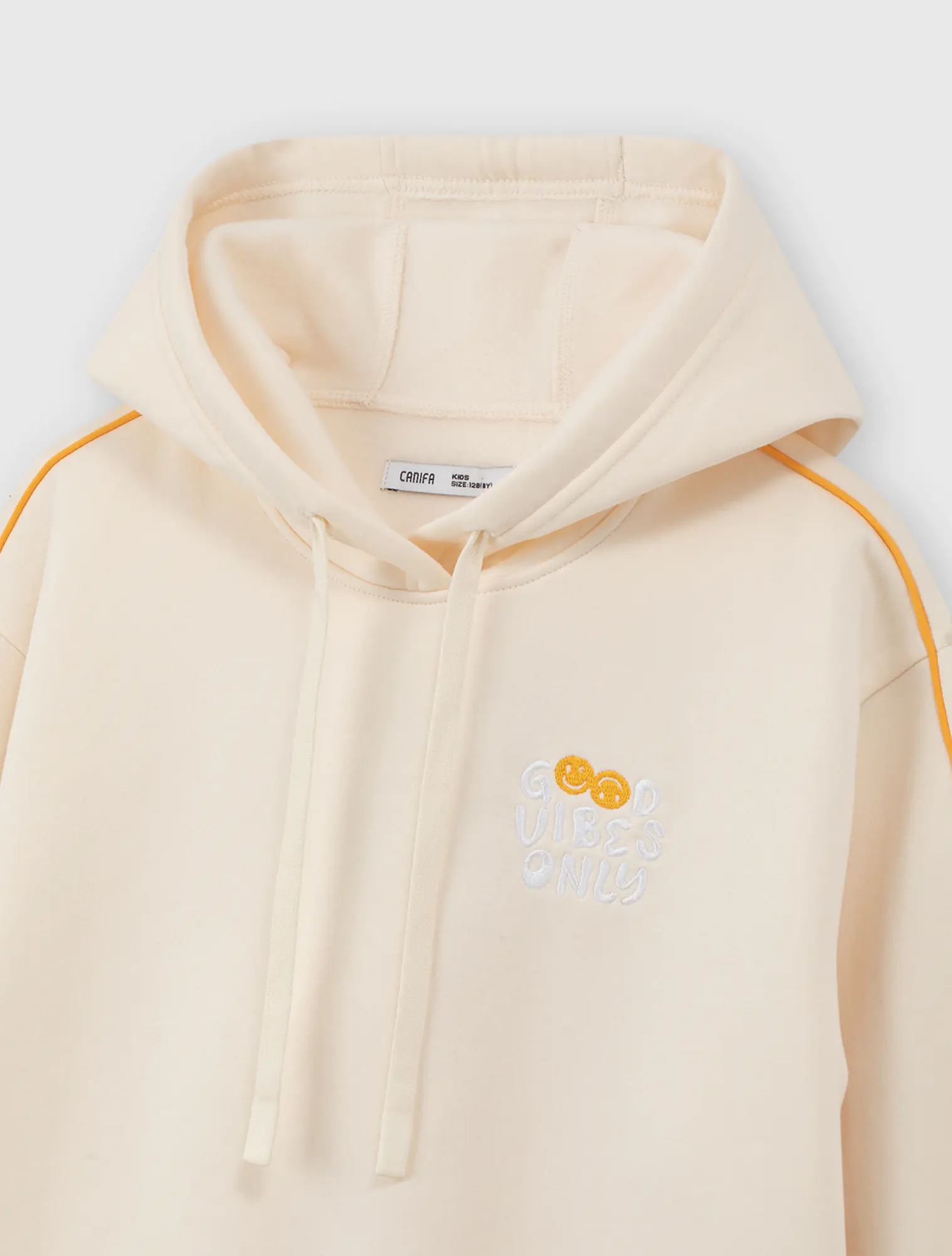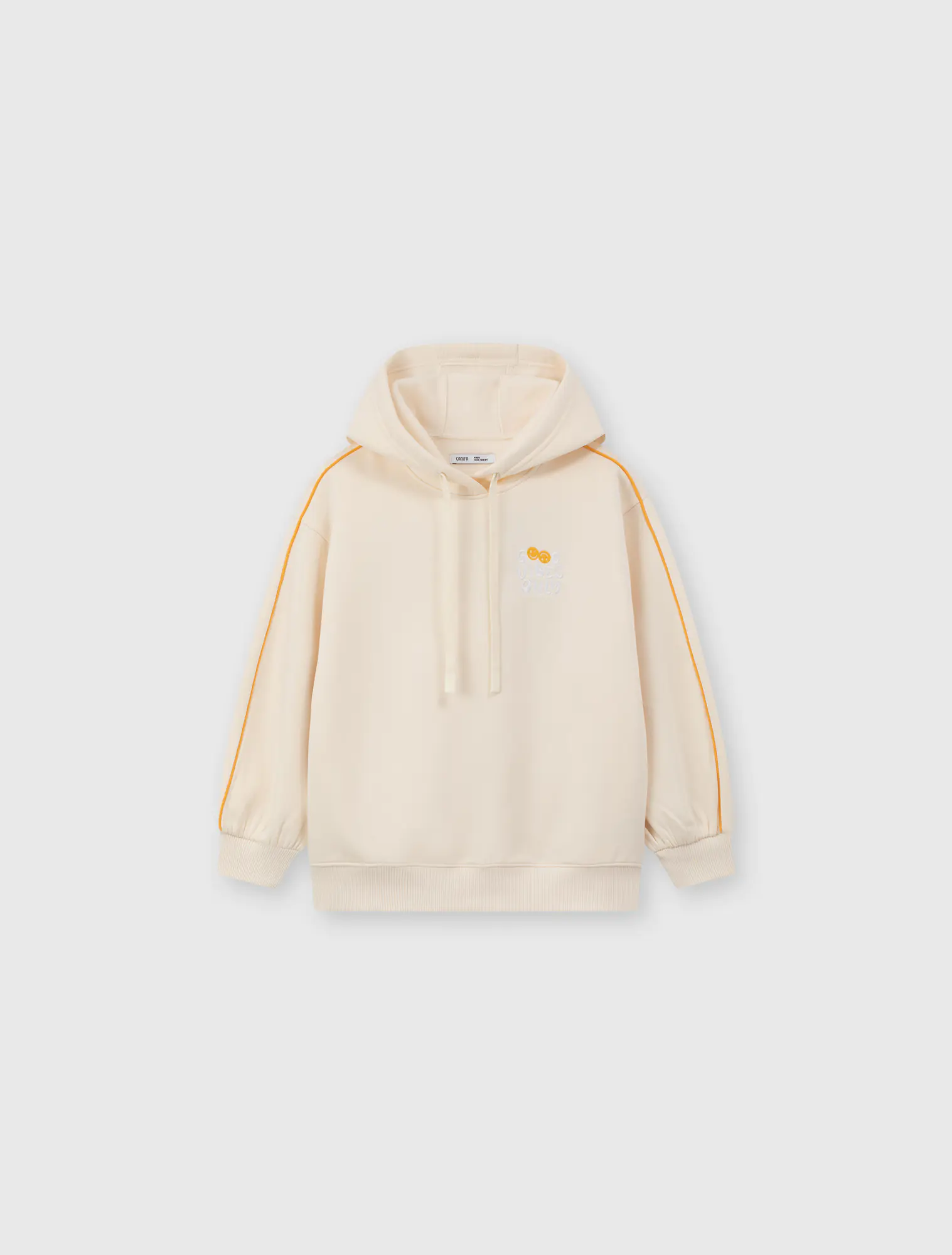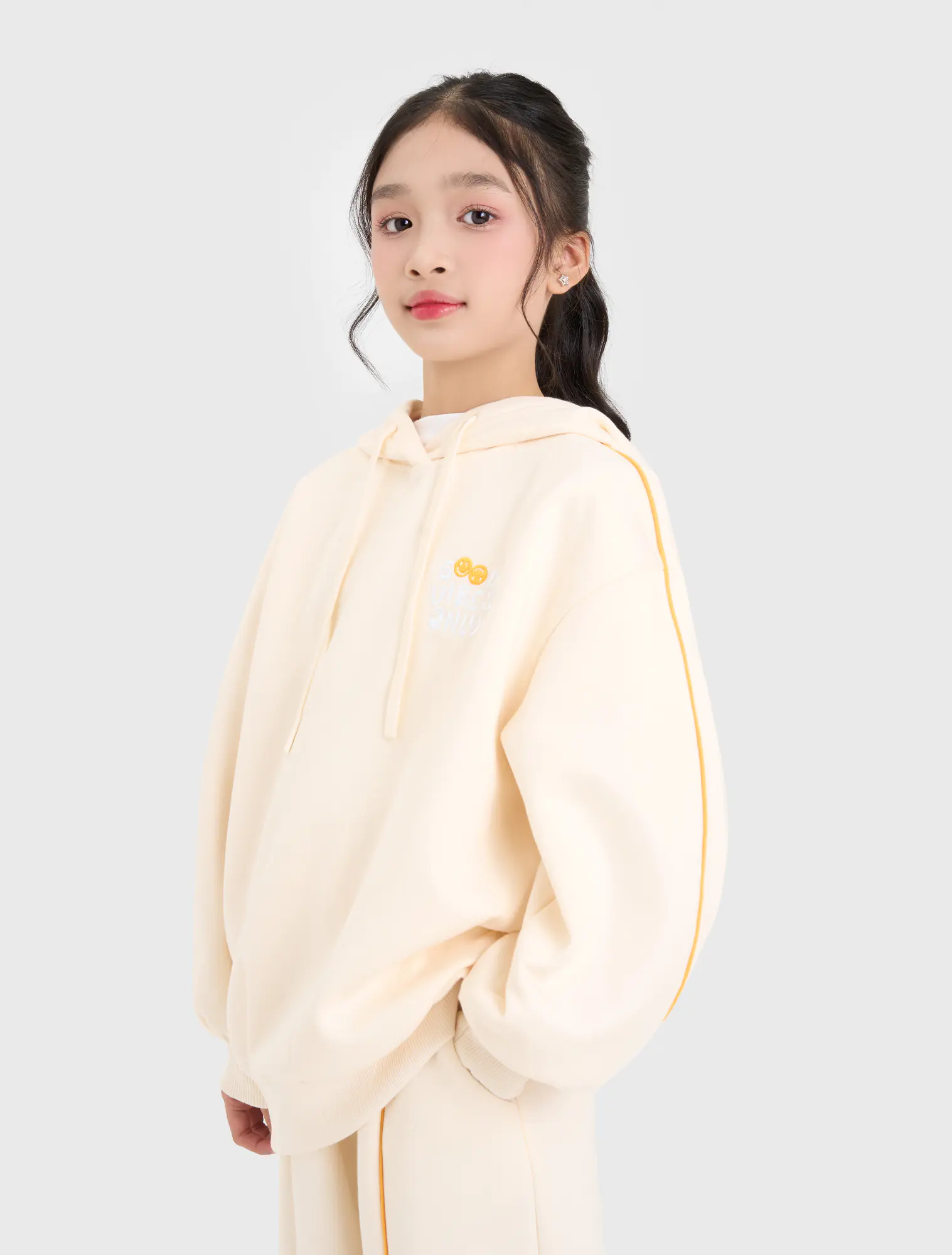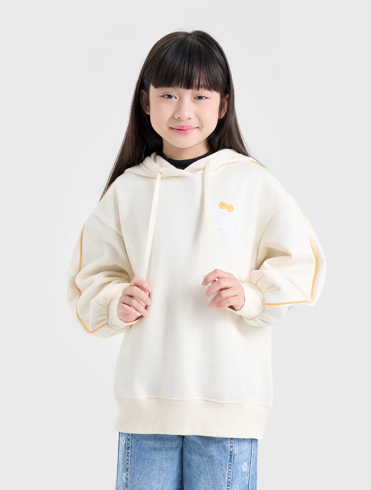 Áo hoodie bé gái. Tay áo kẹp lé dây phối màu hiện đại, màu sắc tươi sáng nữ tính. HÌnh thêu ngực trang trí.
