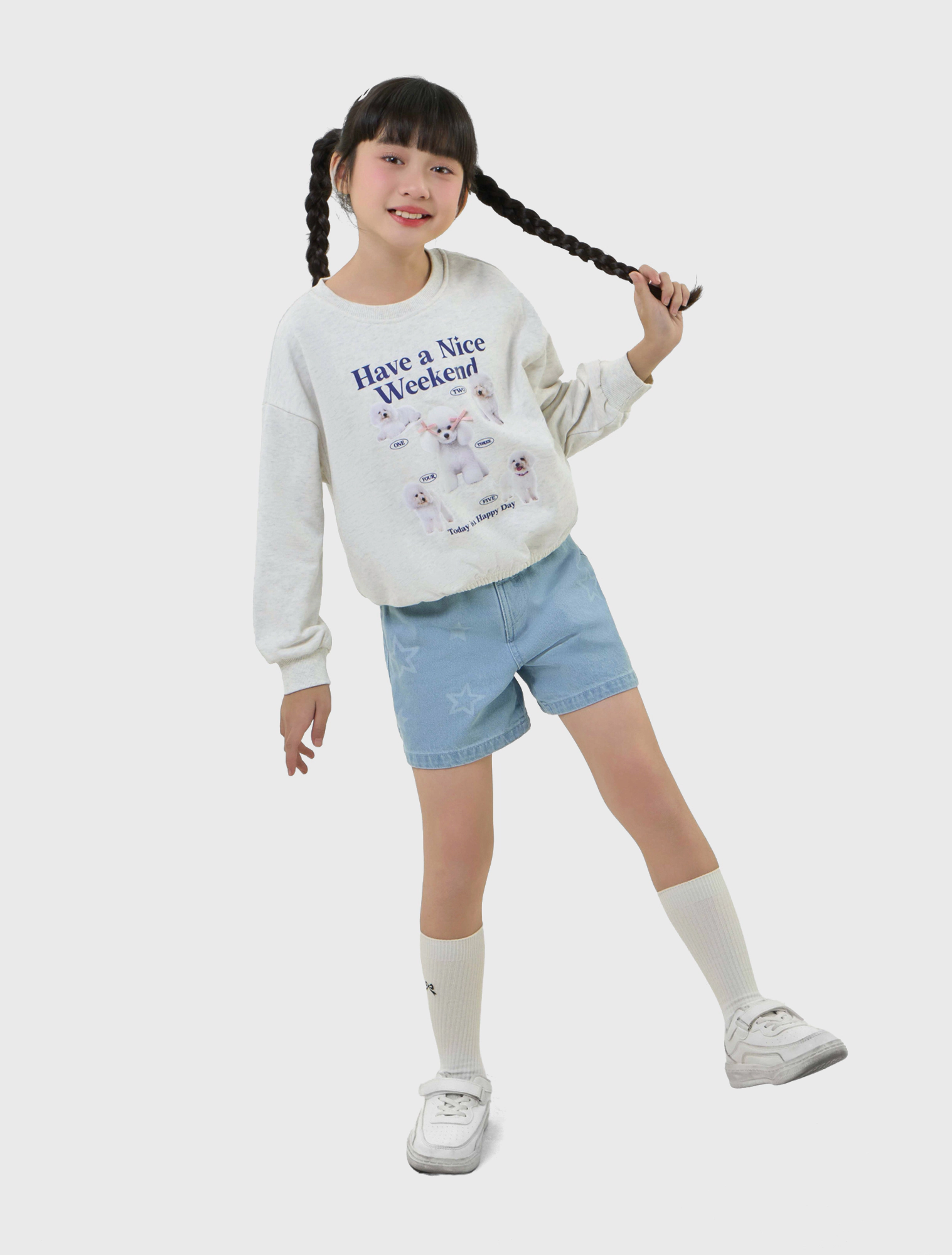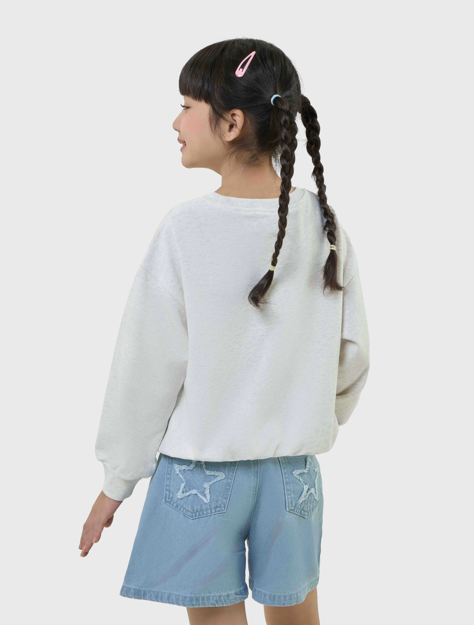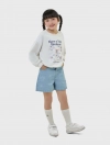 Áo nỉ bé gái có hình in, gấu áo bo chun gọn gàng.