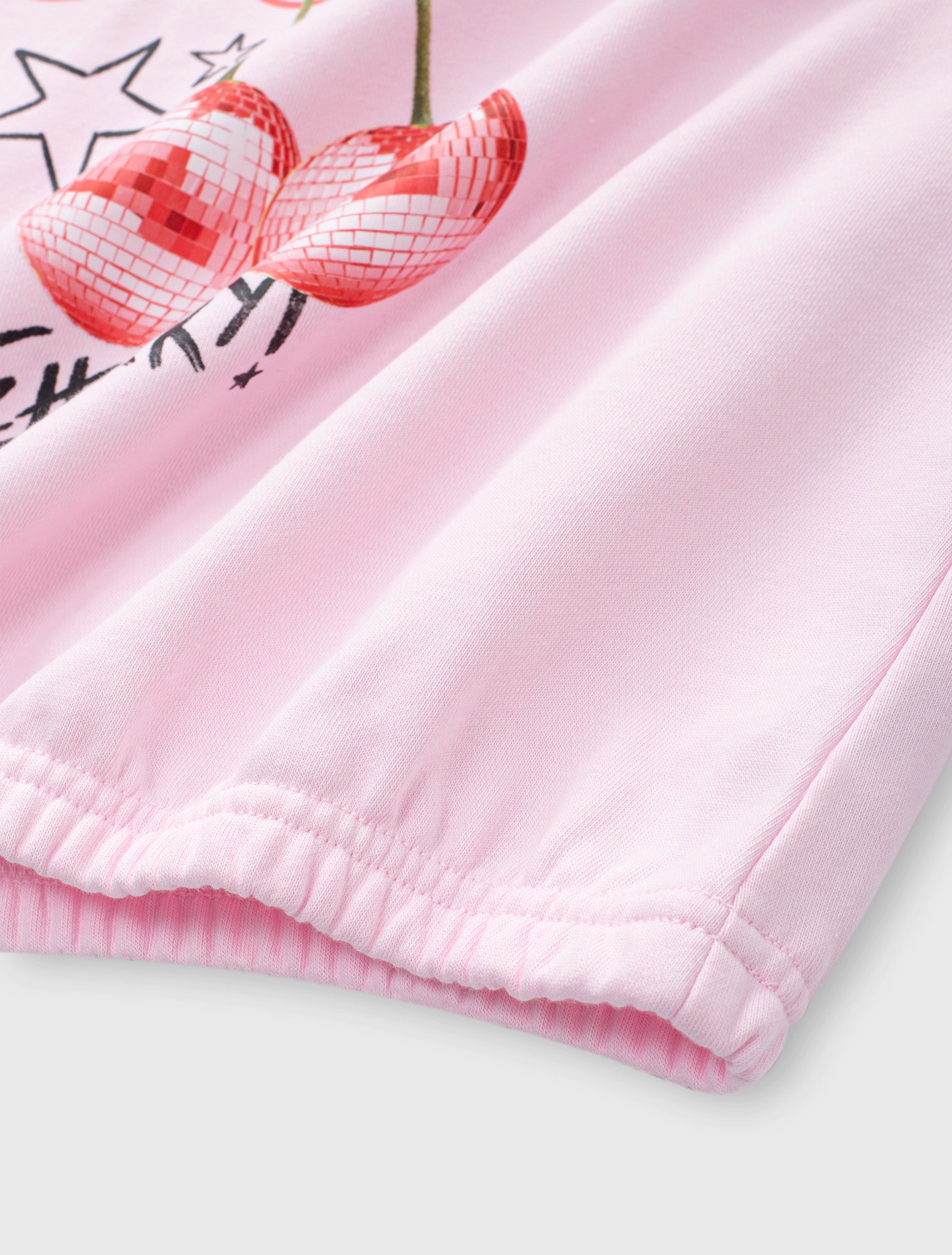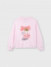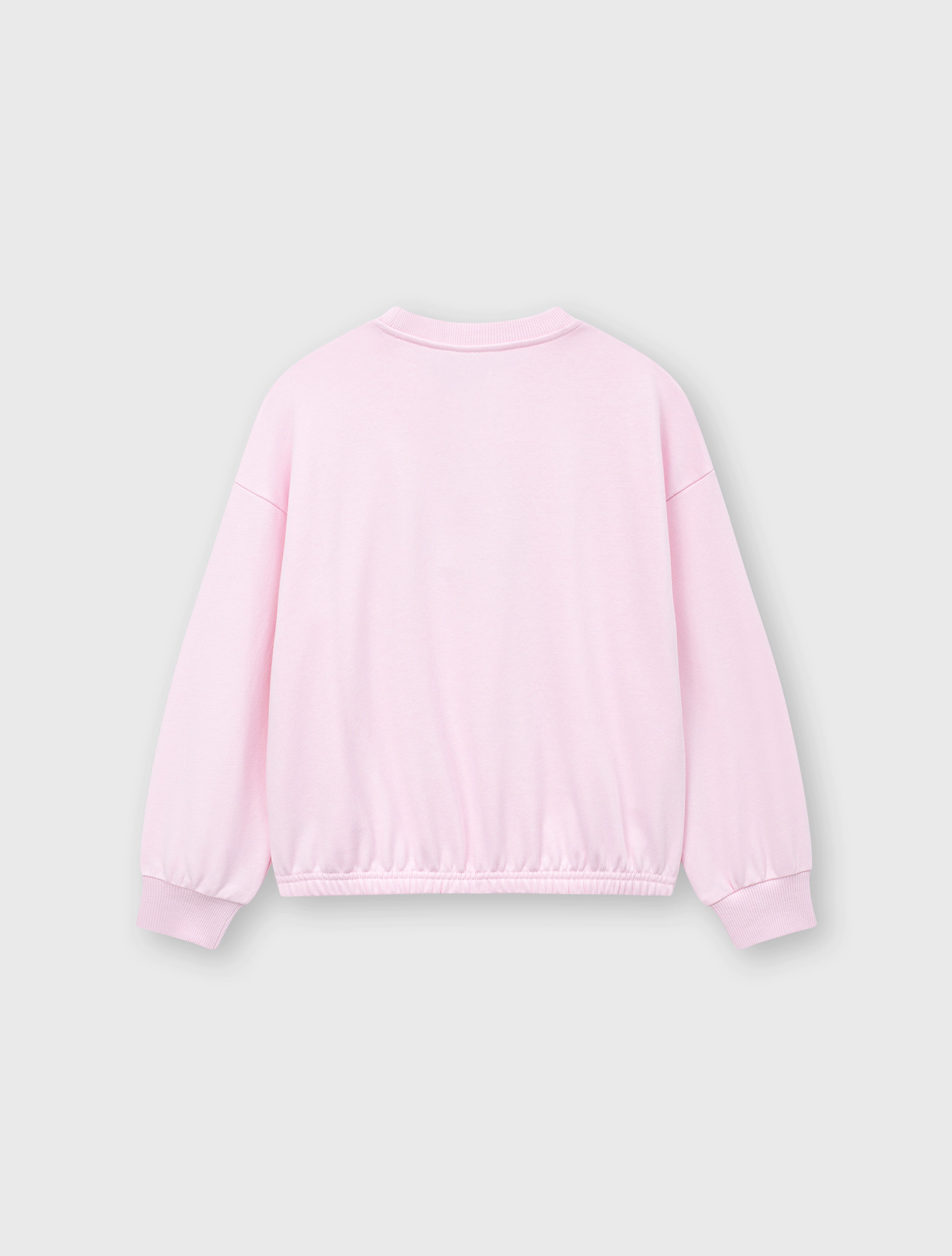 Áo nỉ bé gái có hình in, gấu áo bo chun gọn gàng.