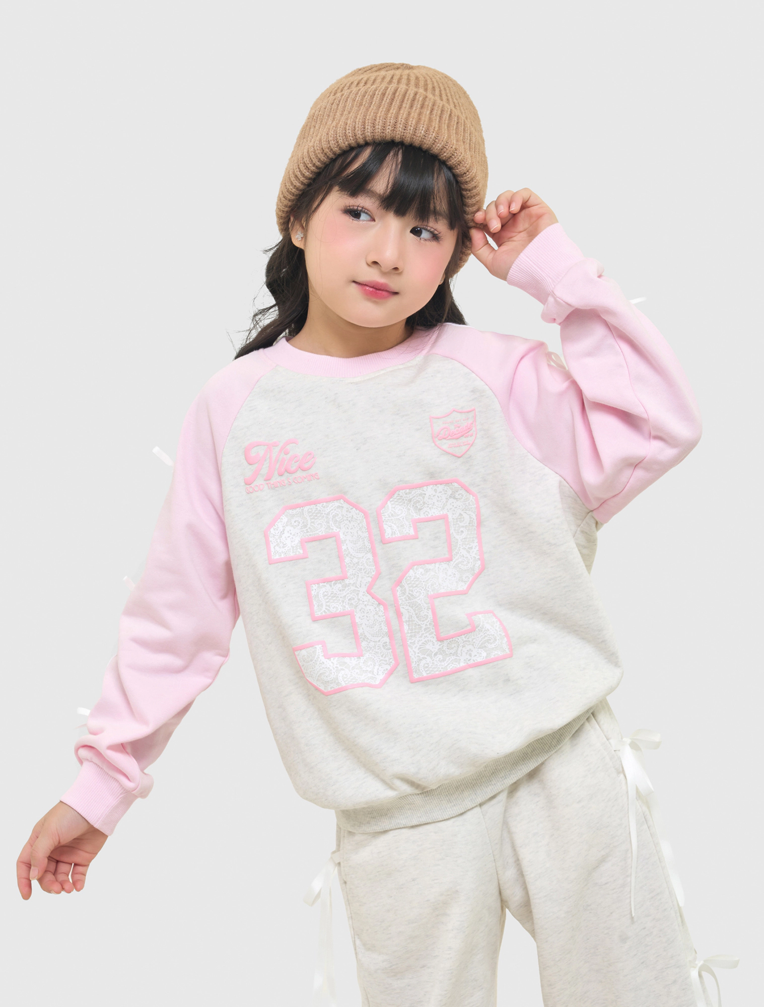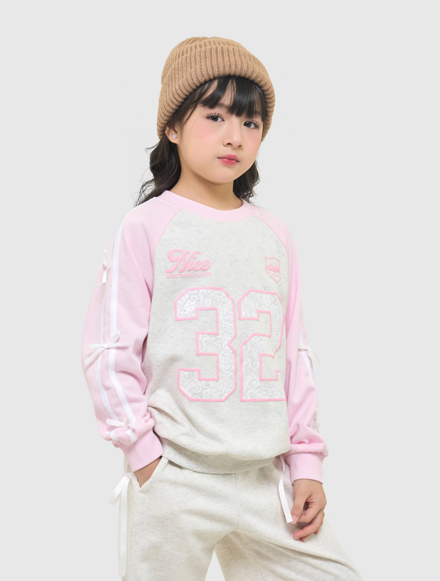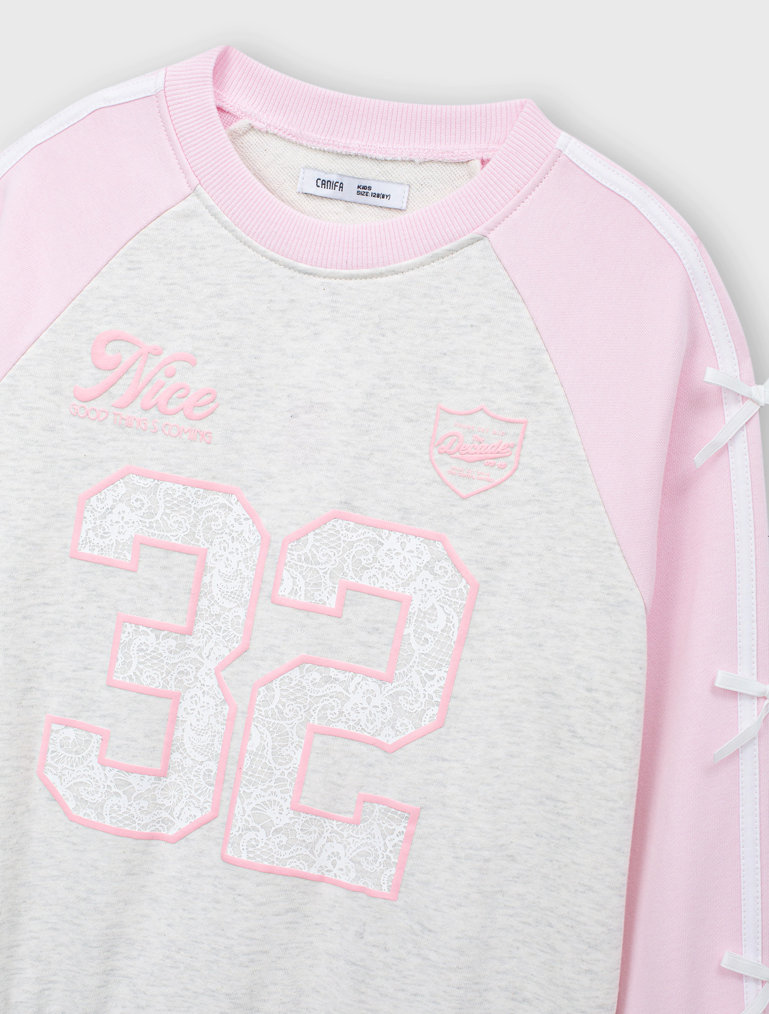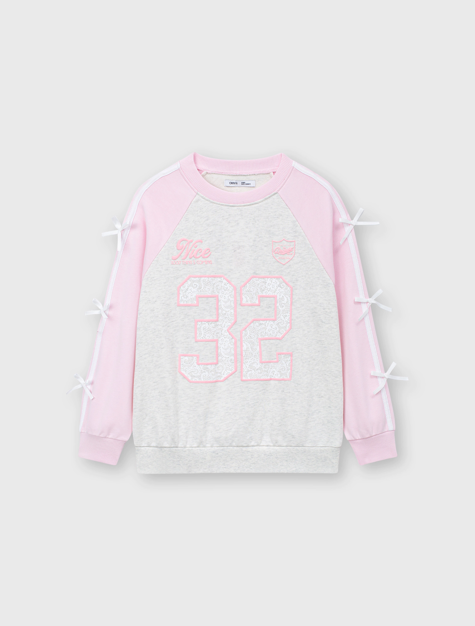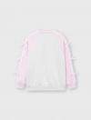 Áo nỉ bé gái có hình in, thiết kế phom dáng suông dễ mặc, tay áo Zaglang phối màu và trang trí dây đè dọc kèm nơ đính thời trang, cá tính, phù hợp với bé gái.