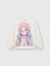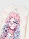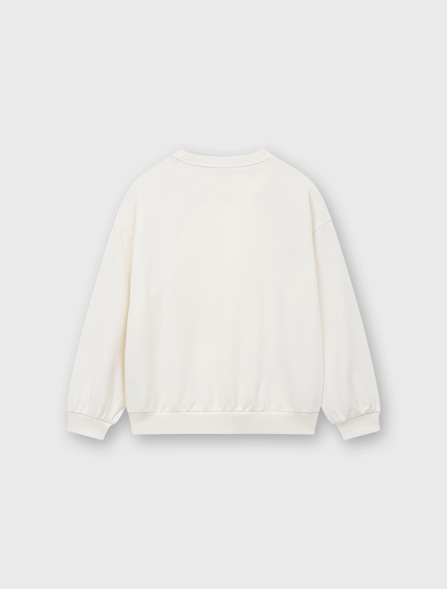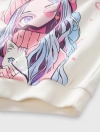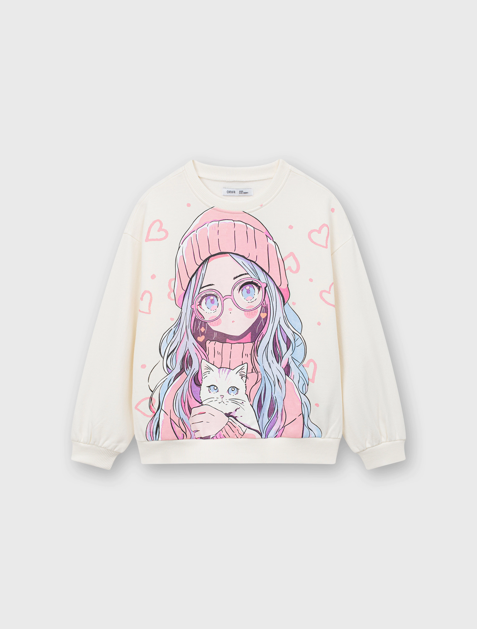 Áo nỉ bé gái. Phom áo cơ bản, cổ tròn dễ mặc. Màu sắc tươi sáng, hình in dễ thương phù hợp bé gái. Chất liệu Cotton pha mềm mại, giữ ấm tốt