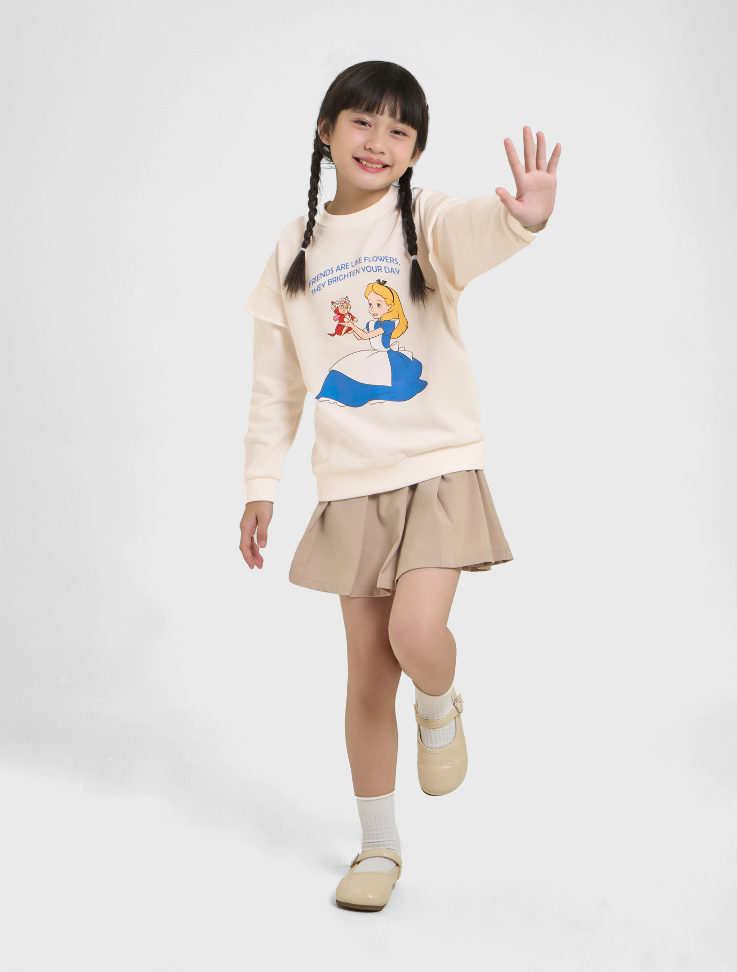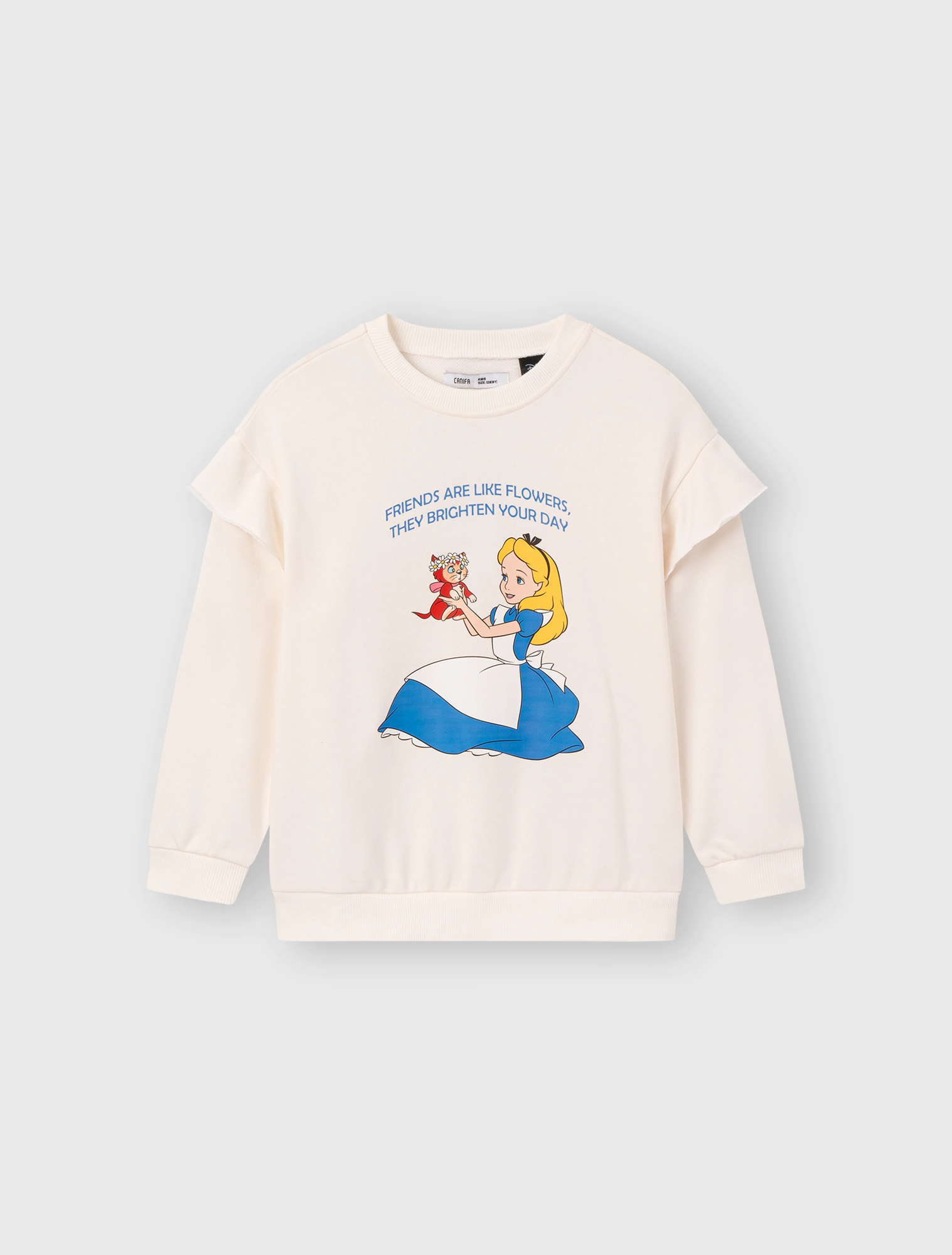 Áo nỉ bé gái dài tay hình in Alice, phom dáng cơ bản dễ mặc.
