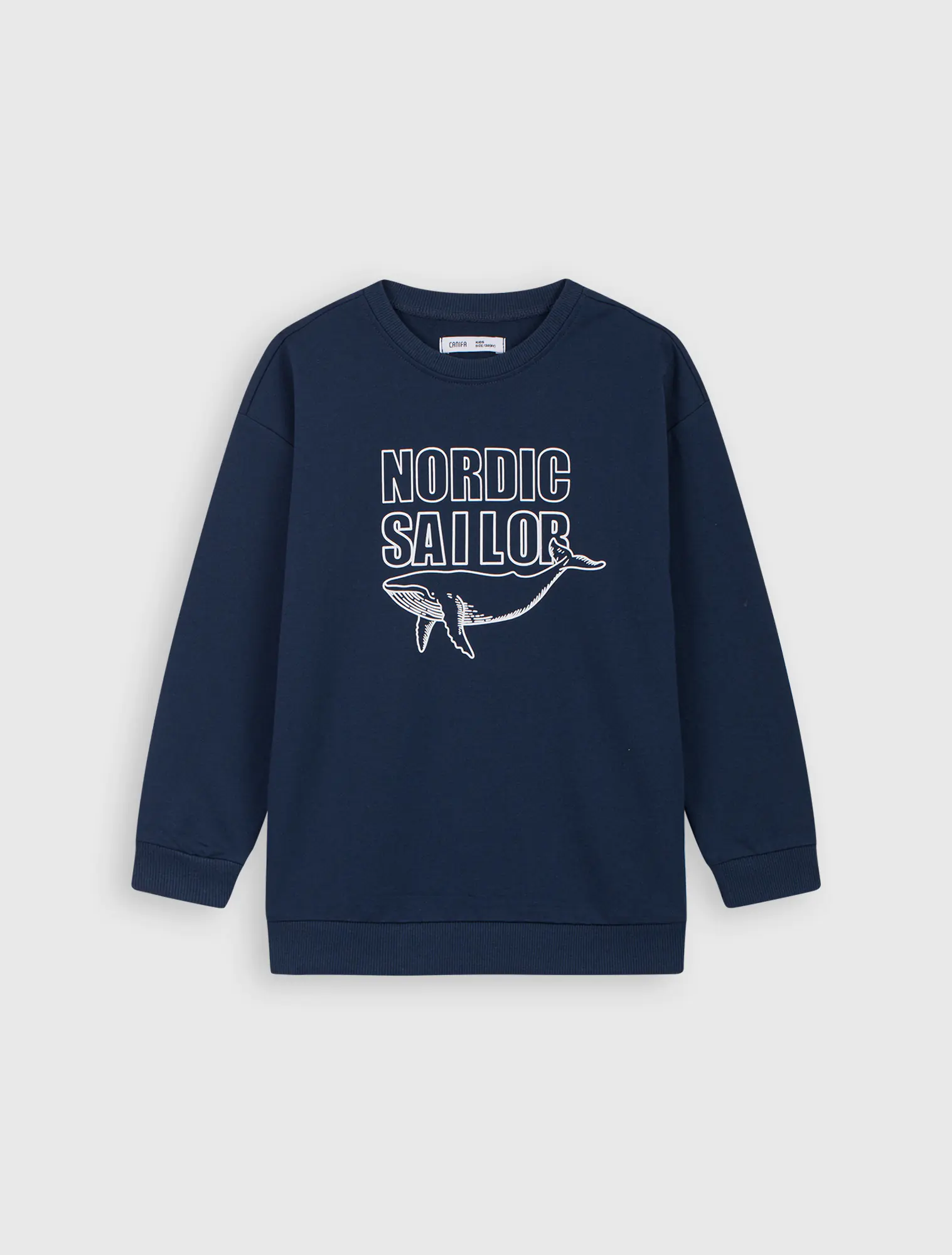Áo nỉ chất liệu cotton pha, cổ tròn có hình in.