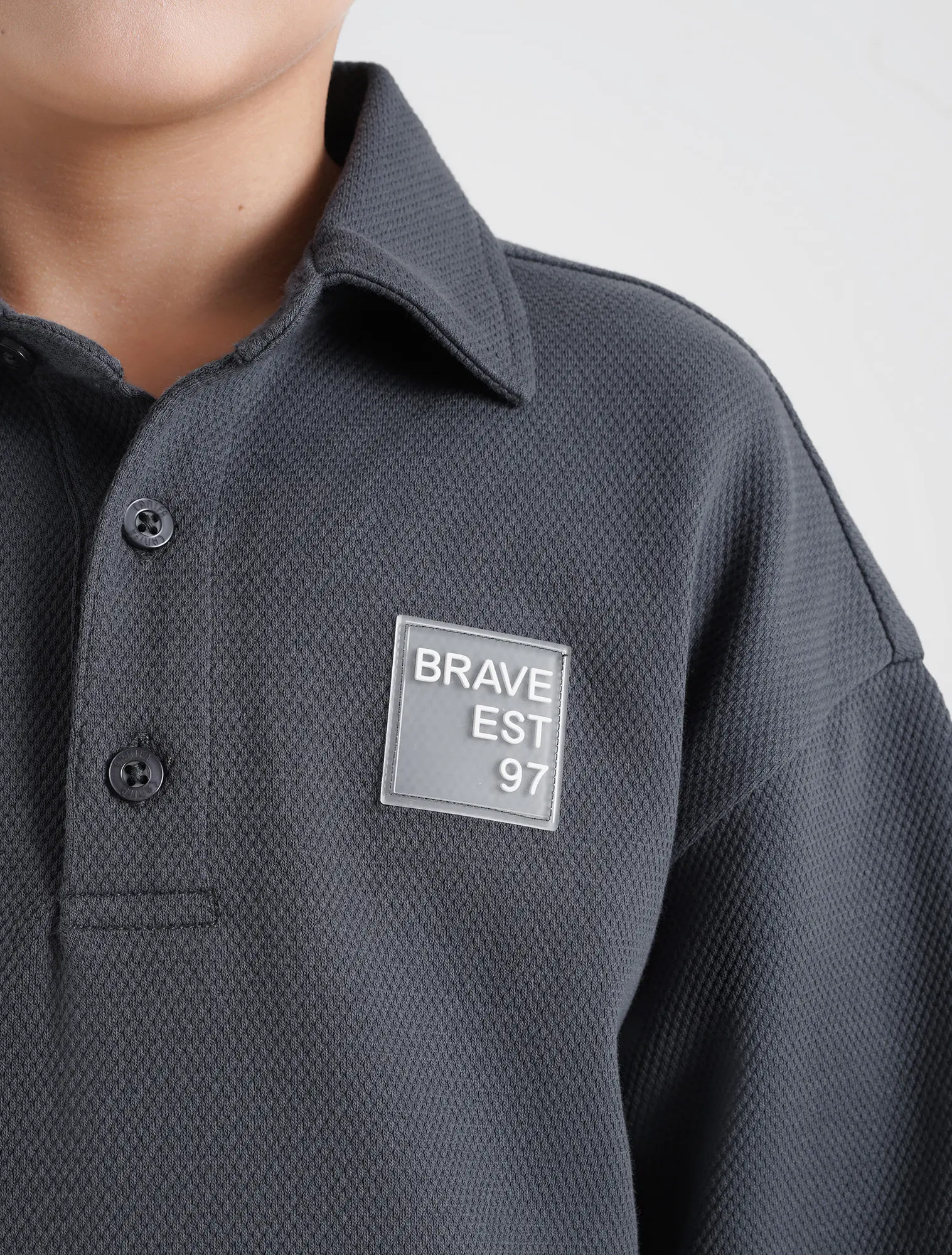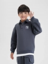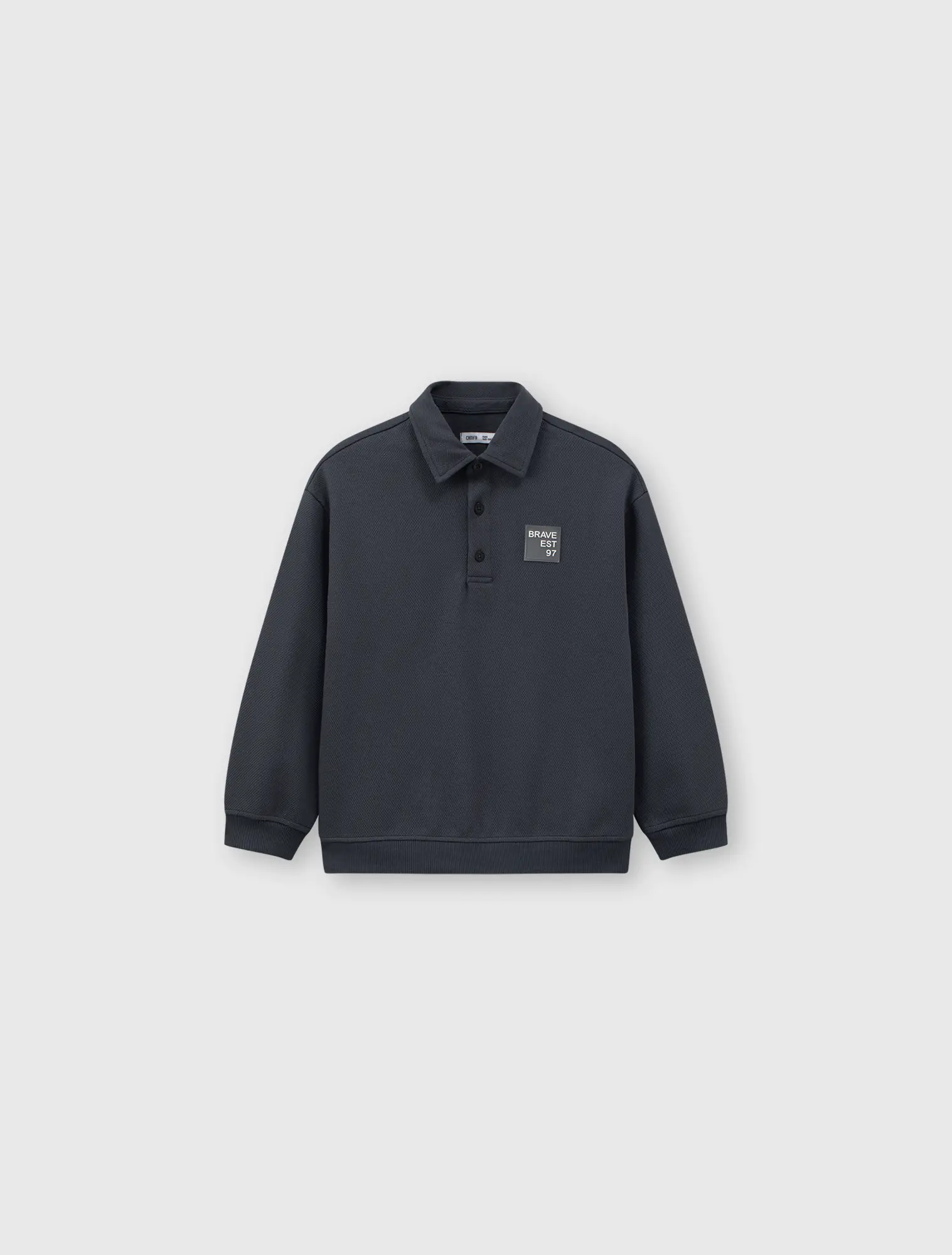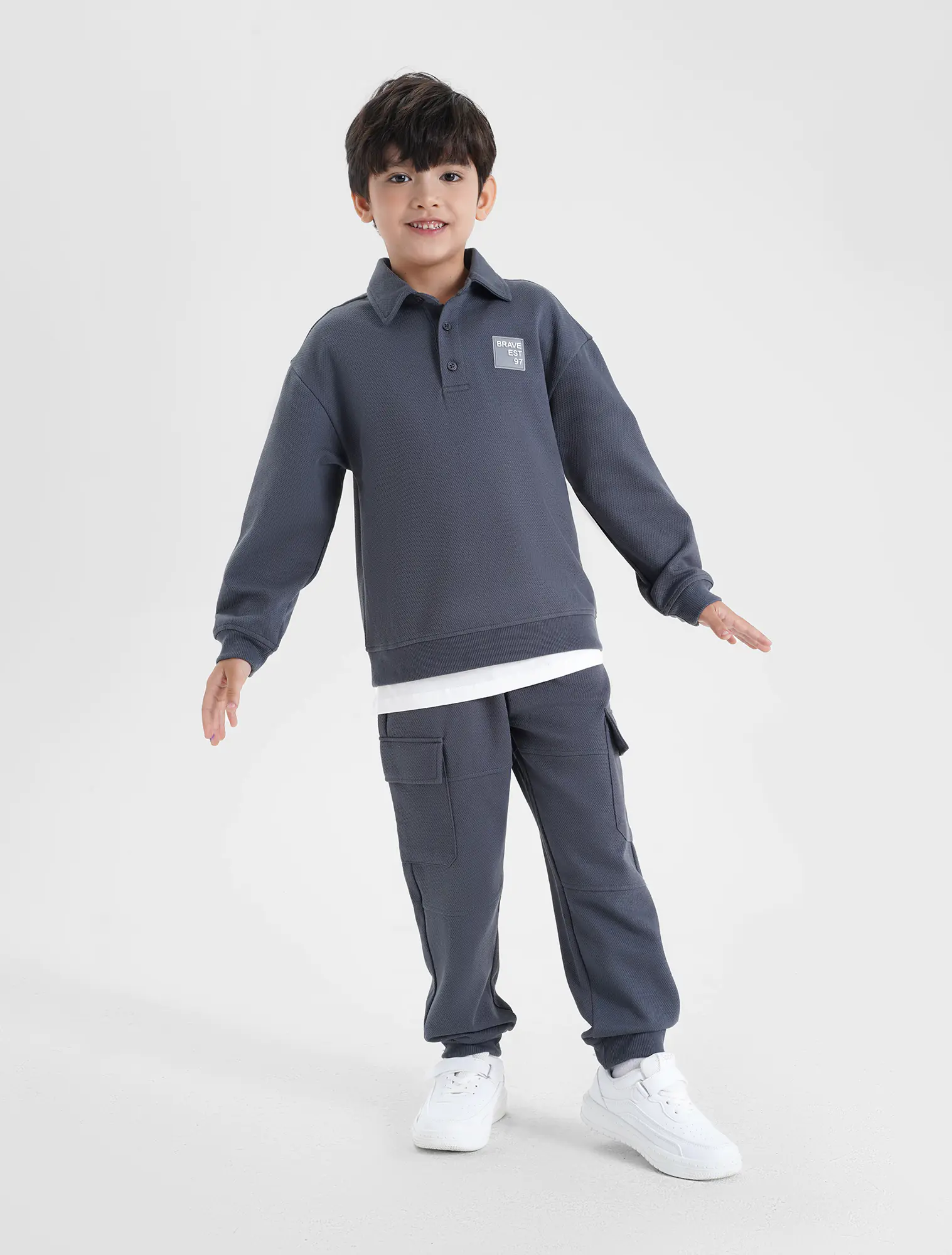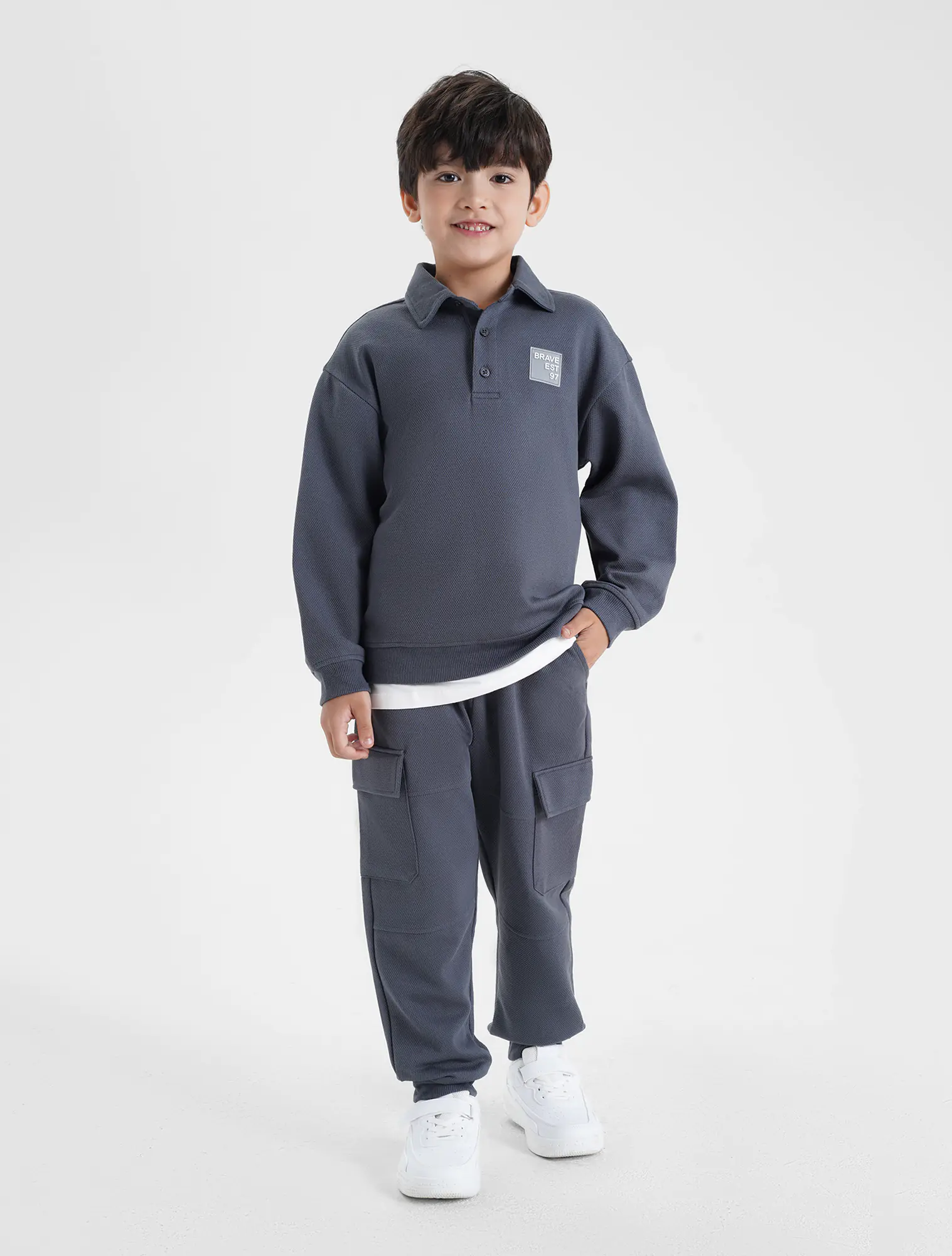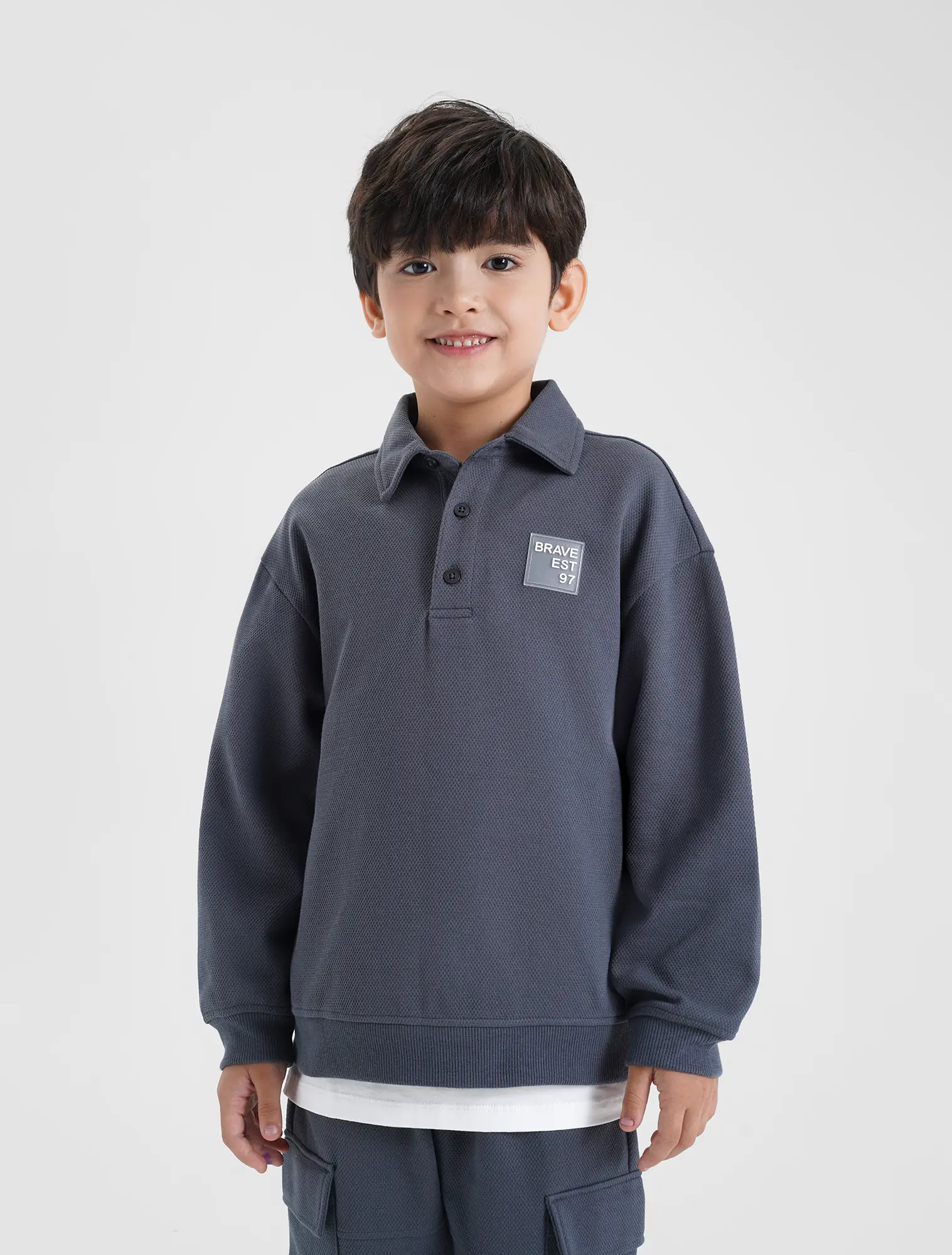Áo nỉ bé trai cổ polo, chất liệu cotton pha, bề mặt interlock kiểu tạo sự lạ mắt mới lạ. Phom dáng rộng rãi thoải mái cho trẻ vận động và vui chơi cũng như sử dụng trong nhiều hoàn cảnh.