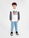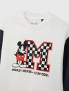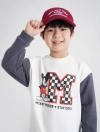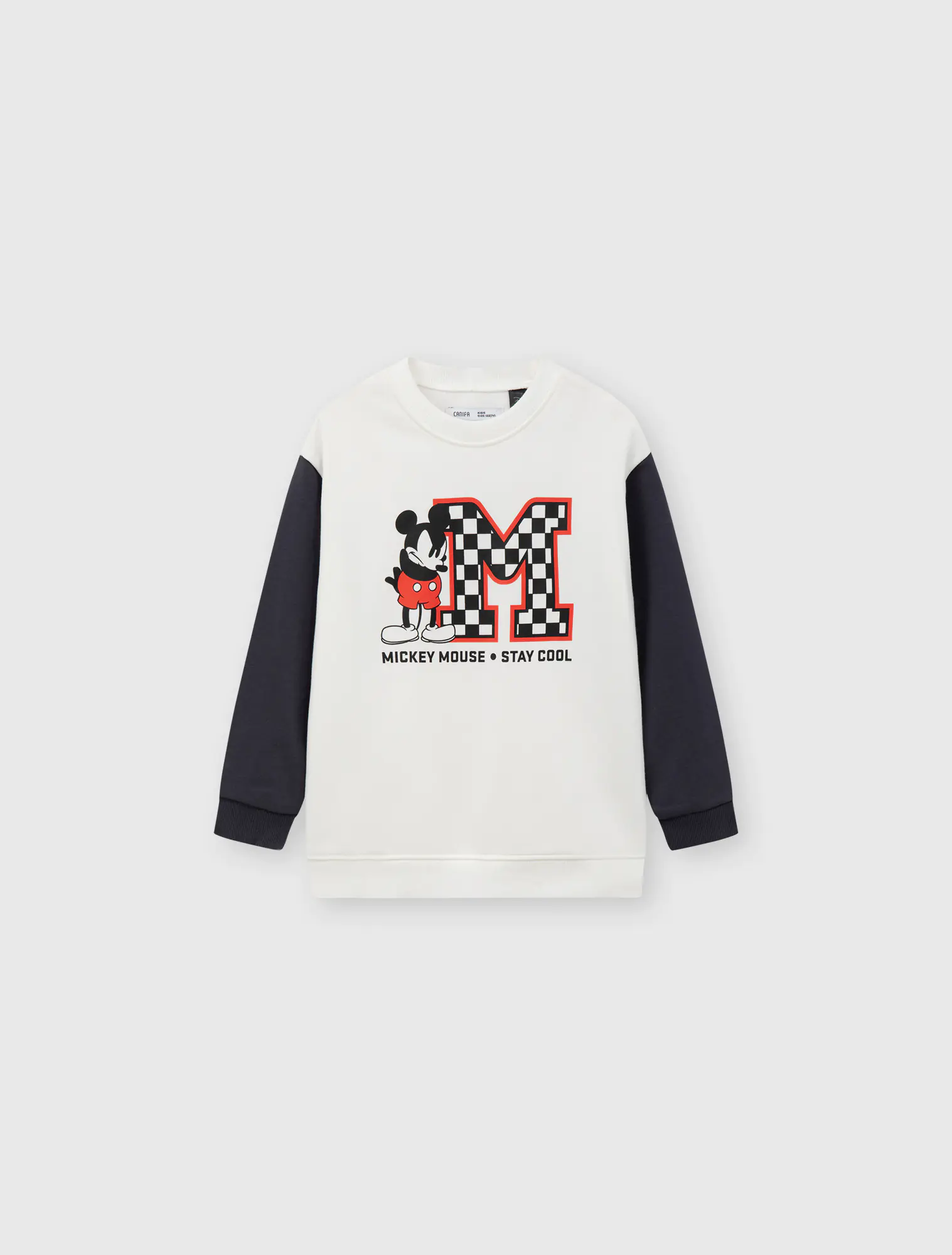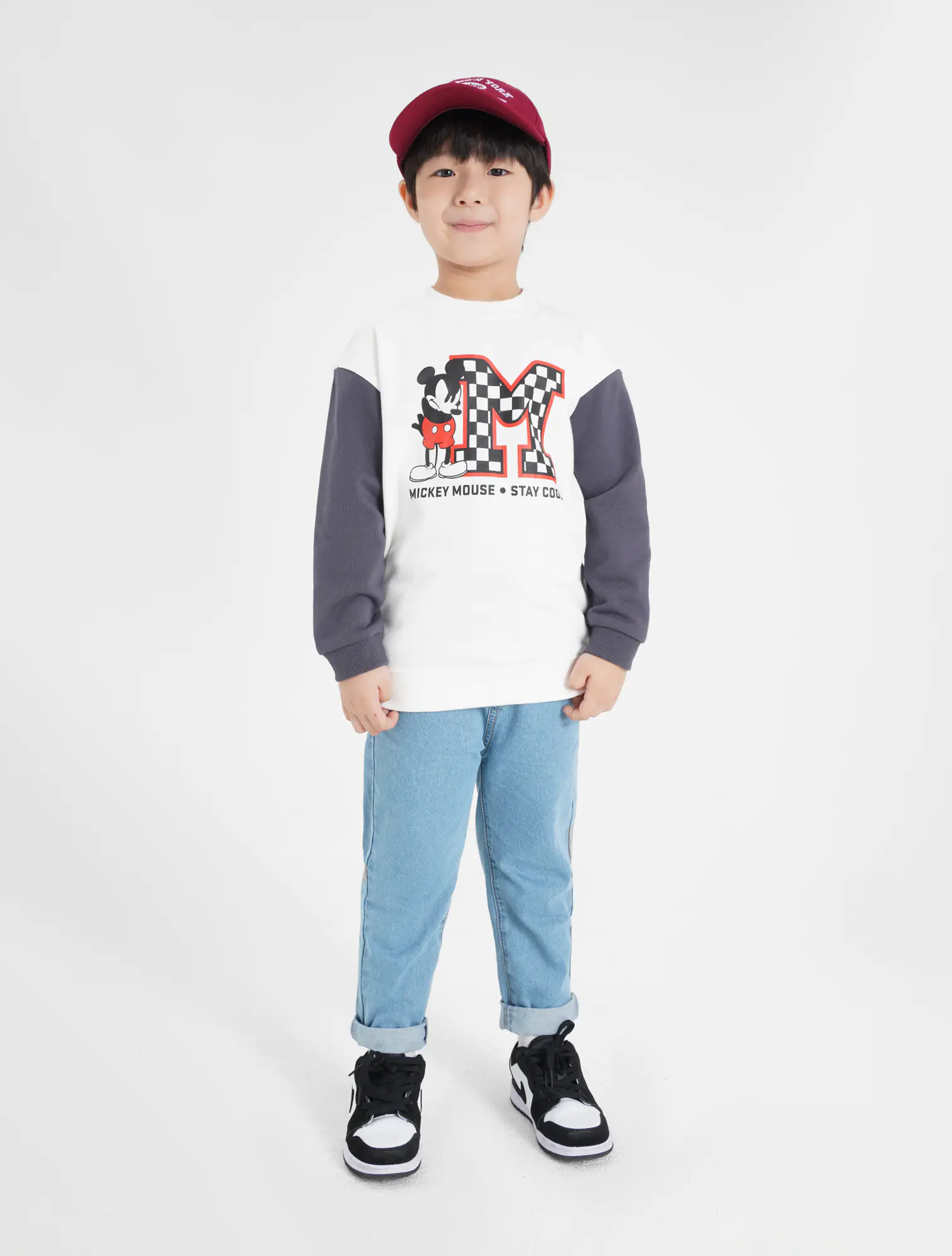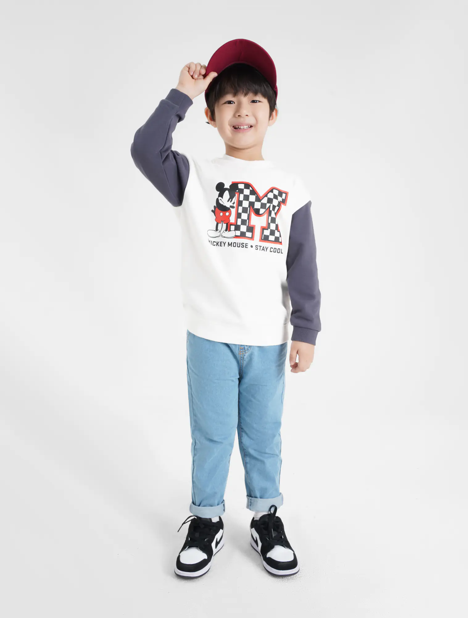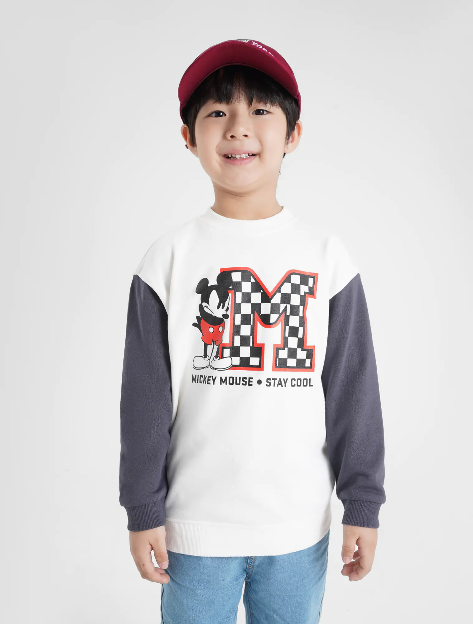 Áo nỉ in hình mickey mix màu tay áo, chất liệu vảy cá ấm áp, hình in ngộ nghĩnh đúng sở thích của các bé.