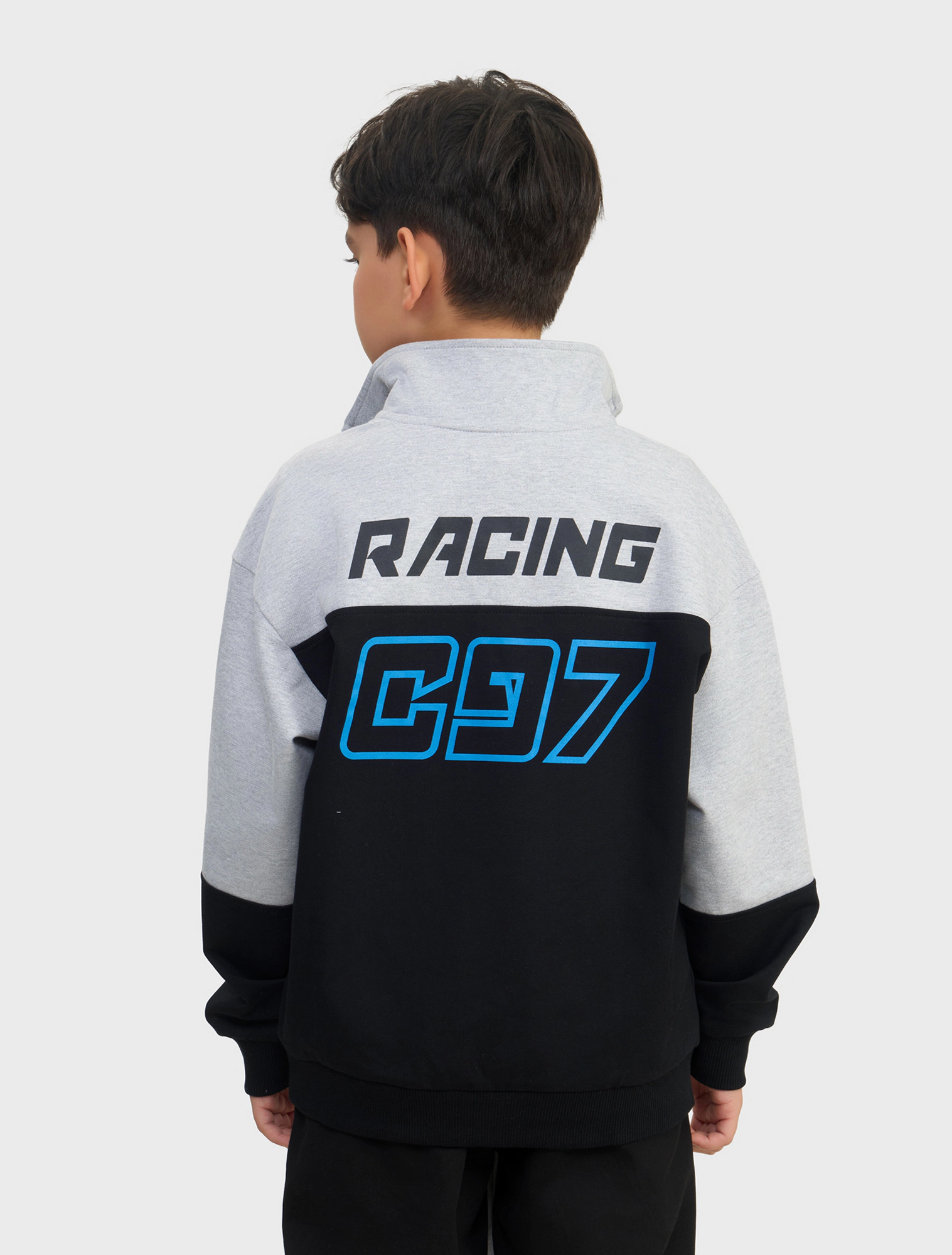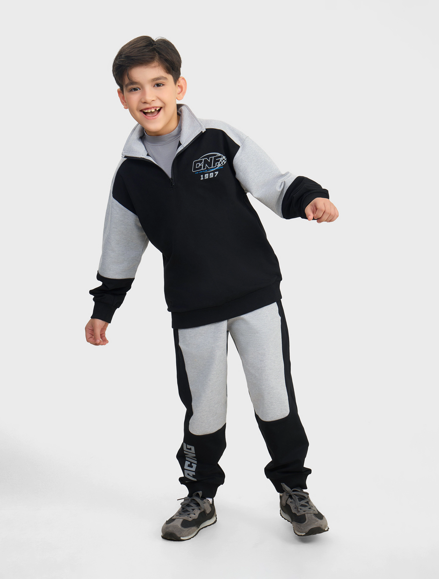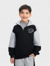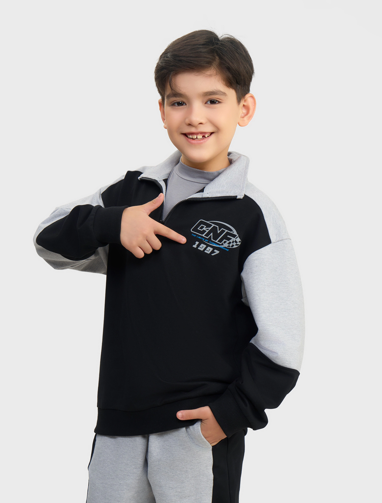 Áo nỉ bé trai can phối mix màu, nguyên liệu vảy cá, phom dáng relax thoải mái, hình in sport khỏe khoắn tạo sự năng động cho các bé.
