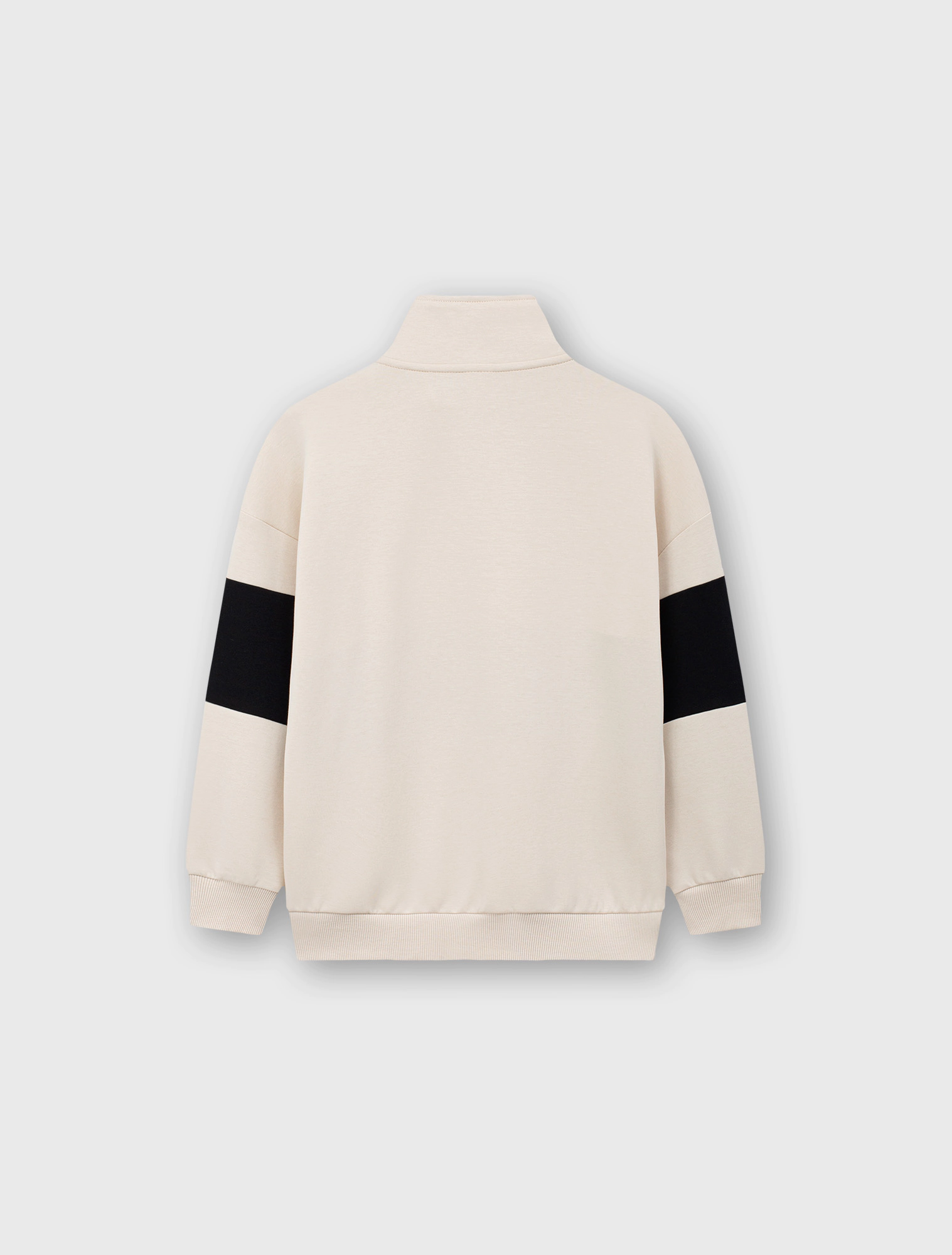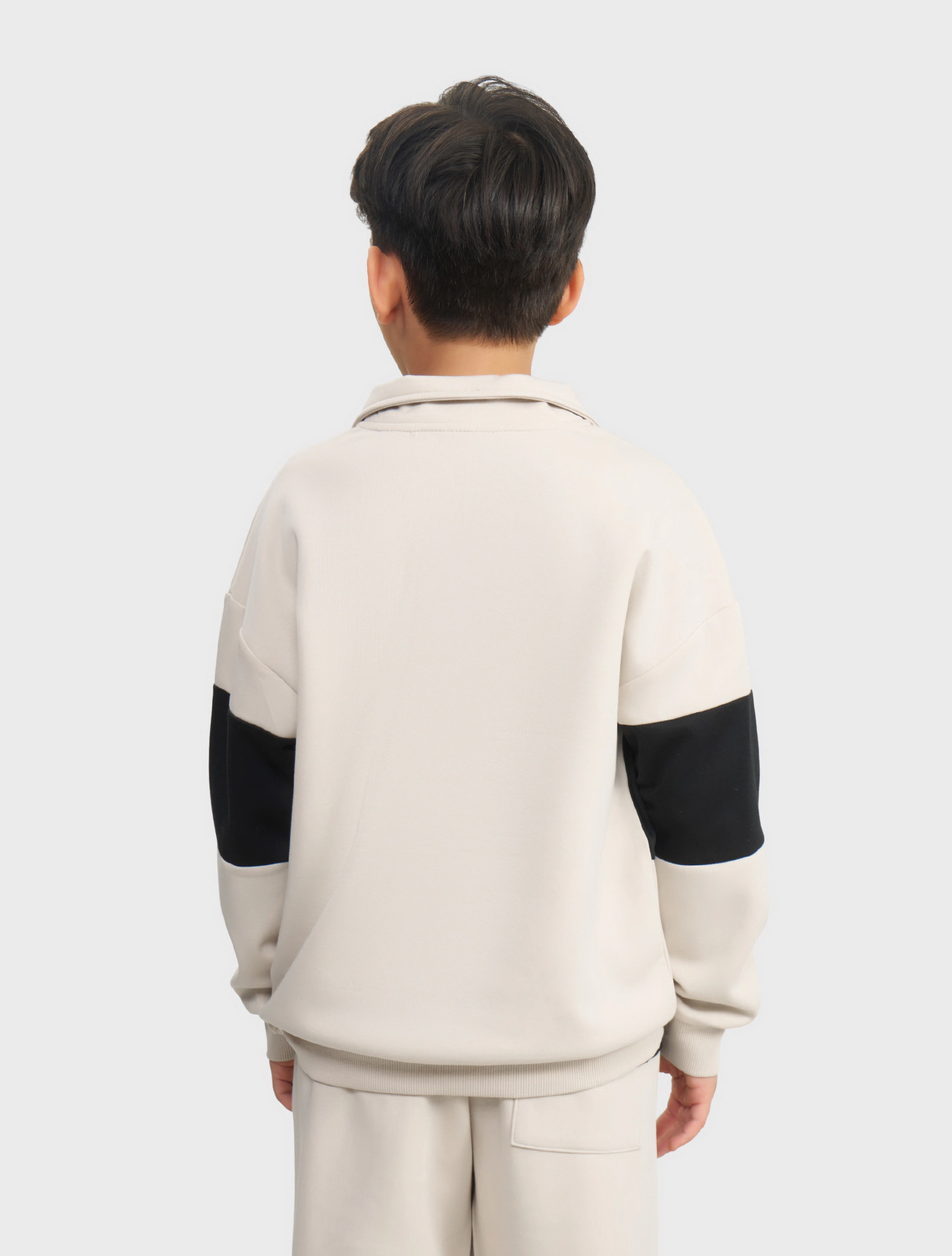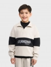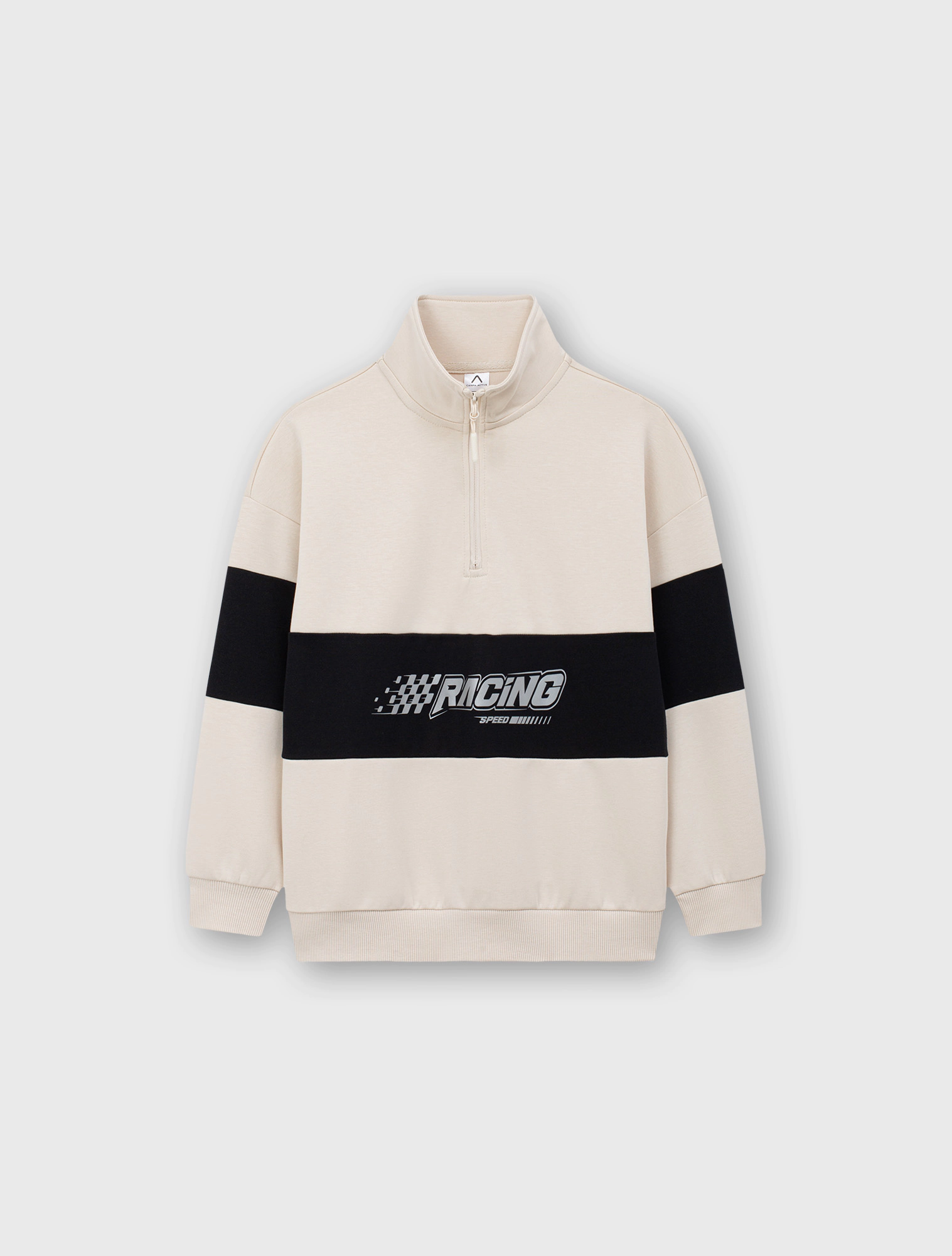 Áo nỉ interlock bé trai cổ kéo khóa. Thân trước và tay phối màu, có hình in. Gấu áo, gấu tay bo.