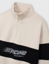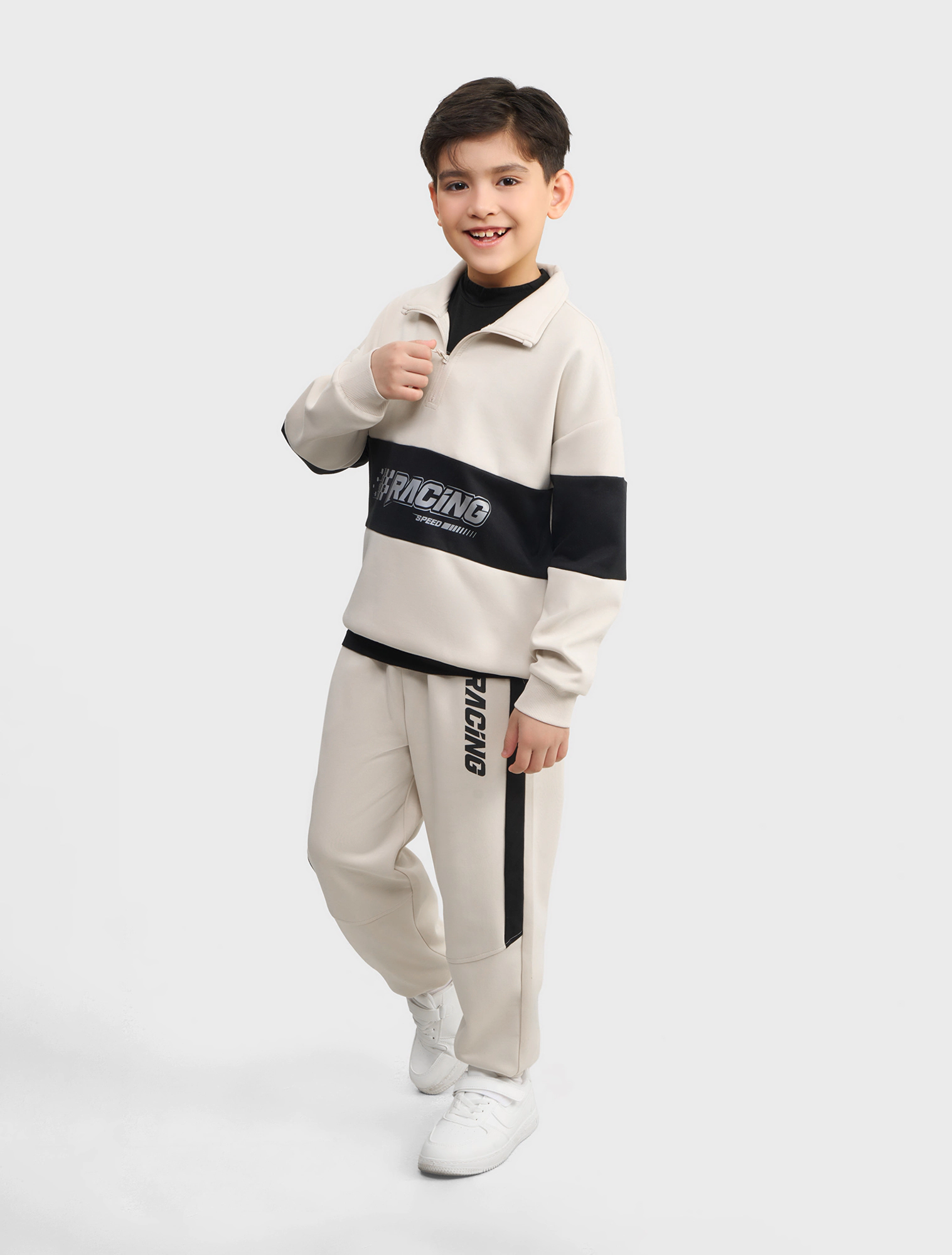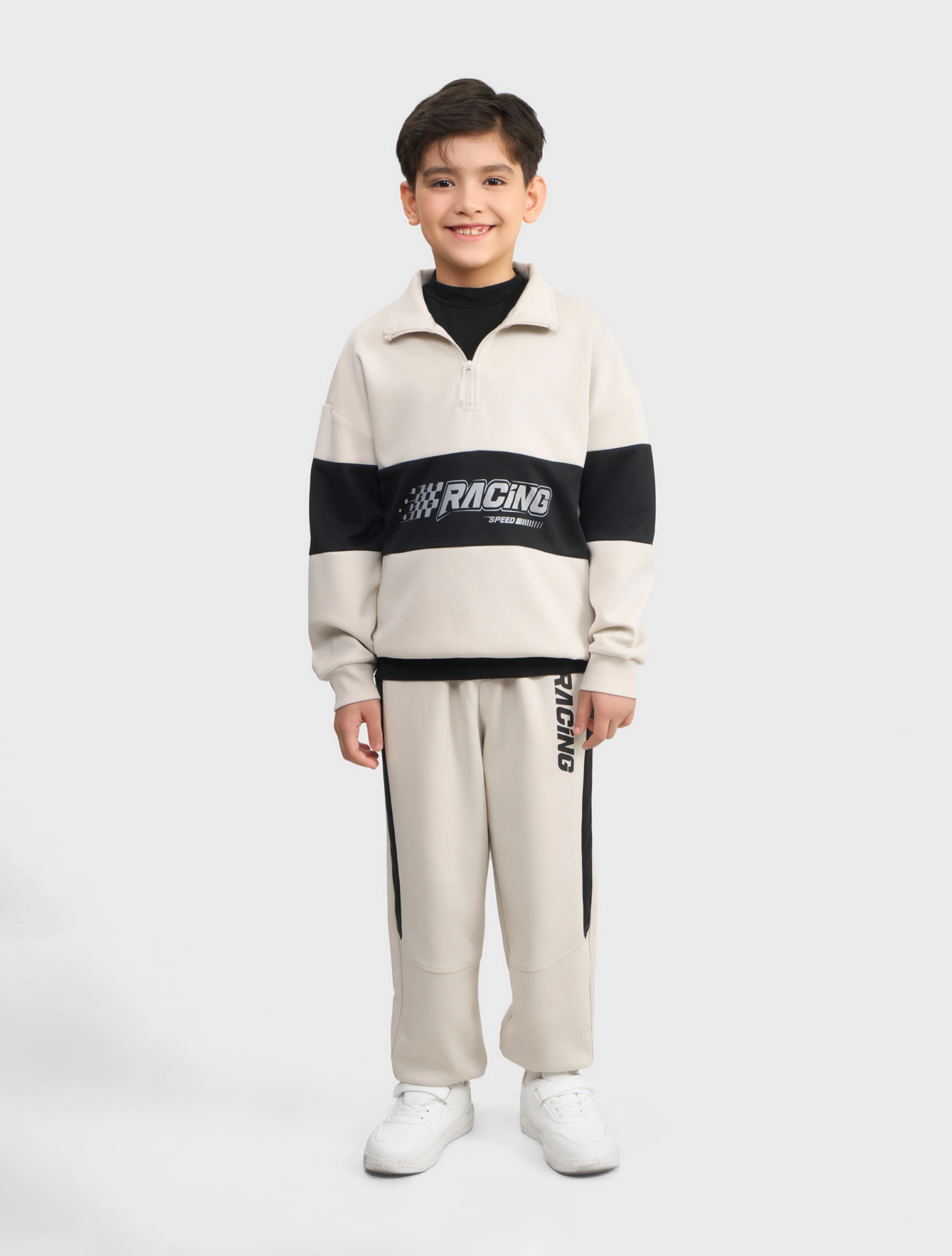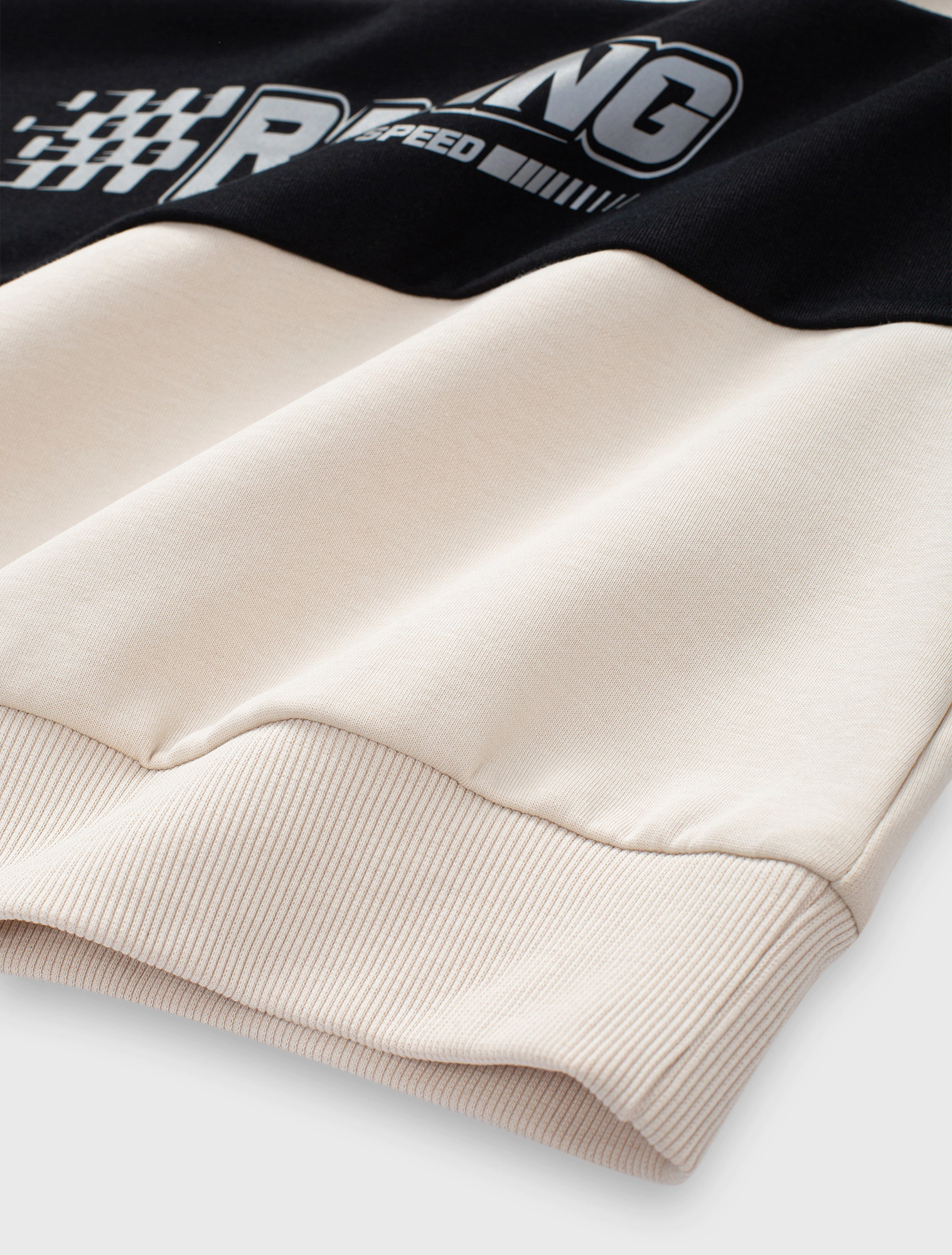 Áo nỉ interlock bé trai cổ kéo khóa. Thân trước và tay phối màu, có hình in. Gấu áo, gấu tay bo.