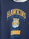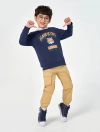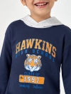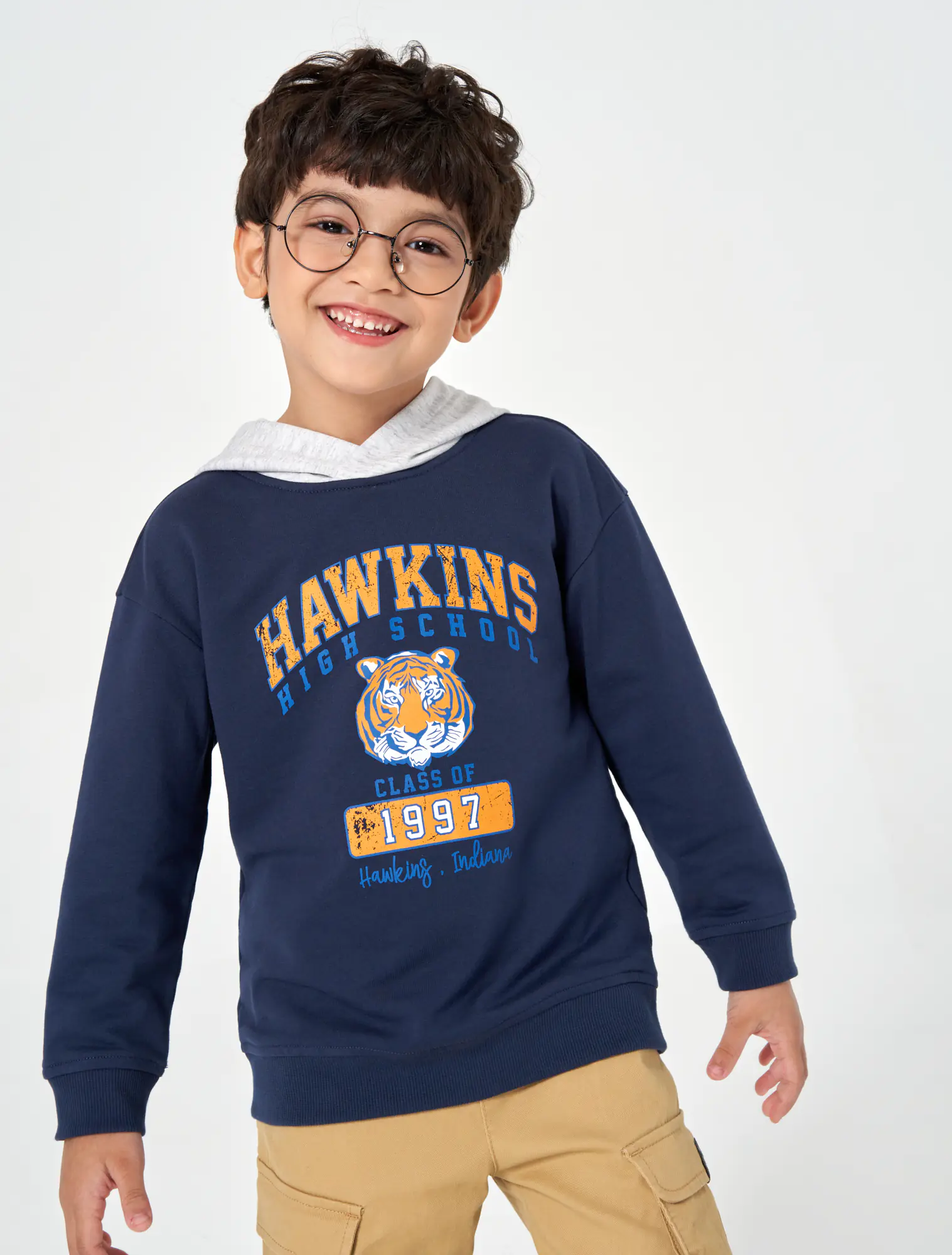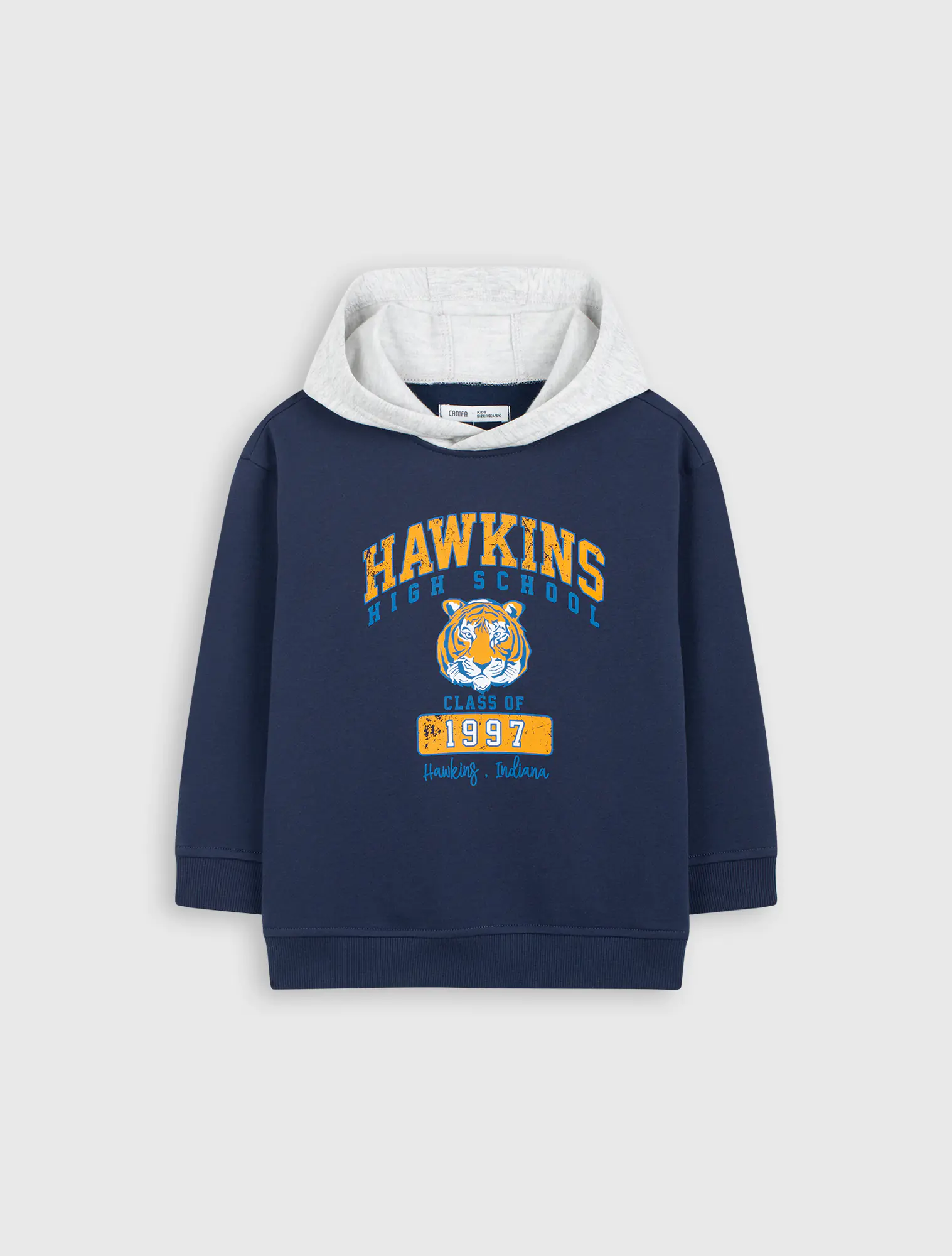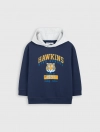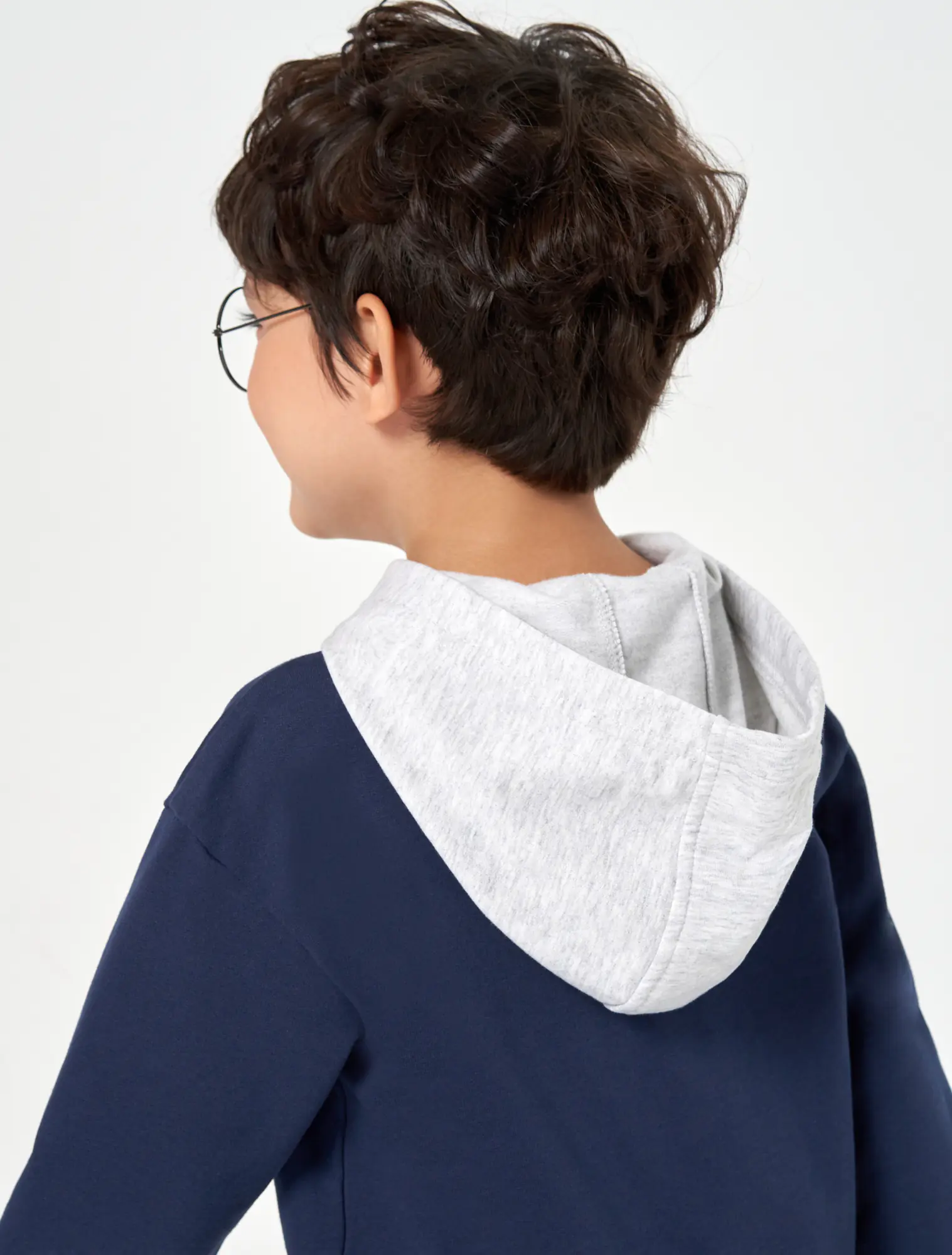 Áo nỉ chất liệu cotton pha, phối mũ khác màu, gấu tay gấu thân tra bo.