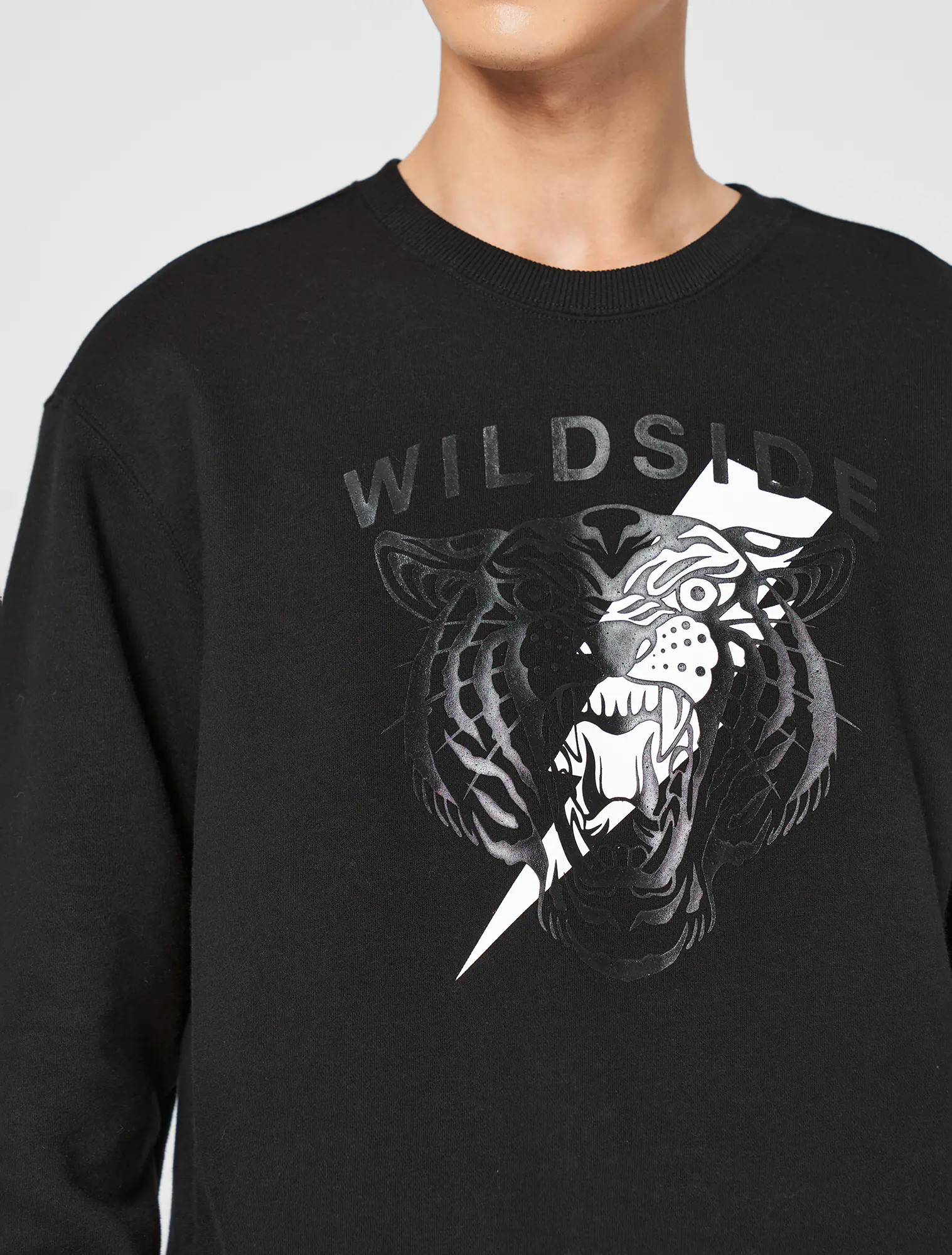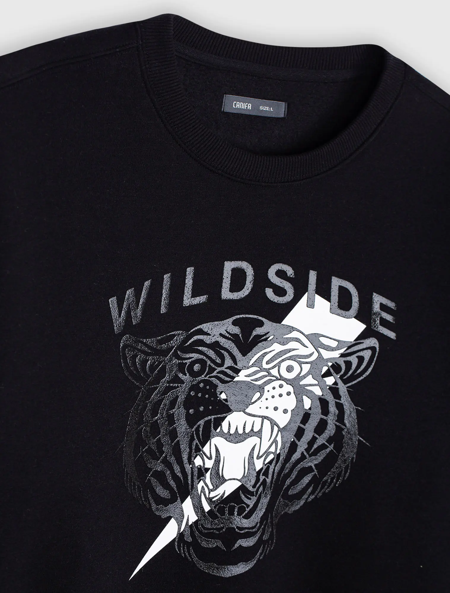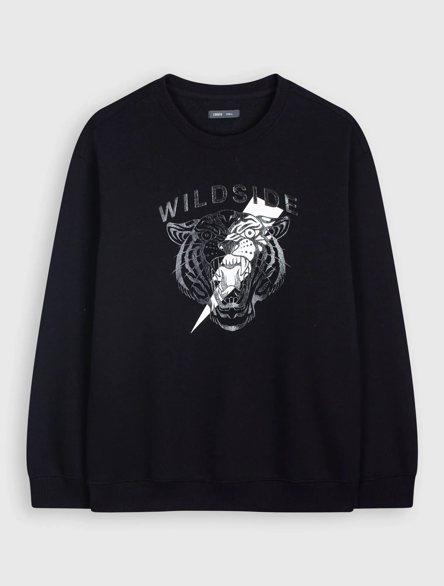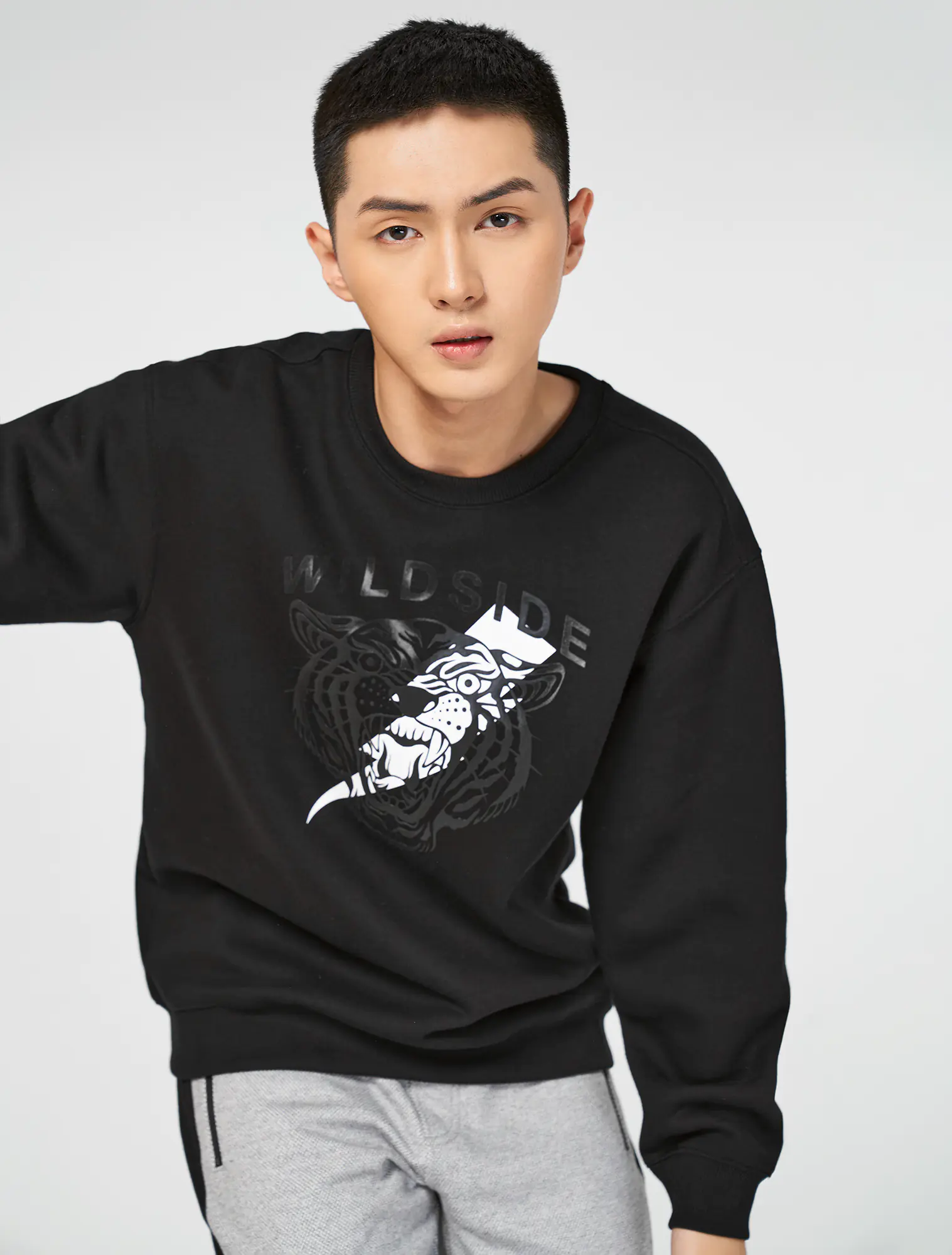 Áo nỉ chất liệu cào bông họa tiết in hình hổ, dáng regular, cổ tròn, tay dài.