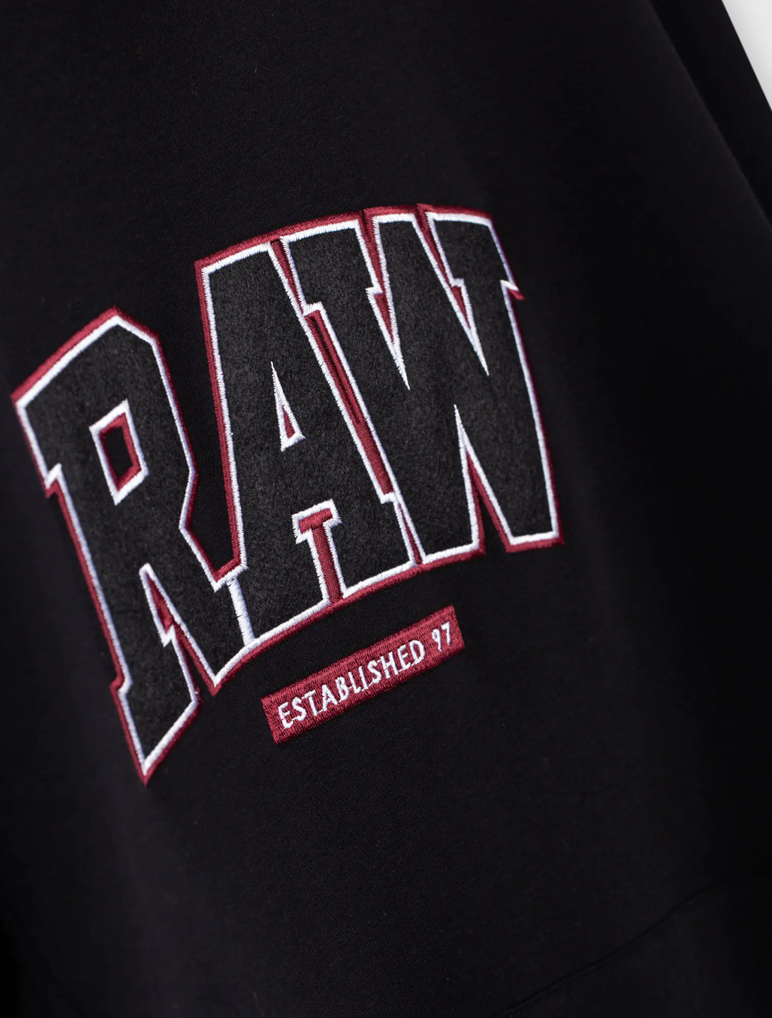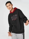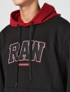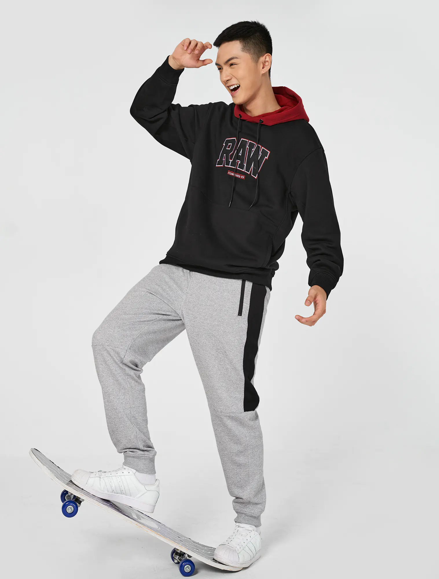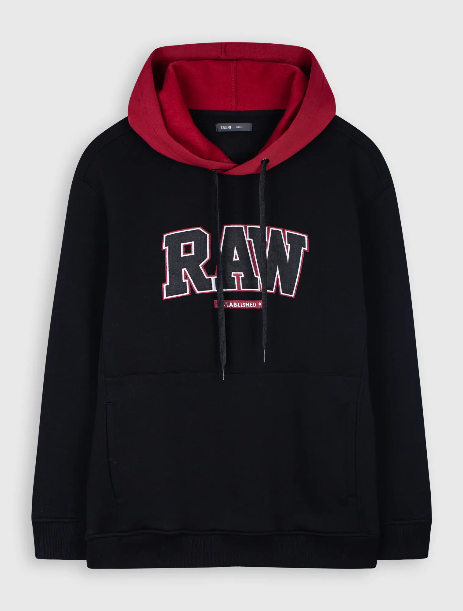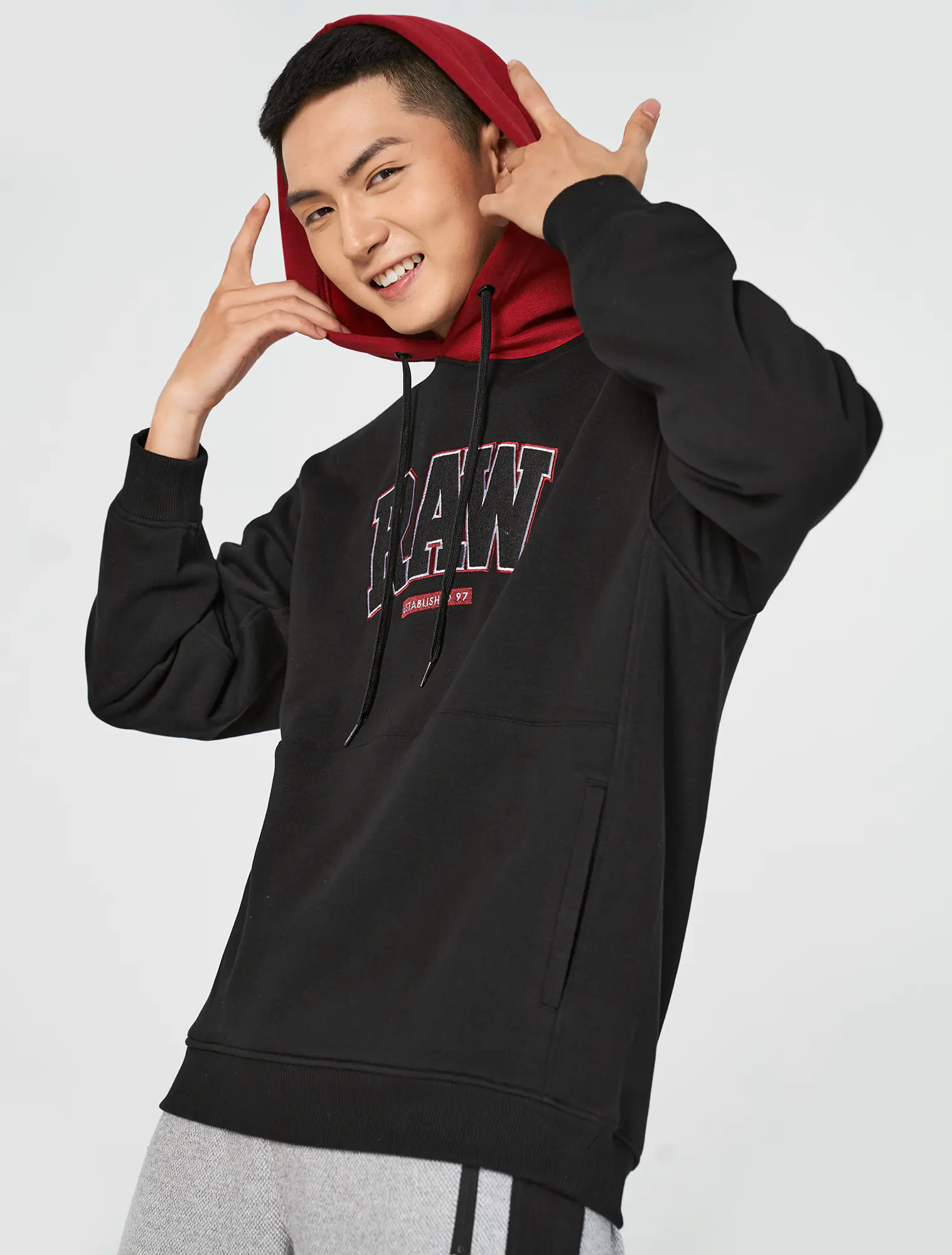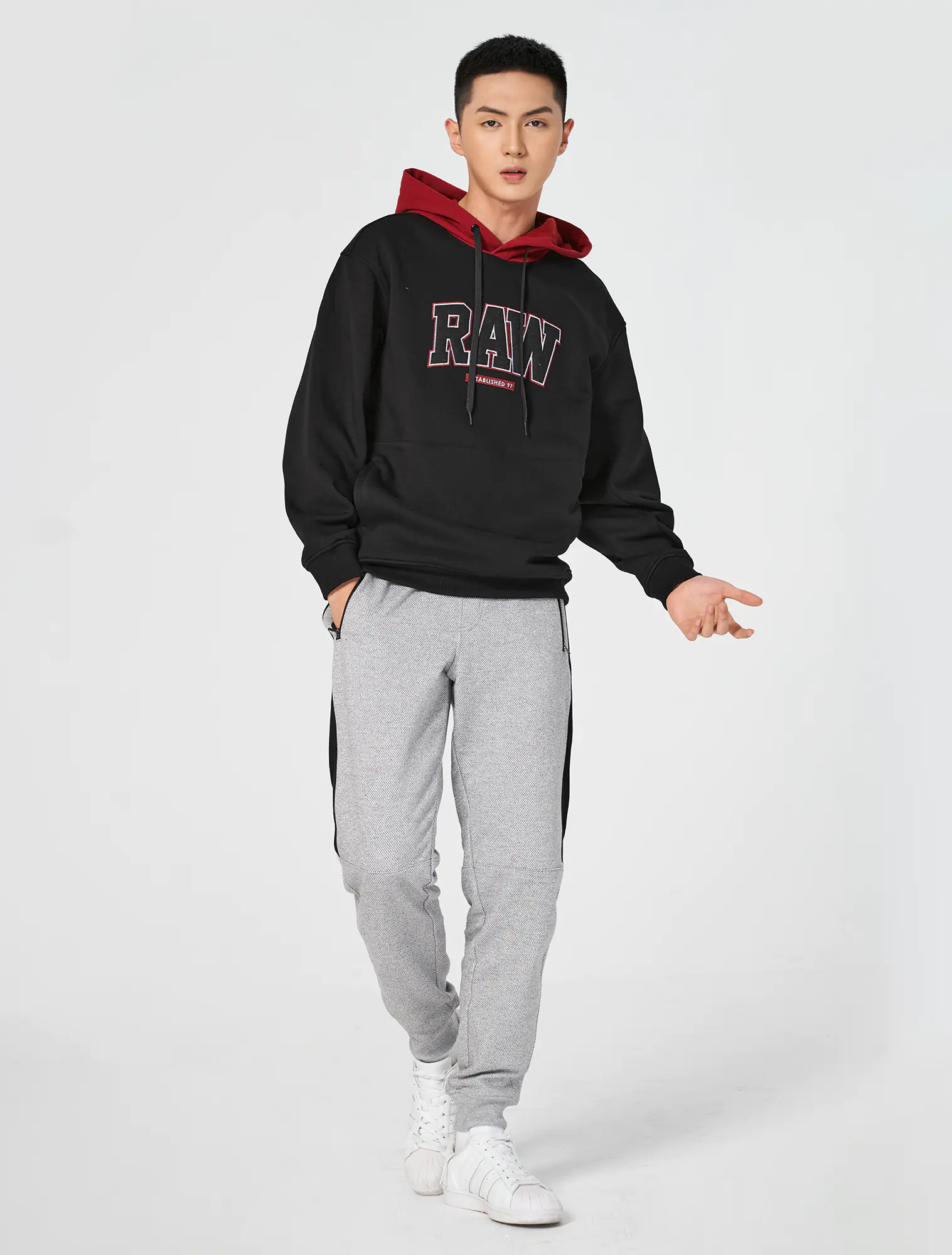 Áo nỉ chất liệu vảy cá có mũ có can phối thân trước túi, mũ phối lệch màu.