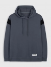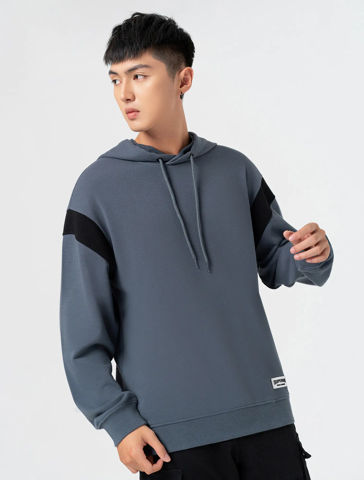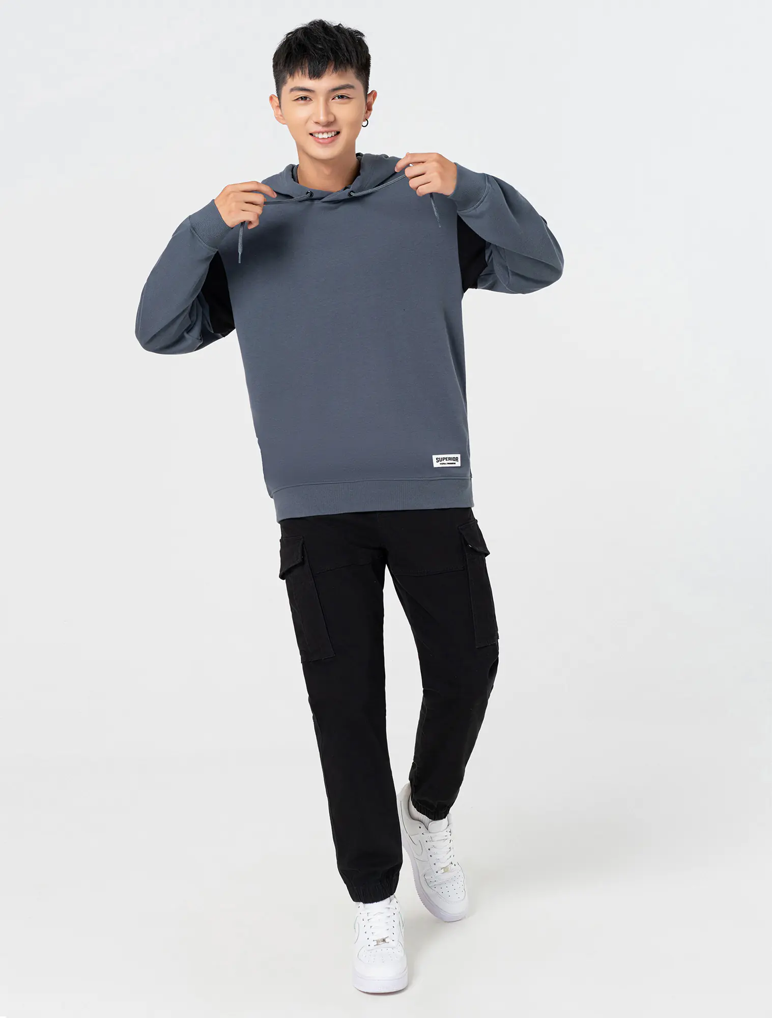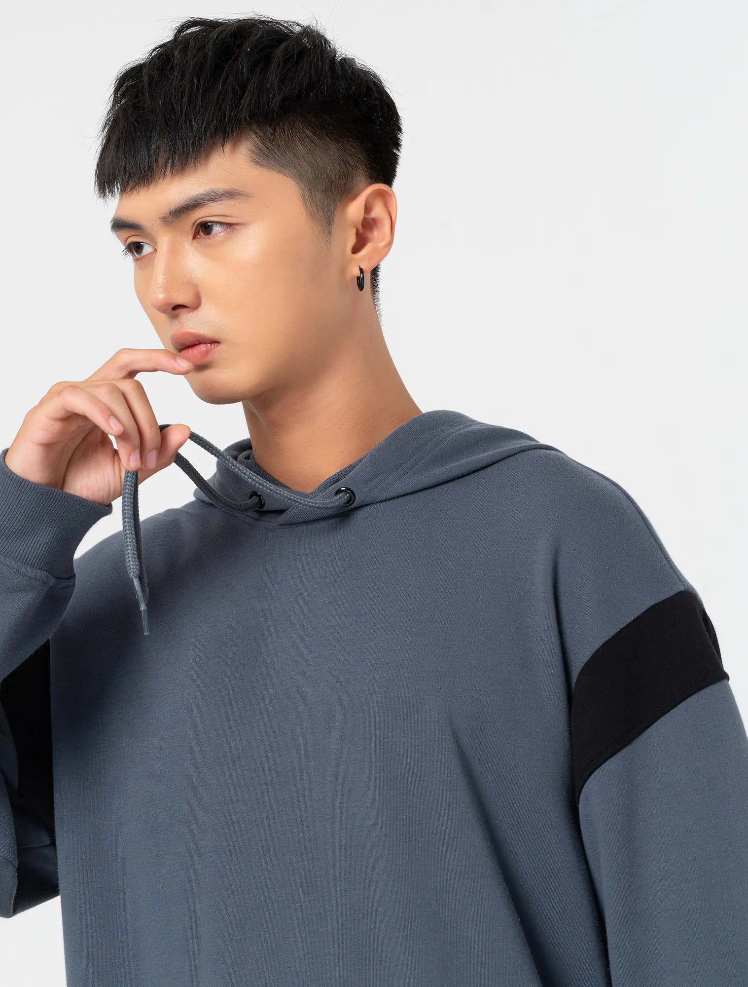 Áo nỉ chất liệu cotton pha, có mũ luồn dây dệt, tra bo gấu tay và gấu thân, mix màu trang trí 2 bên tay, phom relax.