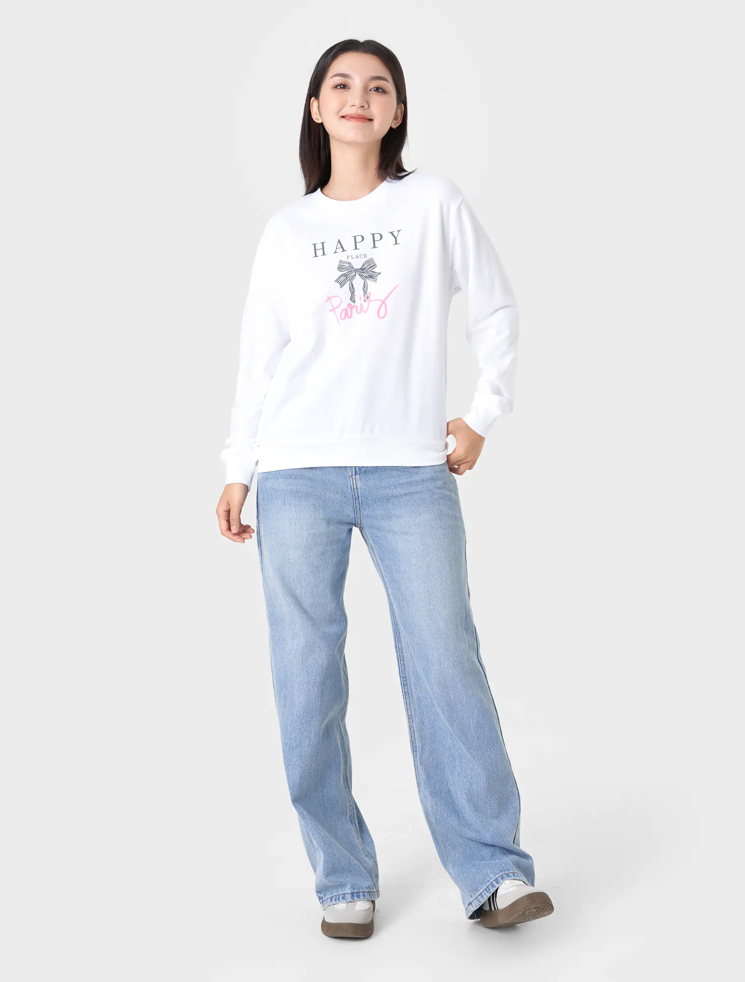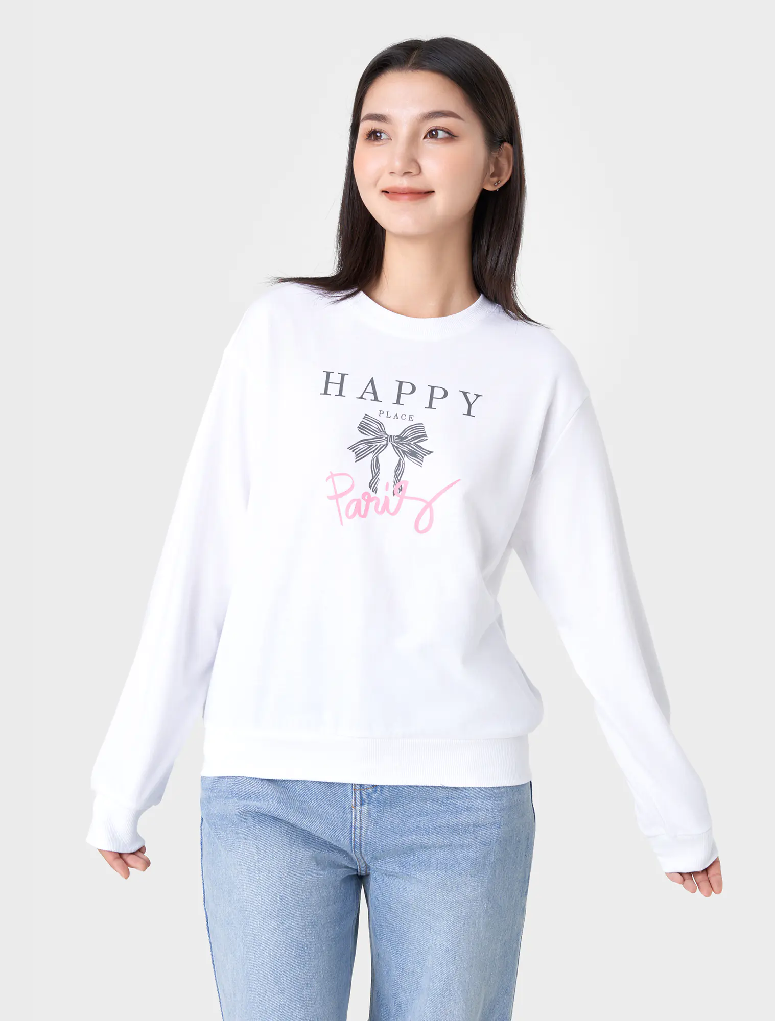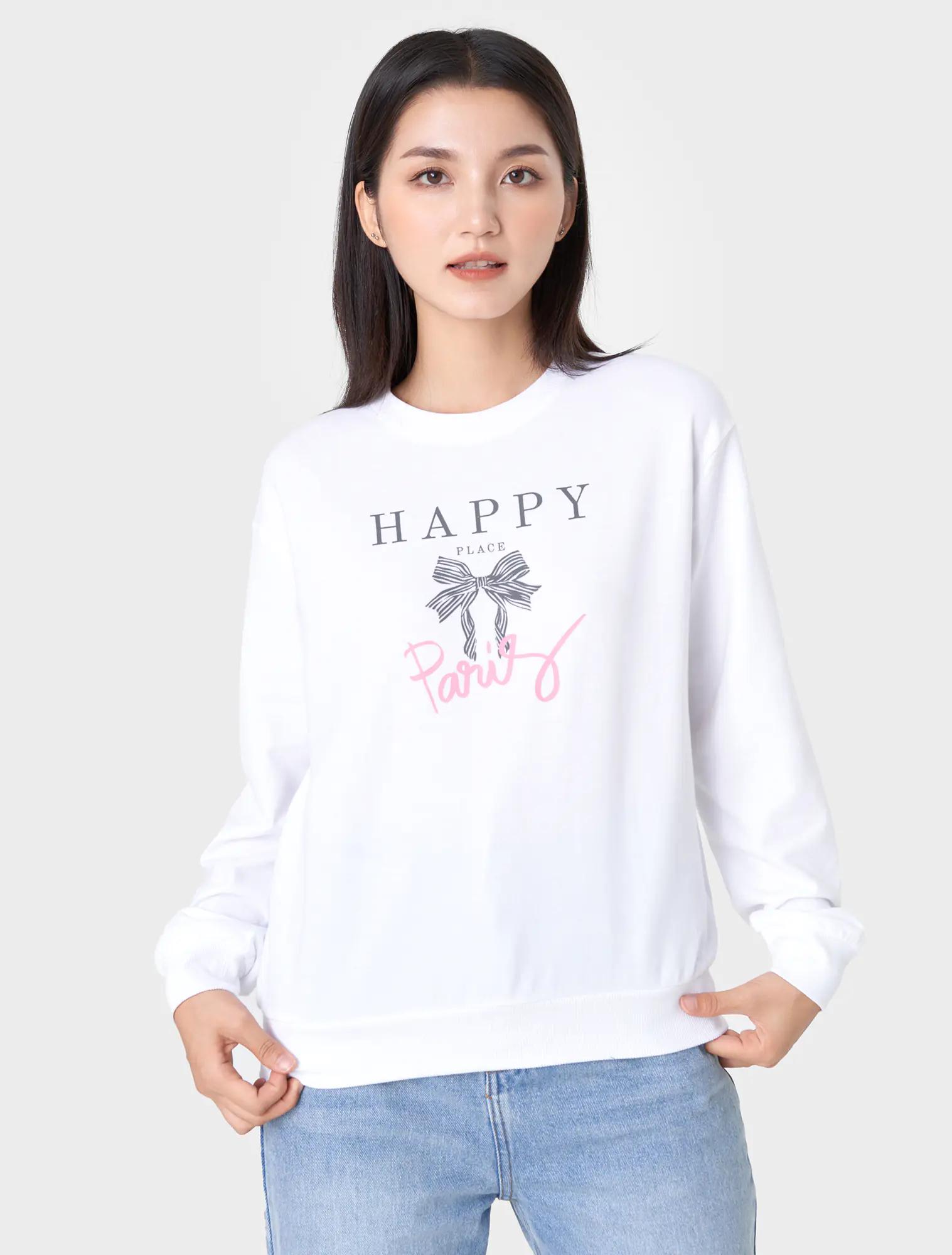 Áo nỉ dáng basic cổ tròn, thiết kế bo gấu tạo sự thoải mái khi mặc, kết hợp với các chi tiết đồ họa đơn giản tạo điểm nhấn cho sản phẩm.