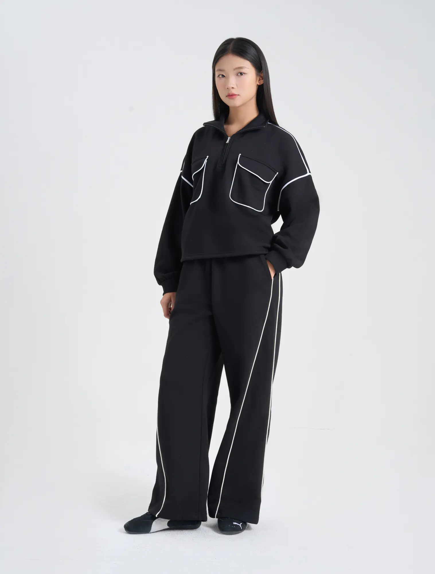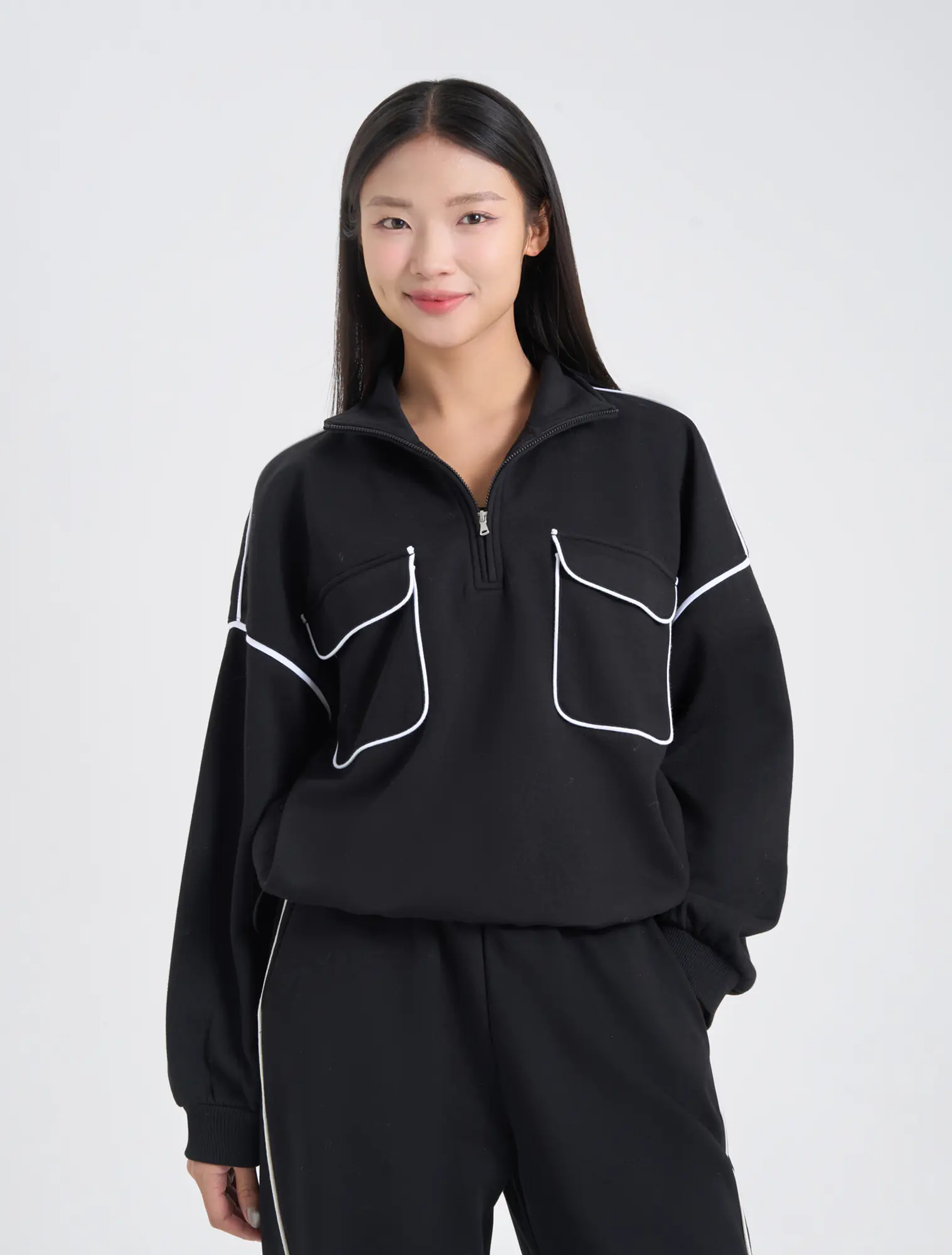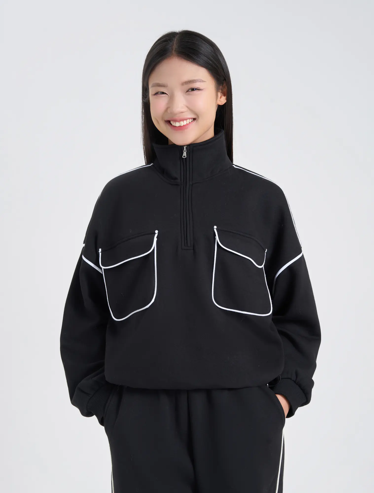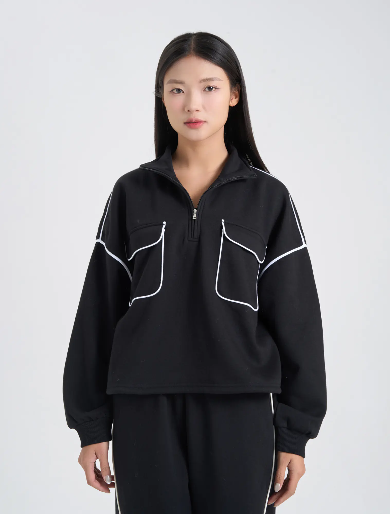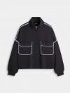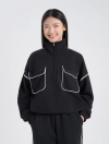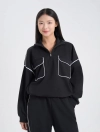 Áo nỉ nữ dáng rộng với chi tiết thiết kế cổ kéo khóa linh hoạt và túi ốp 2 bên ngực với điểm nhấn lé phối màu tạo sự tinh tế và thời trang cho sản phẩm.