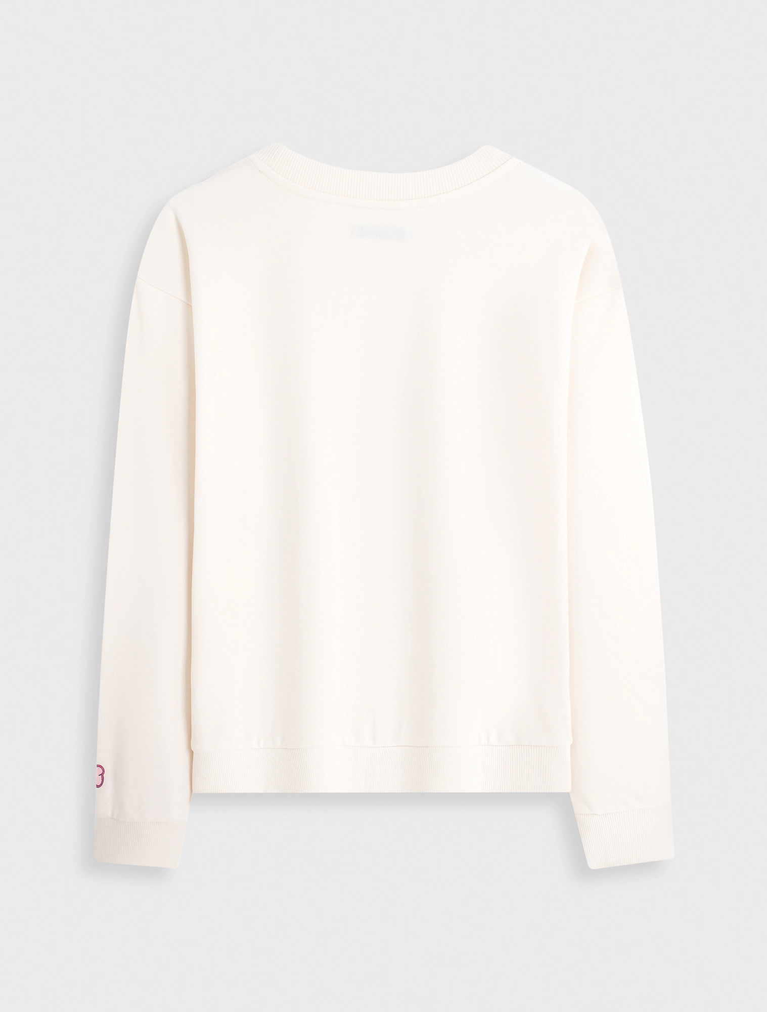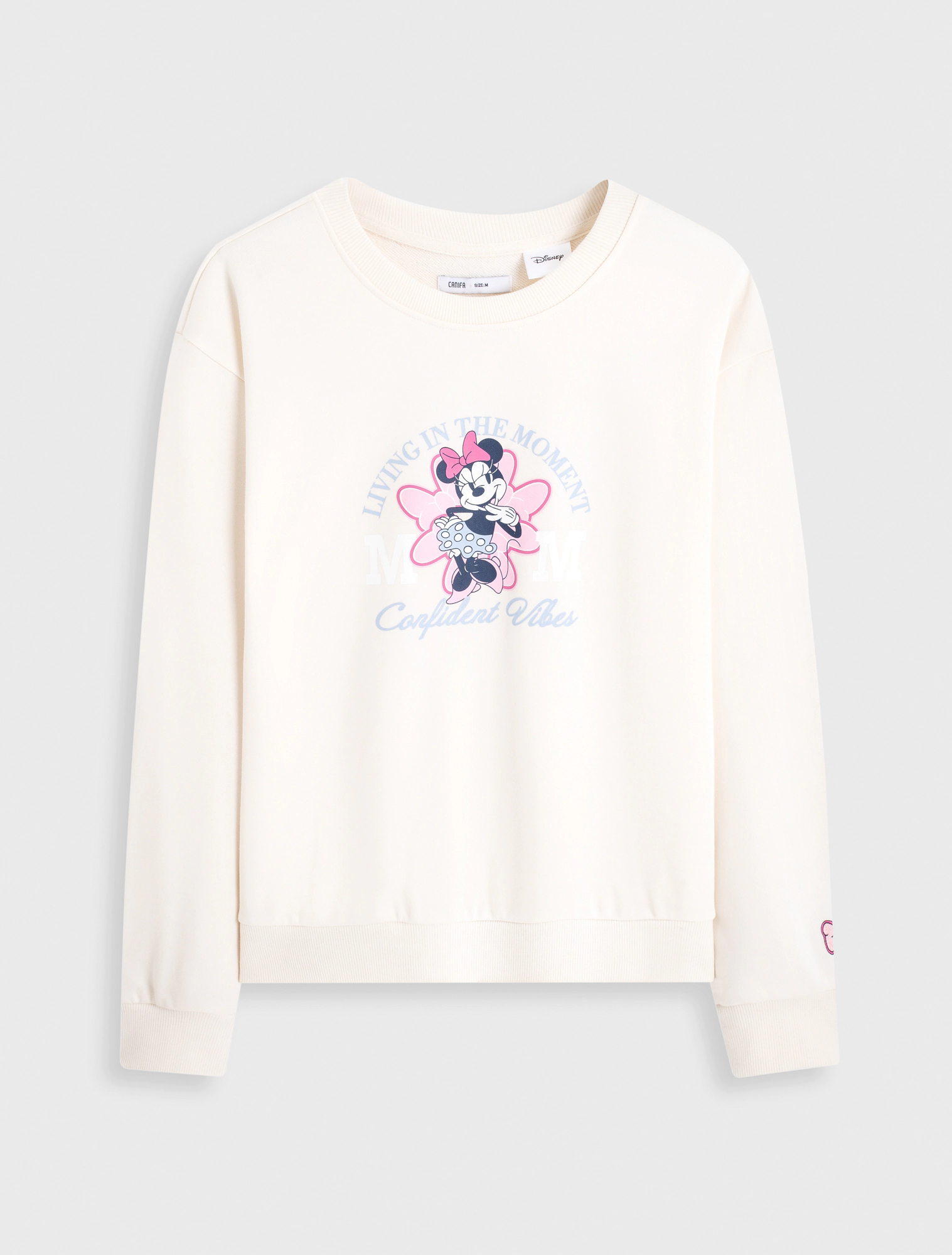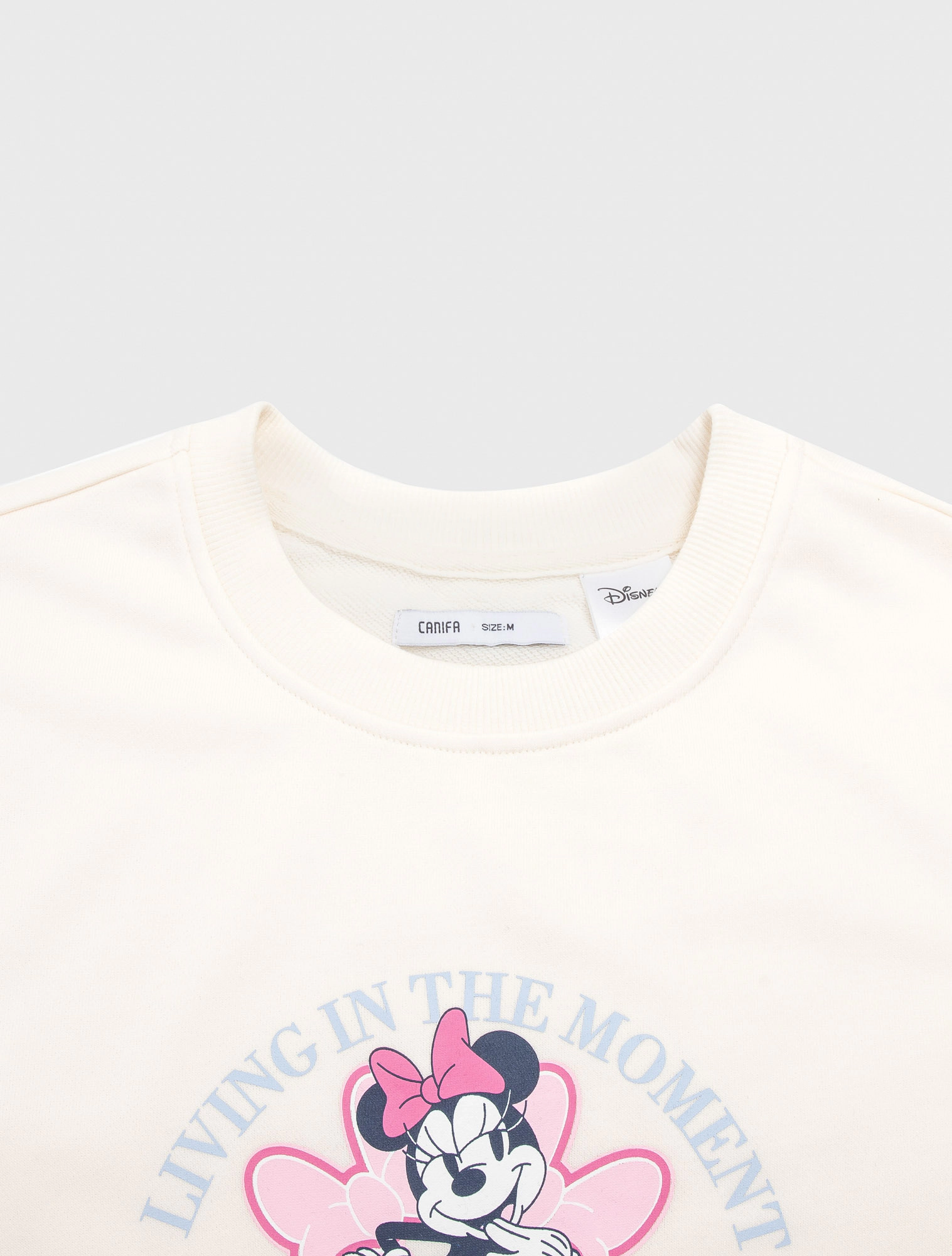 Áo nỉ nữ hình in Mickey, phom dáng rộng thoải mái.