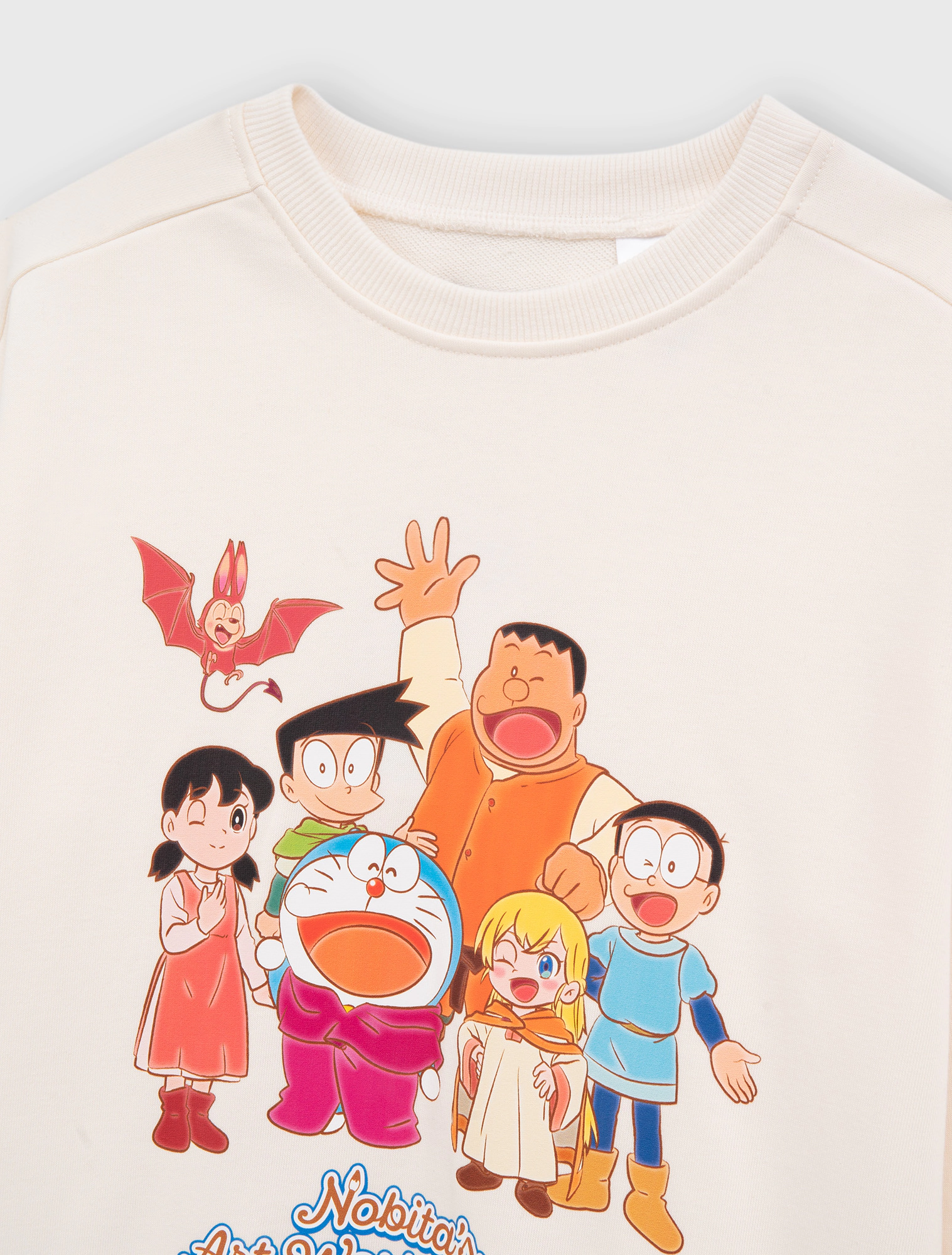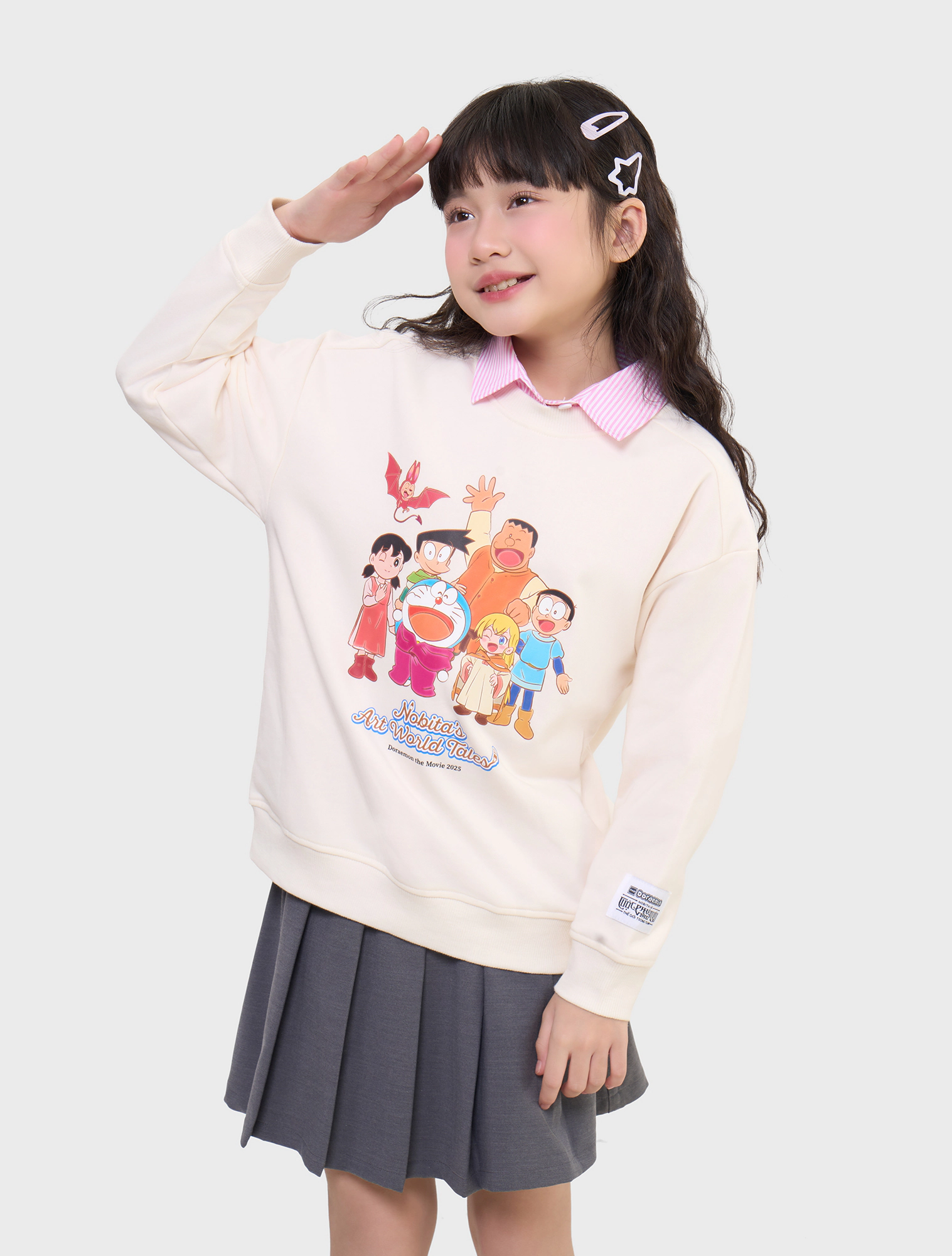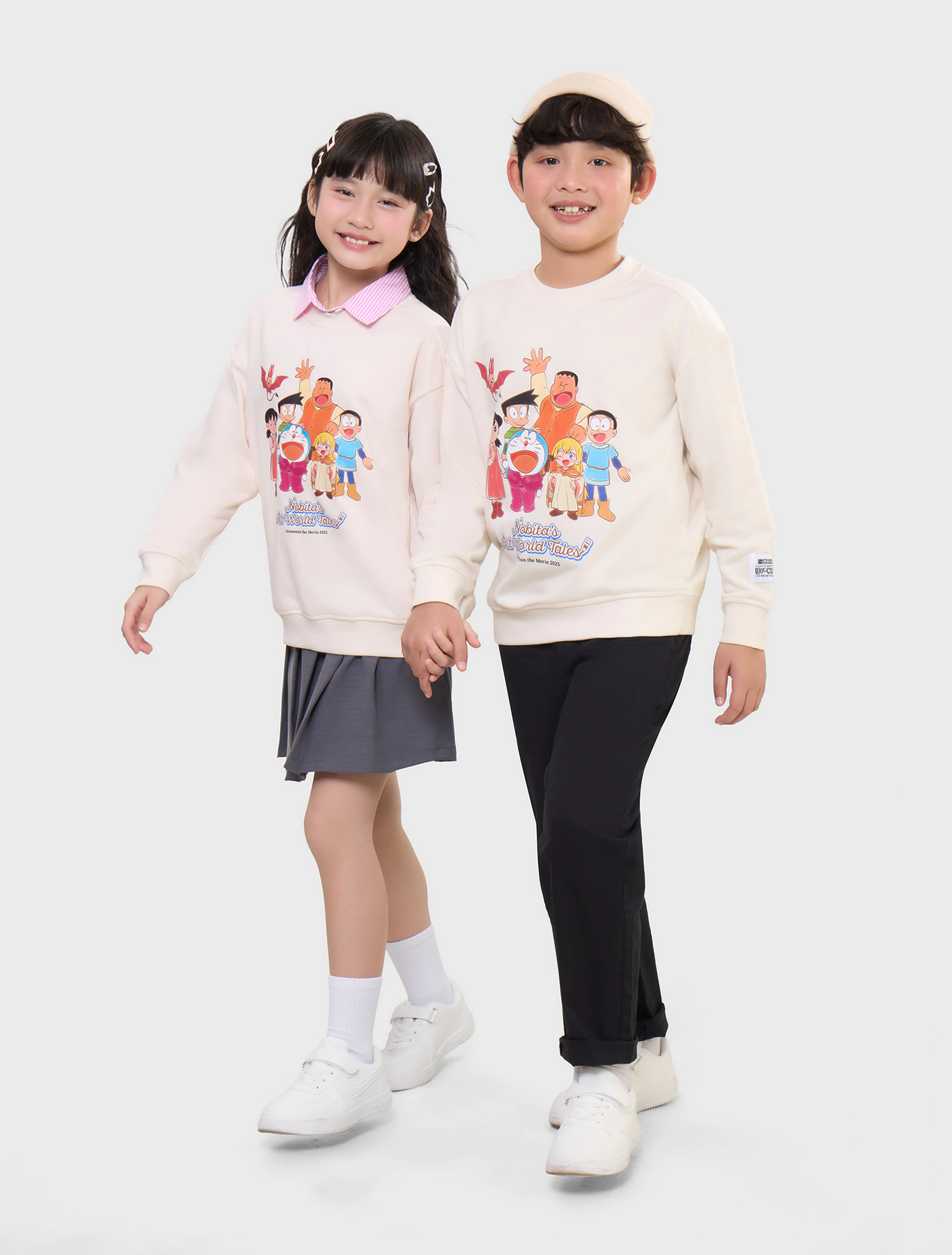 Áo nỉ vòng lông unisex trẻ em. Phom dáng cơ bản dễ mặc. Màu sắc trung tính phù hợp cả bé trai và bé gái. HÌnh in Doraemon hiện đại, dễ thương, tay áo có may mác trang trí. Chất liệu Cotton pha mềm mại giữ ấm tốt.