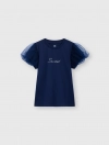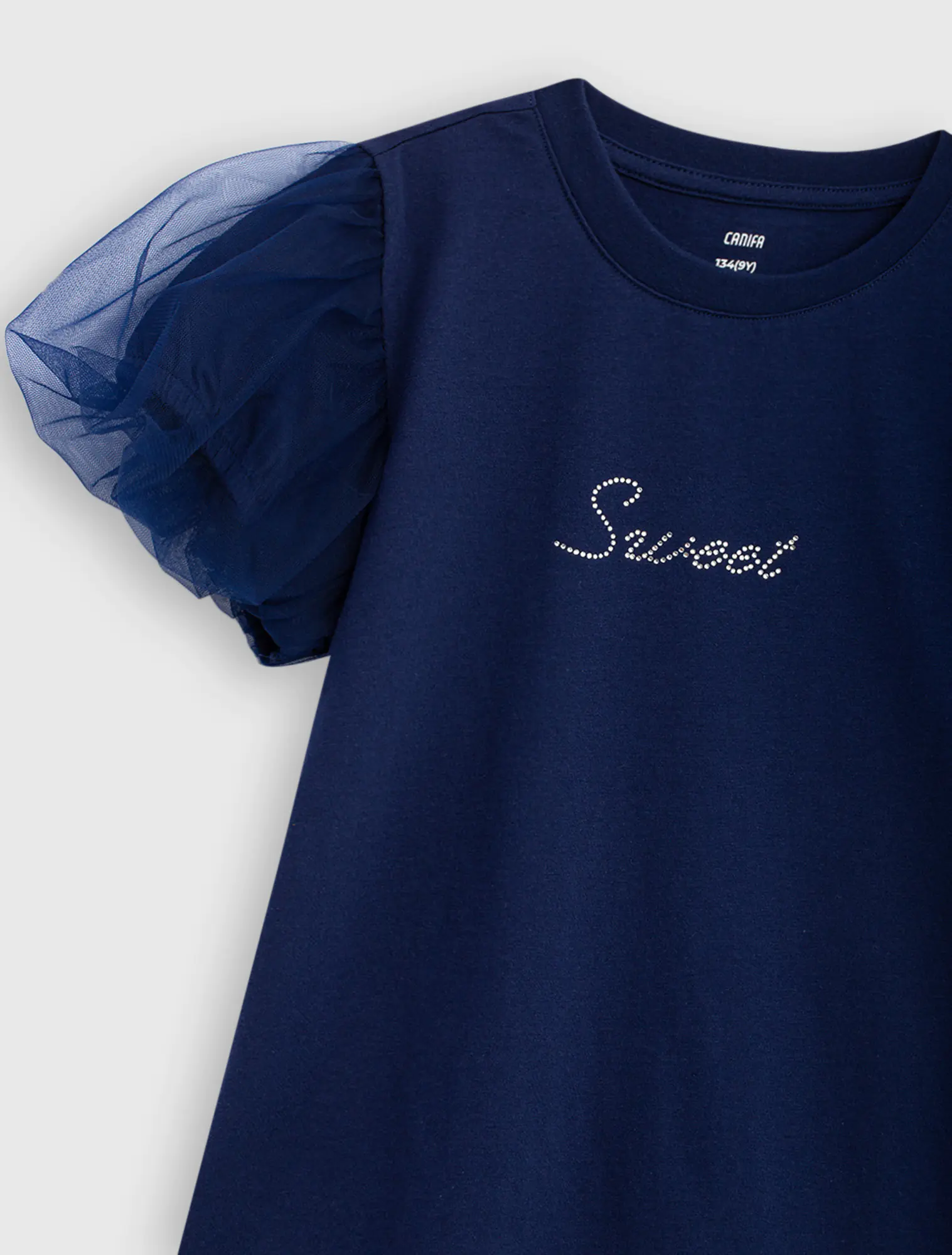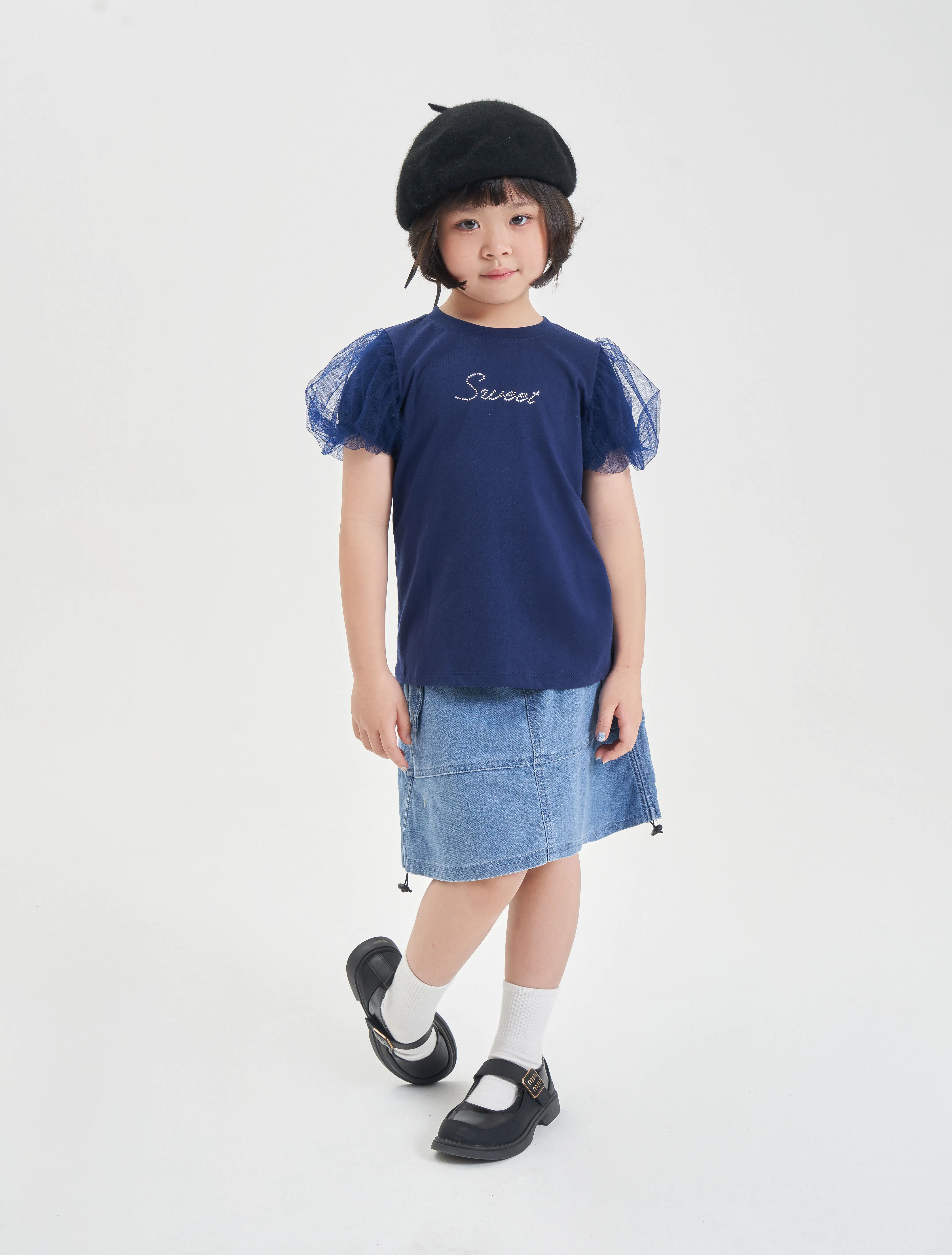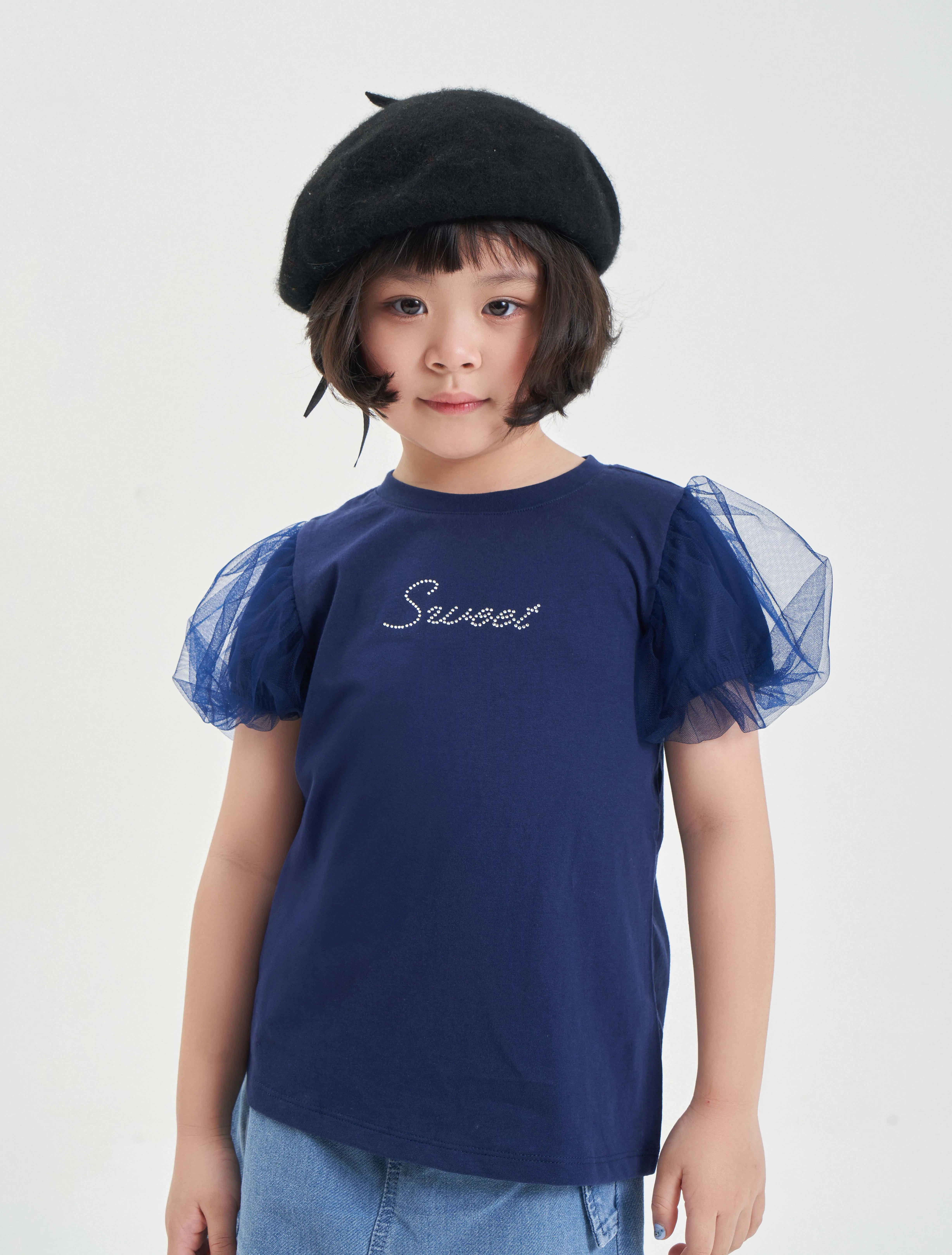 Áo phông bé gái tay phối lưới phần tay áo tạo sự nữ tính, phù hợp phối với nhiều loại trang phục cho bé gái.
