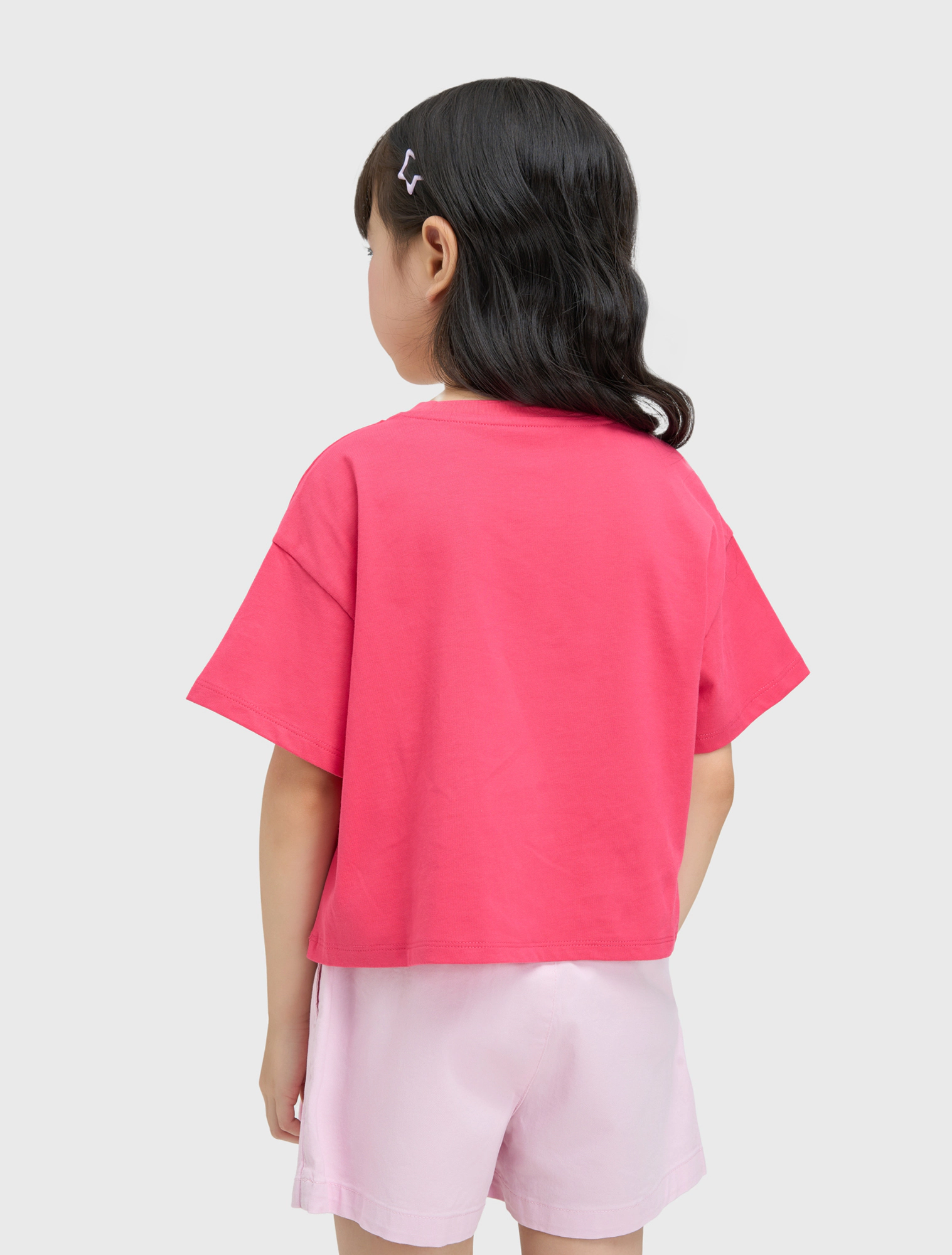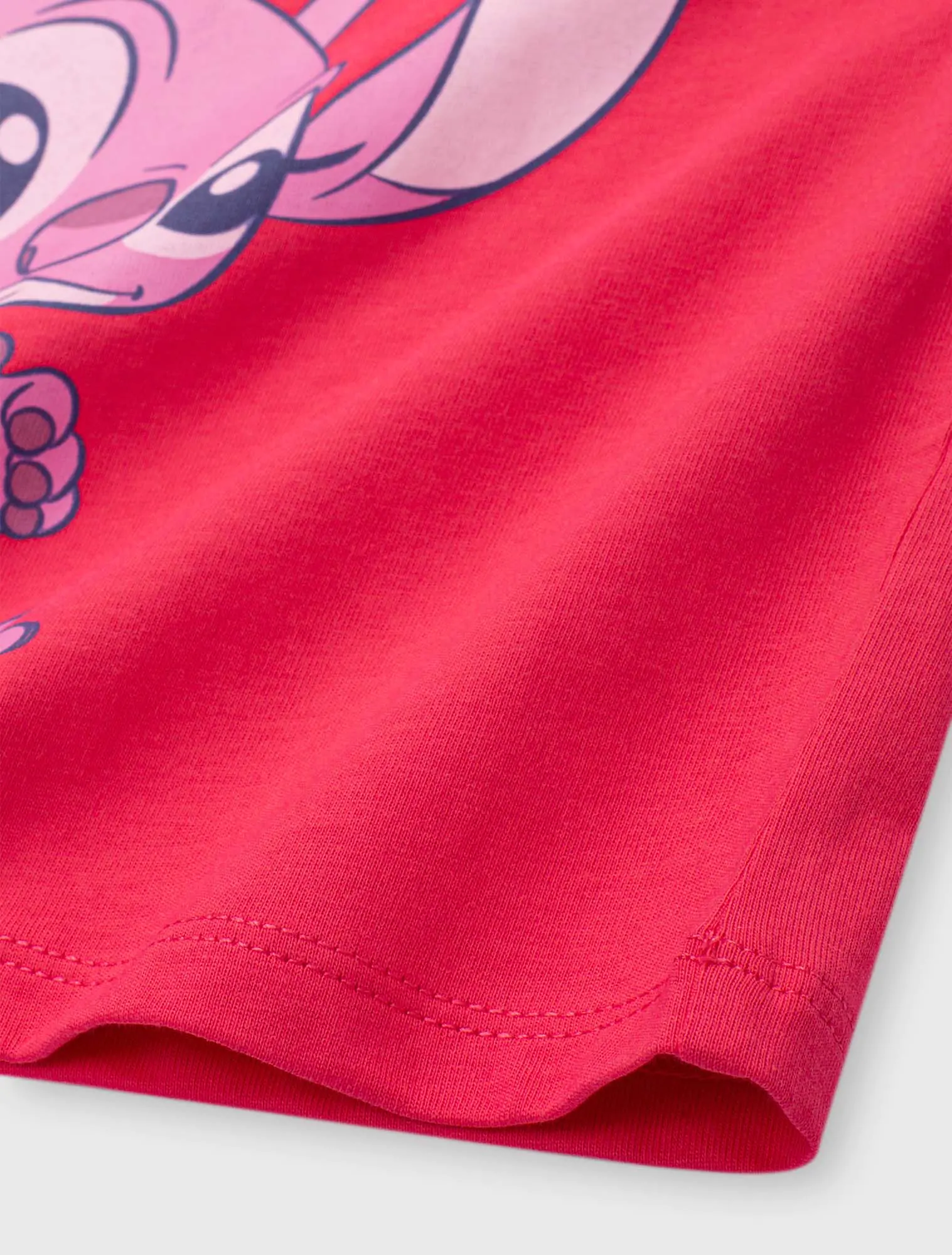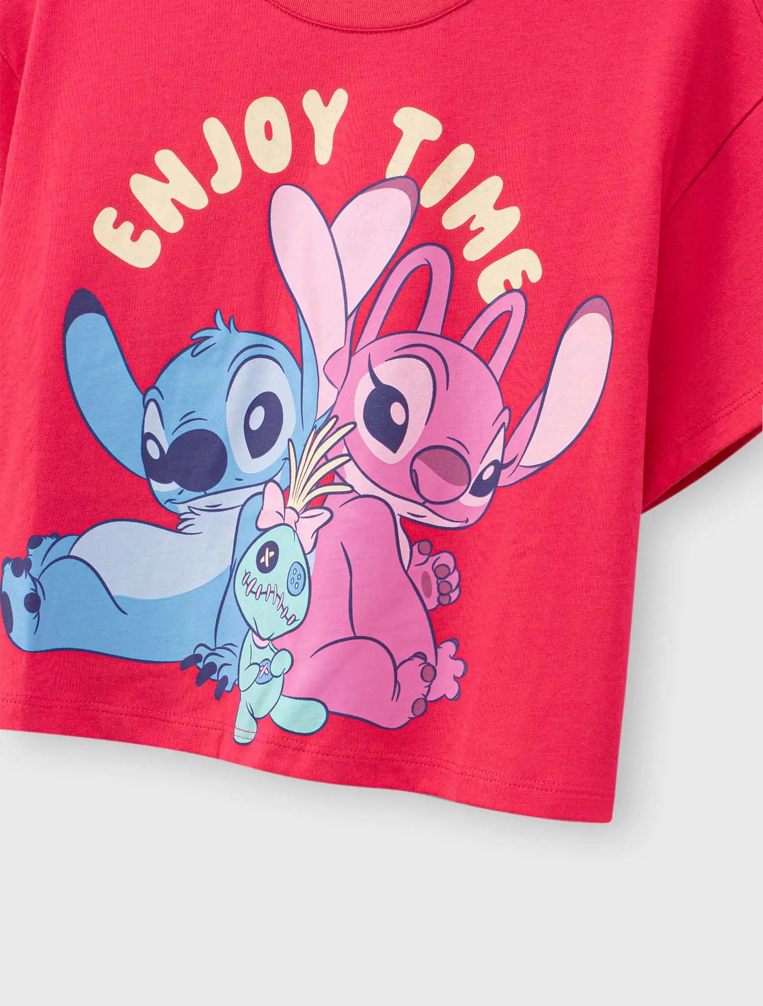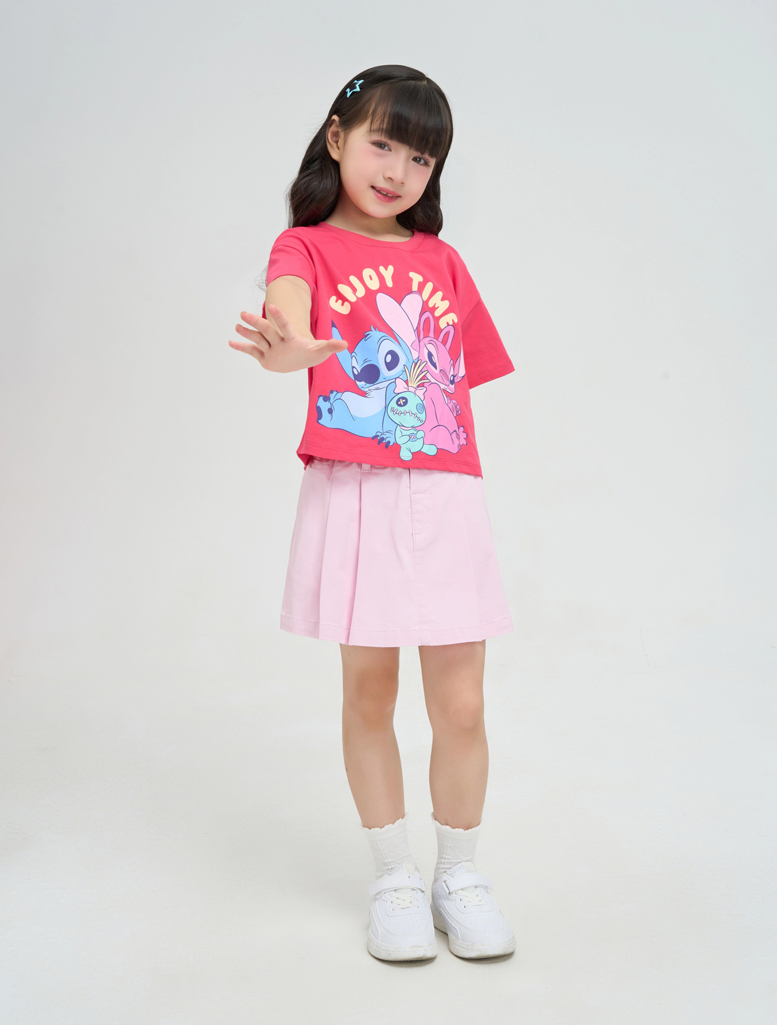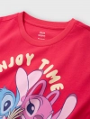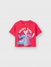 Áo thun cộc tay bé gái in hình Stitch, phom dáng crop vừa phải tạo sự khỏe khoắn cá tính cho các bé, hình in nhân vật đáng yêu, chất liệu cotton thoáng mát phù hợp cho thời tiết mùa hè.